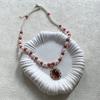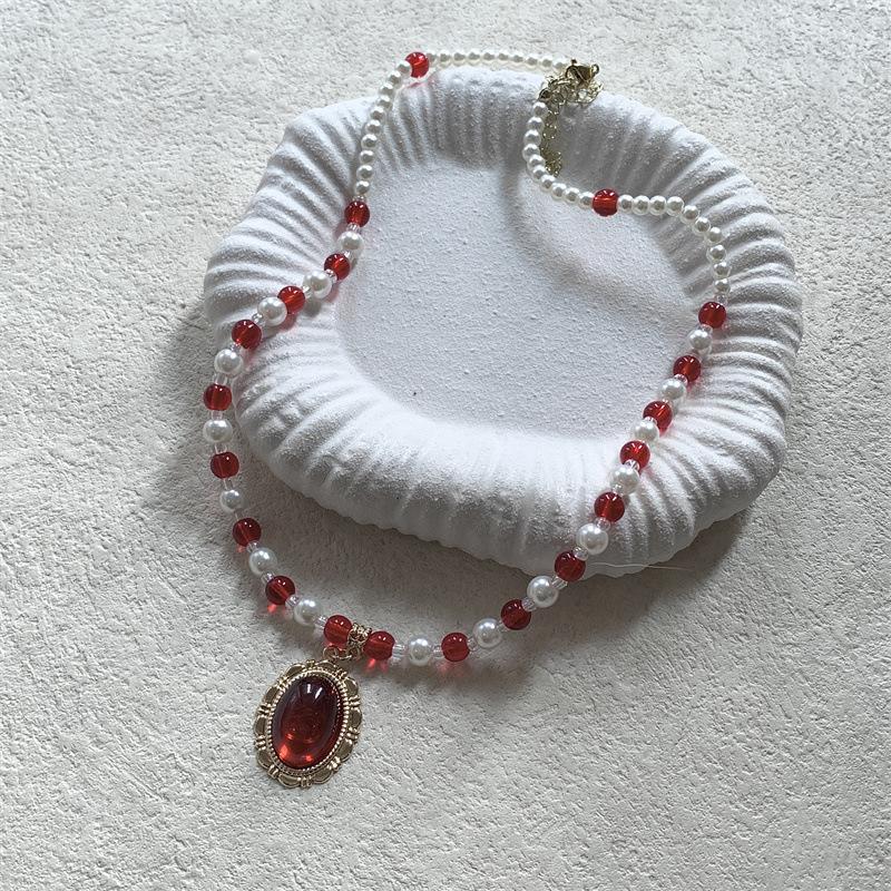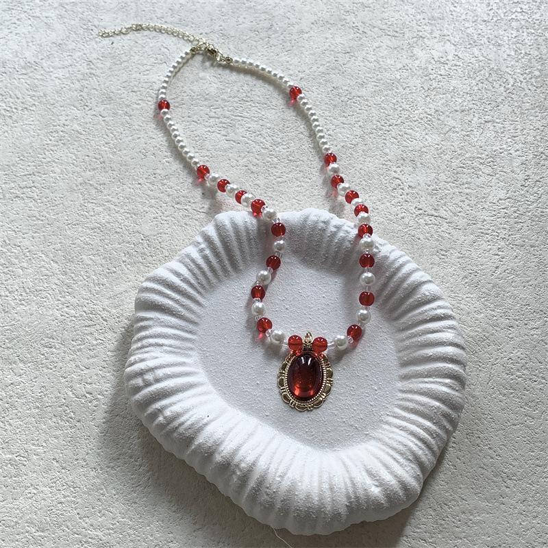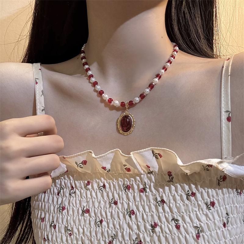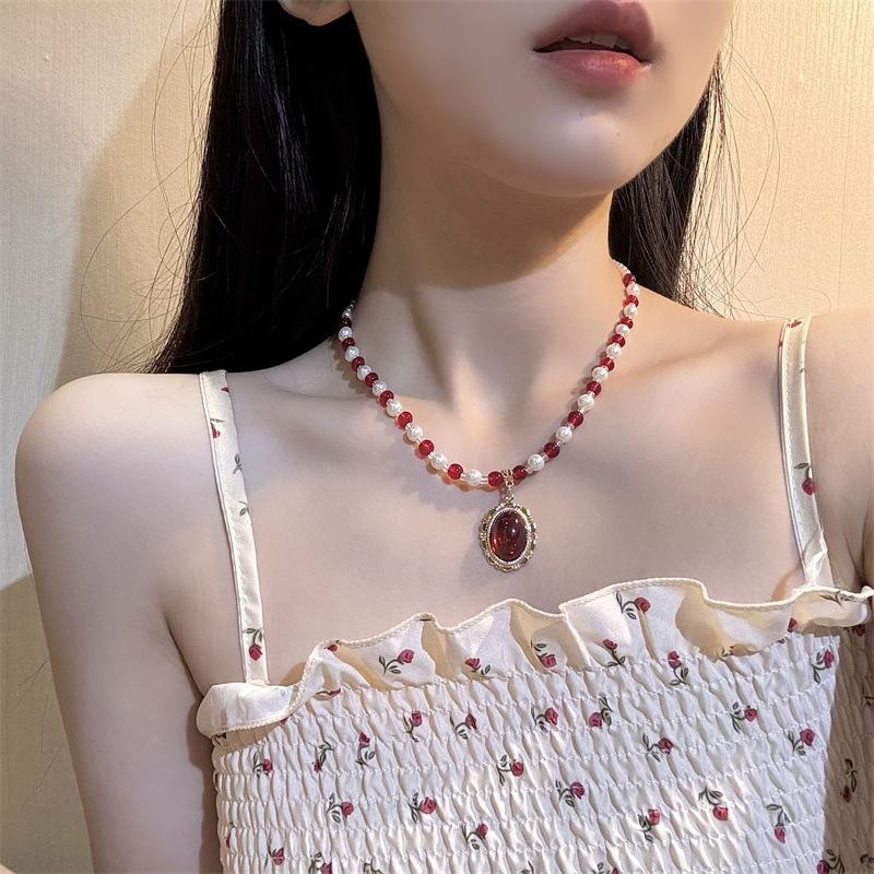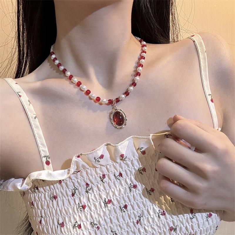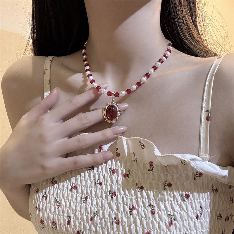 Collar de Perlas con Gema Roja Estilo Palacio Retro Francés Diseño de Lujo Ligero para Mujer Cadena Clavícula