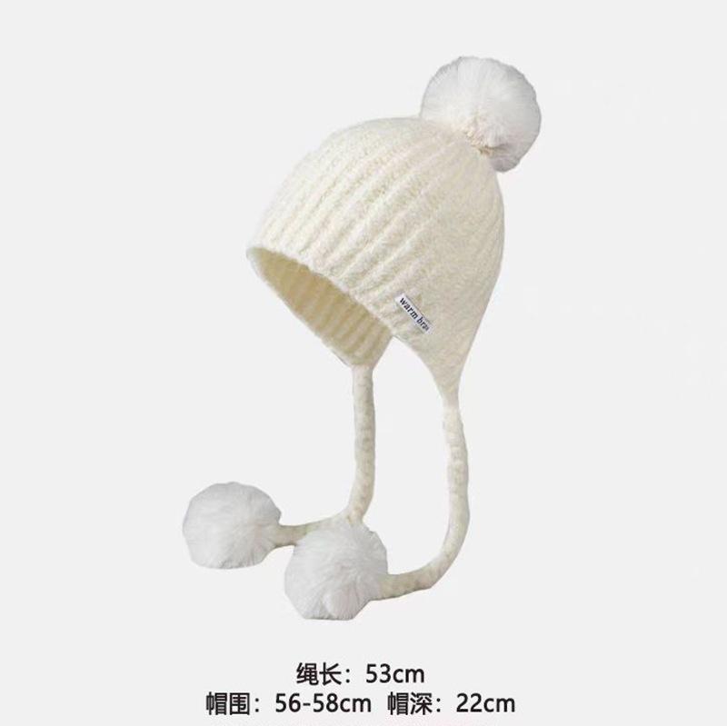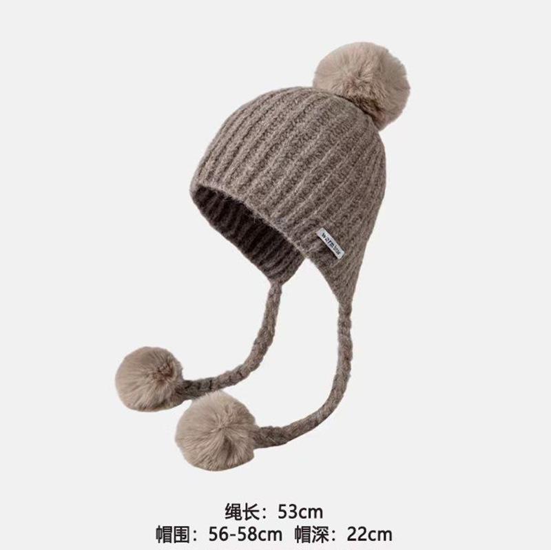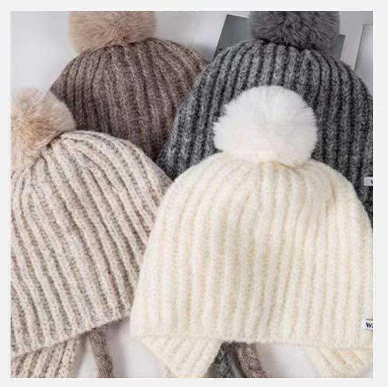 Gorro de punto de lana estilo coreano para mujer, cálido, con correa para todo tipo de combinaciones, con bola de pelo y protección para las orejas, Lei Feng, para otoño e invierno