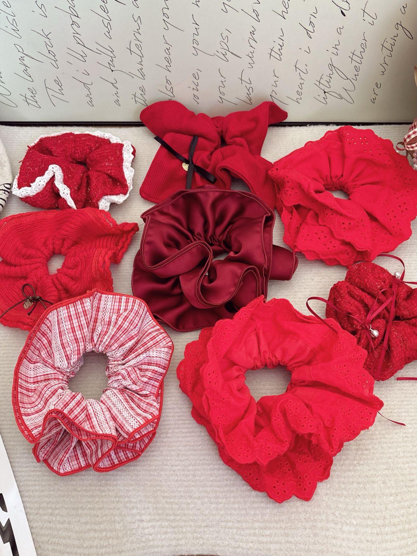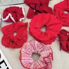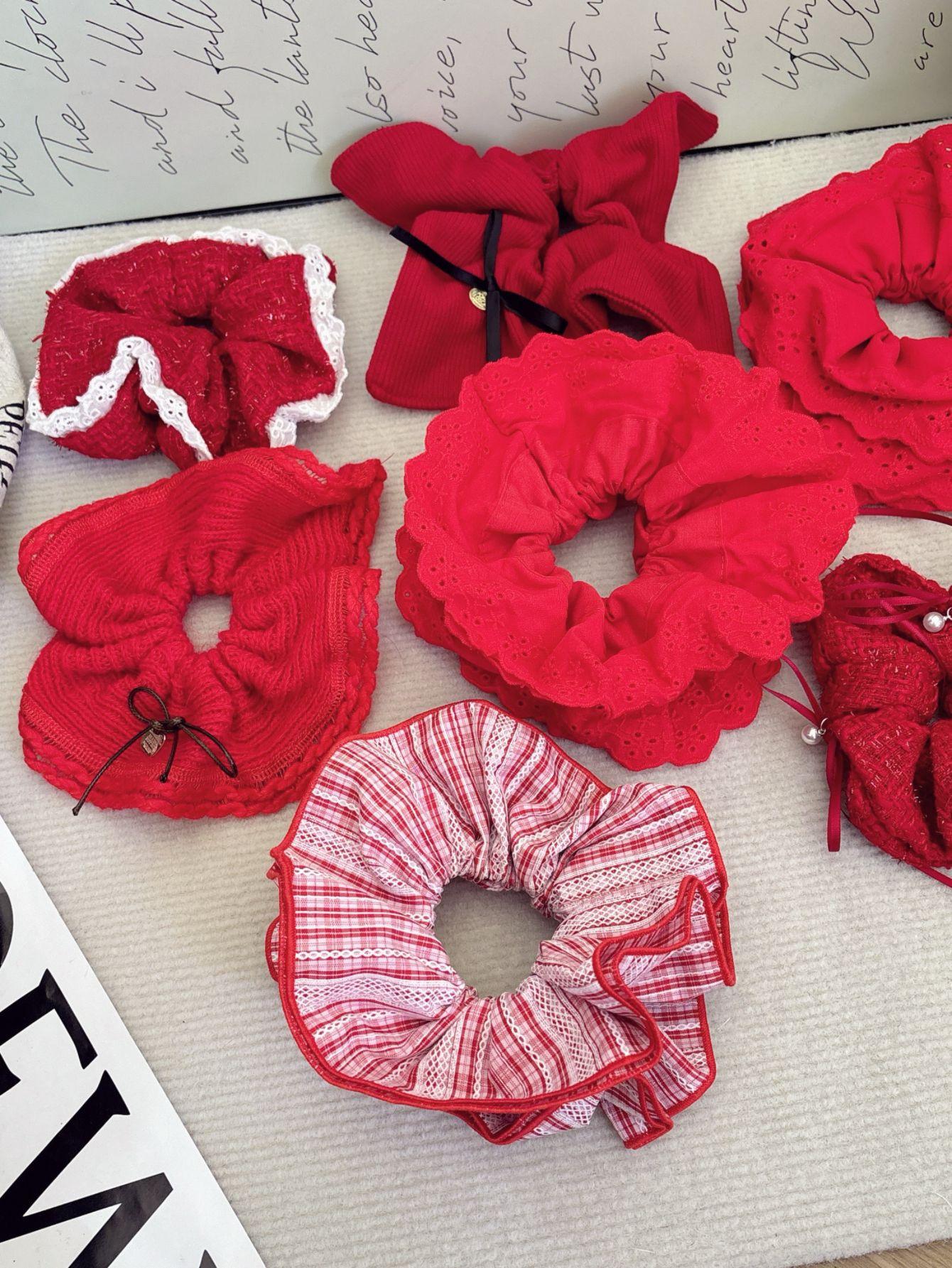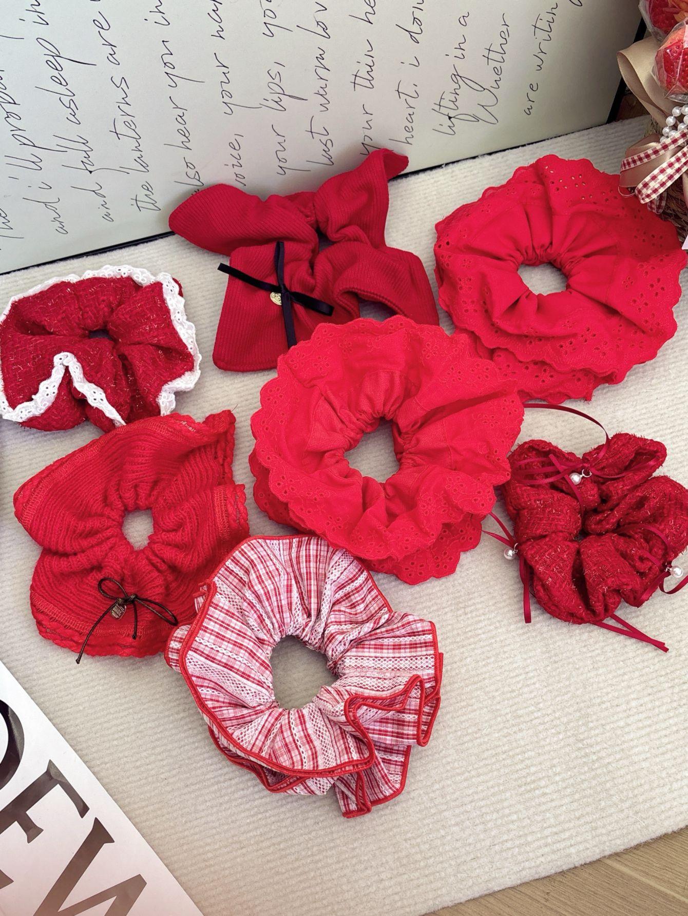 Christmas red-check hair tie, Red striped hair tie, Red lace ballet hair tie, Red satin pleated four-layer hai...