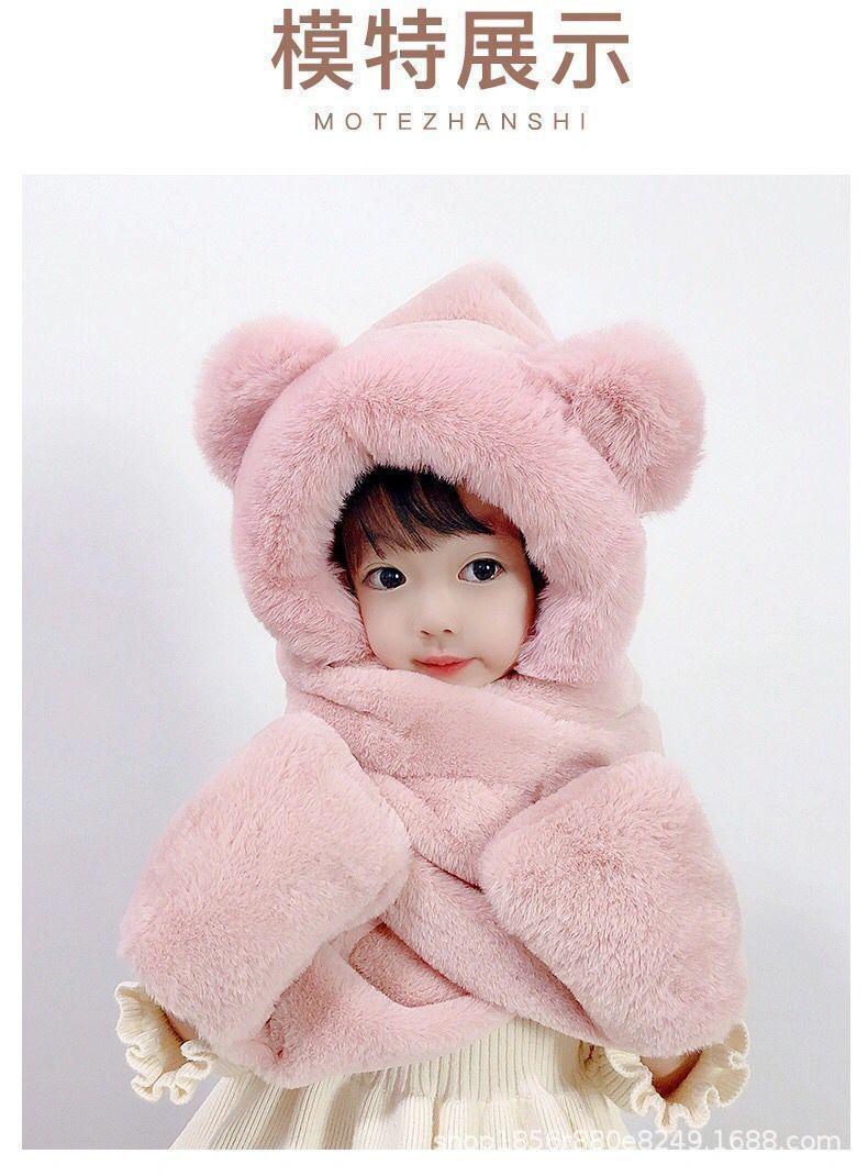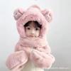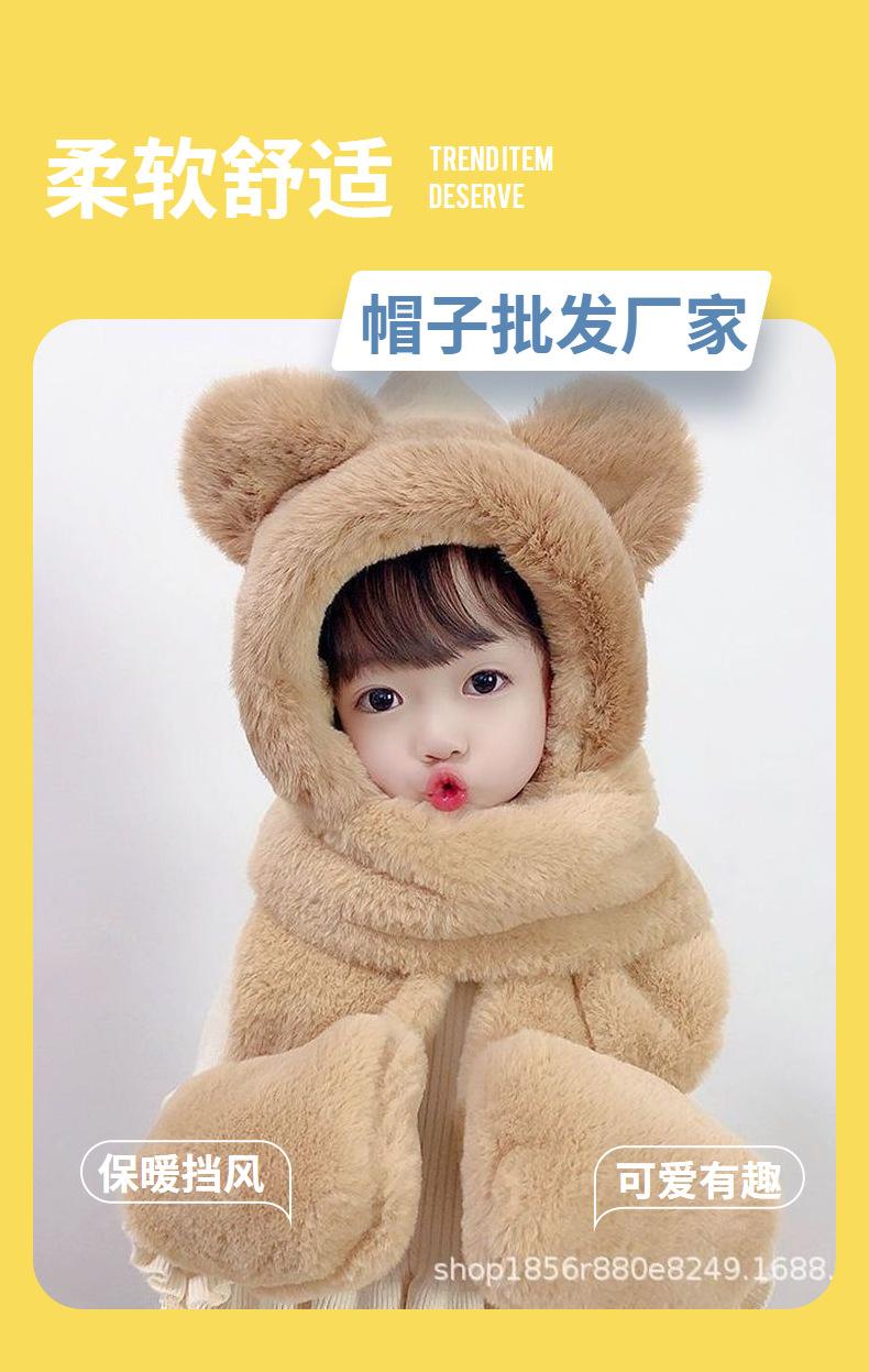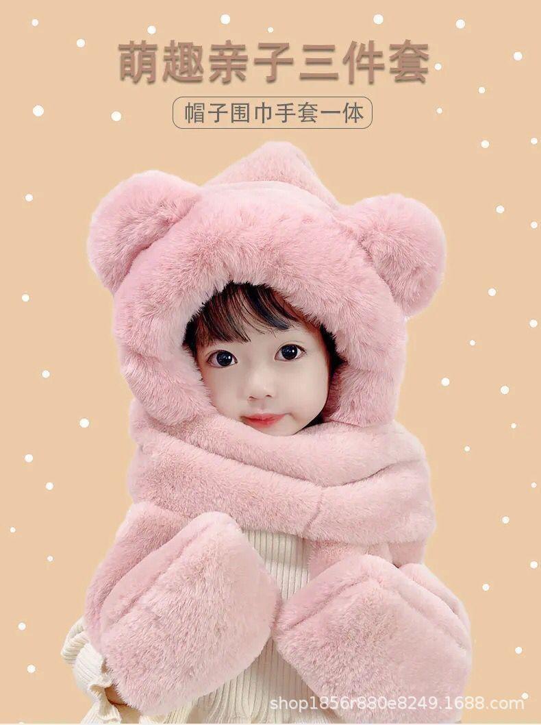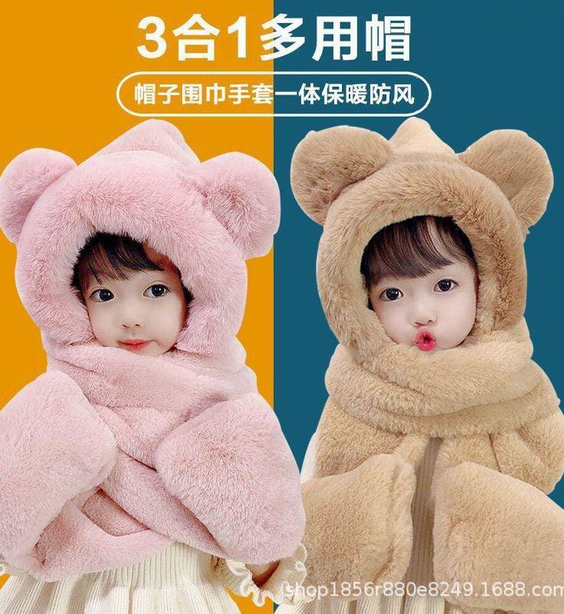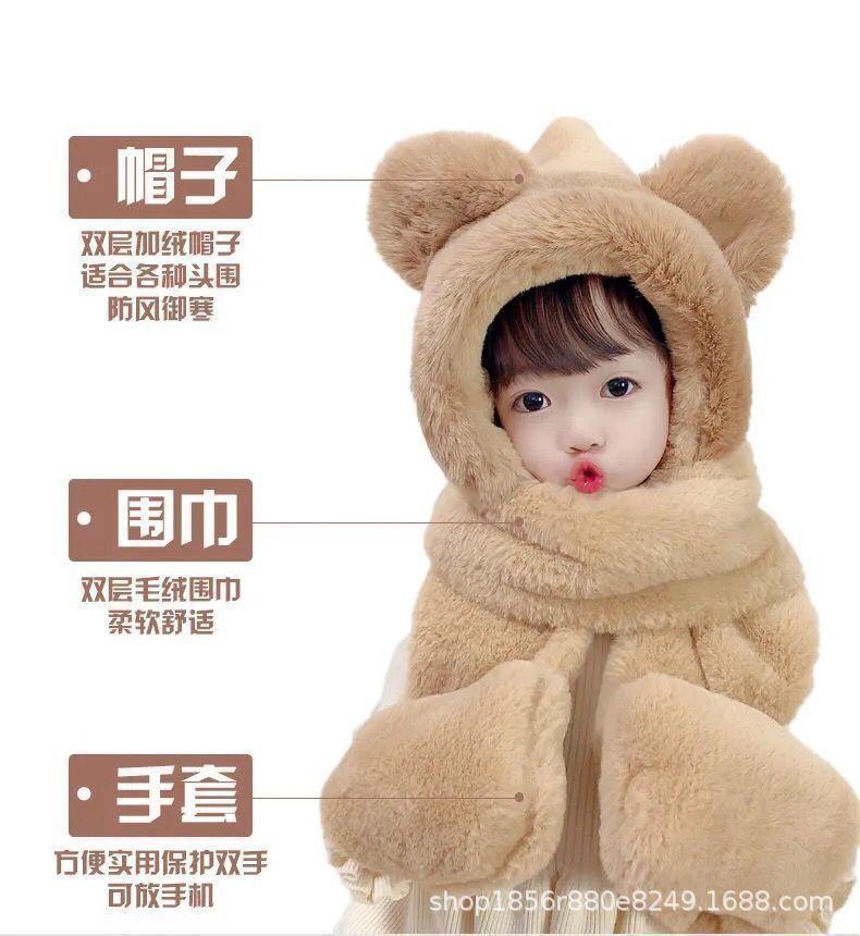 Conjunto de tres piezas de gorro, bufanda y guantes para niños, cálido y bonito oso de invierno con capucha, bufanda de una pieza, moda para niños y niñas.