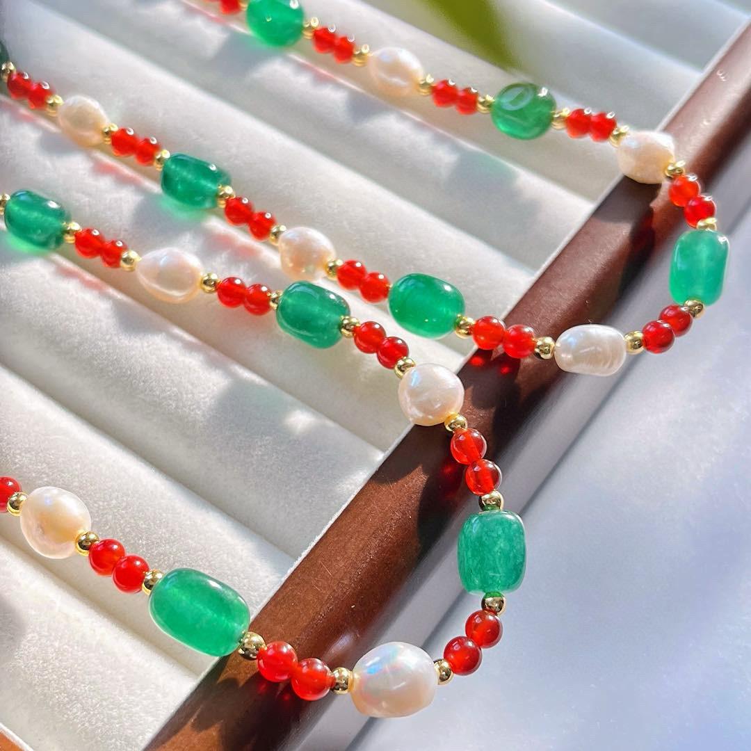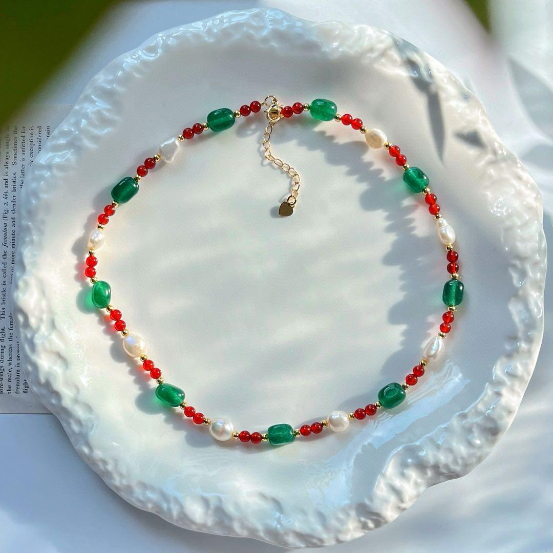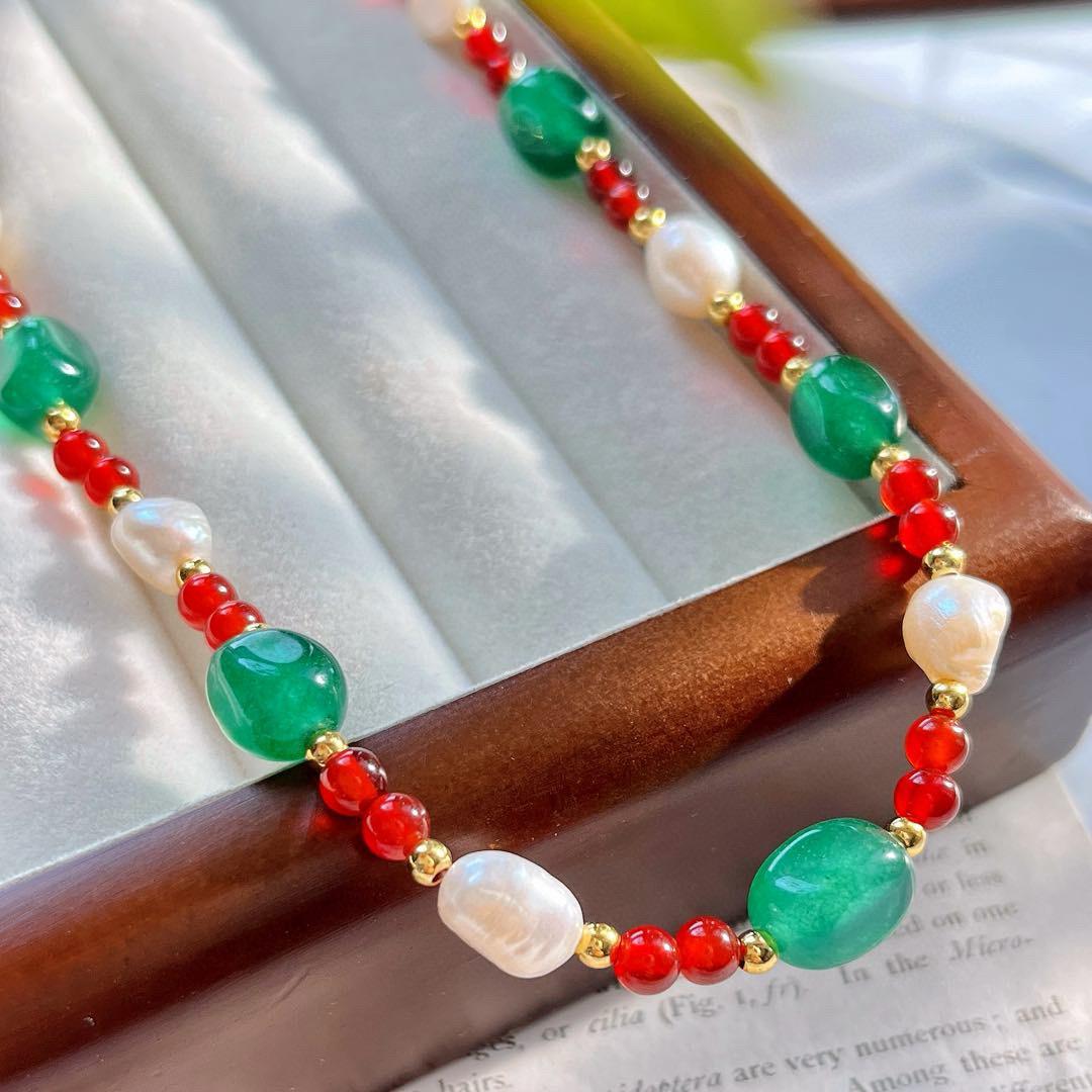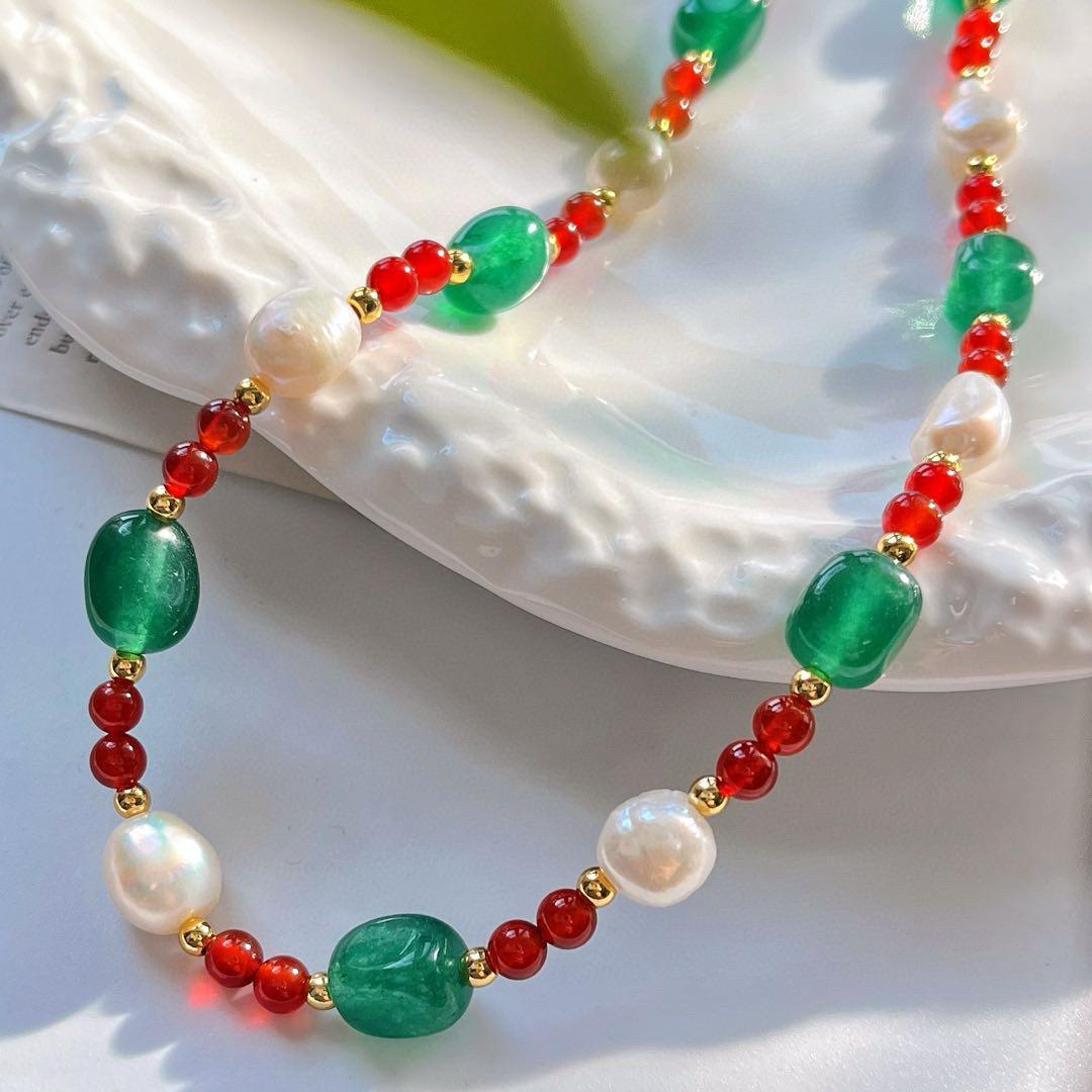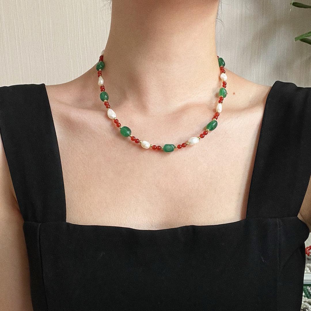 Collar de Cadena Clavicular de Calcedonia Roja Sangre de Paloma de Alta Calidad Retro Estilo Chino con Perla Barroca de Agua Dulce