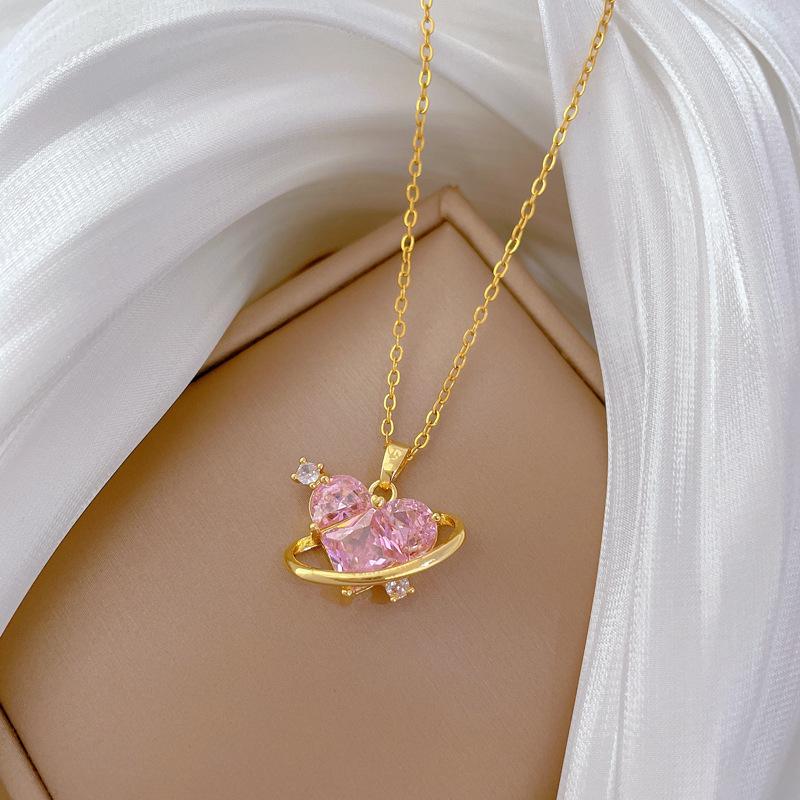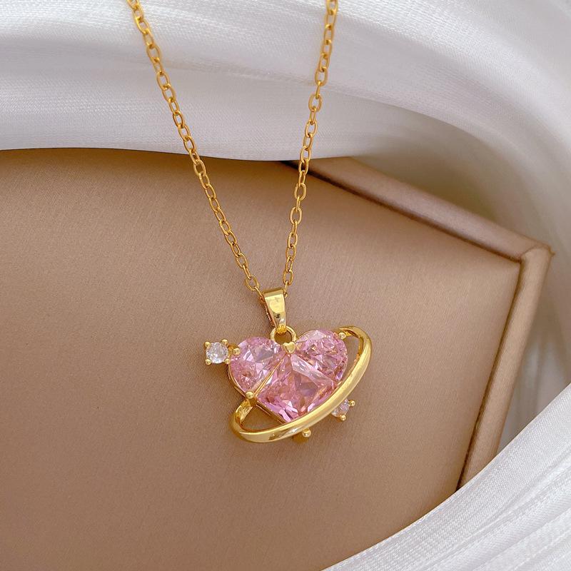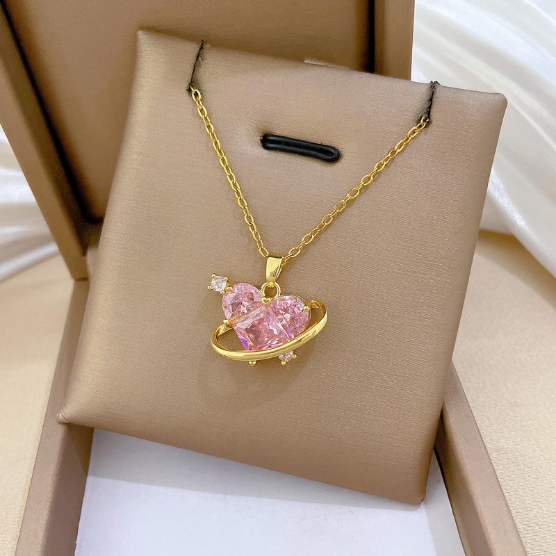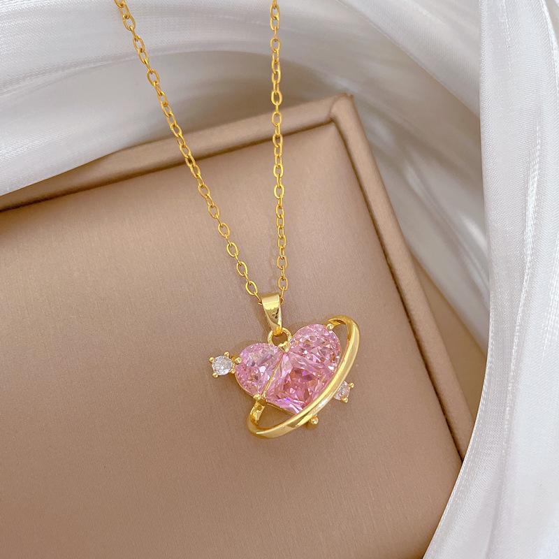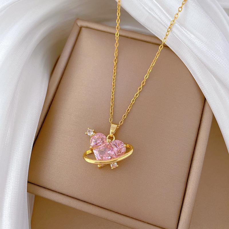 [Acero de titanio] Collar elegante y lujoso con diamantes de imitación rosas, cadena de clavícula a juego para mujer, acero de titanio.
