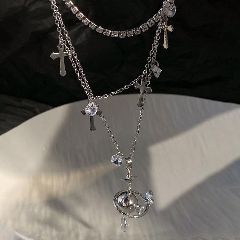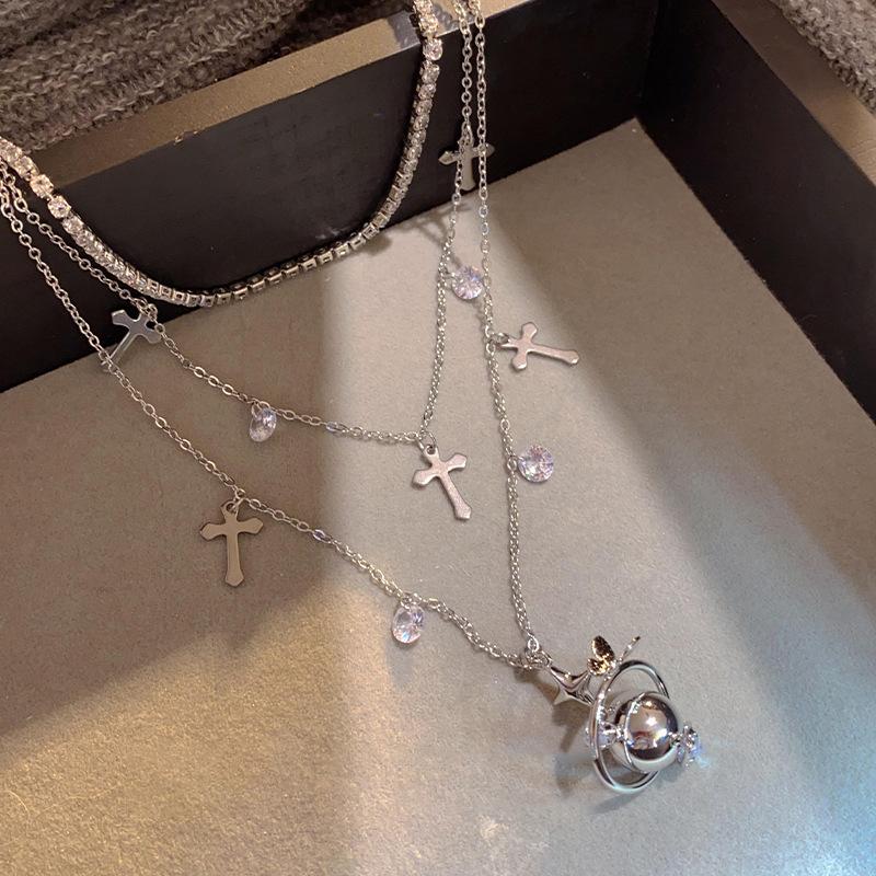 Collar de circón multicapa con cruz de Saturno y diseño de nicho de alta gama, cadena de clavícula, nuevo collar de moda para mujer