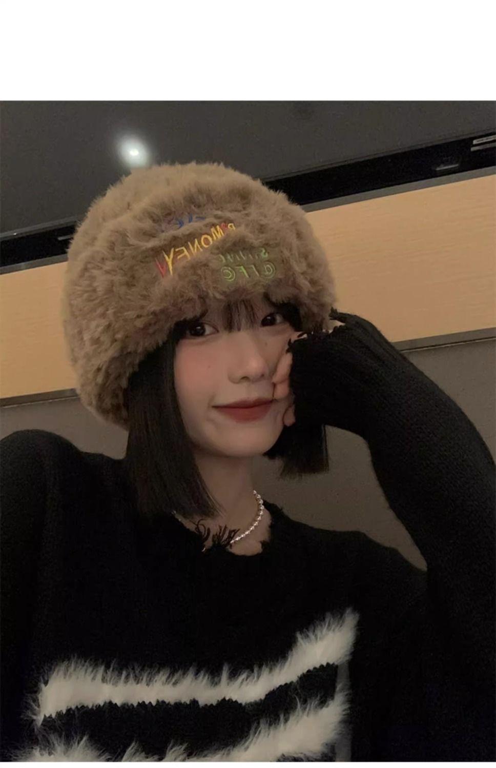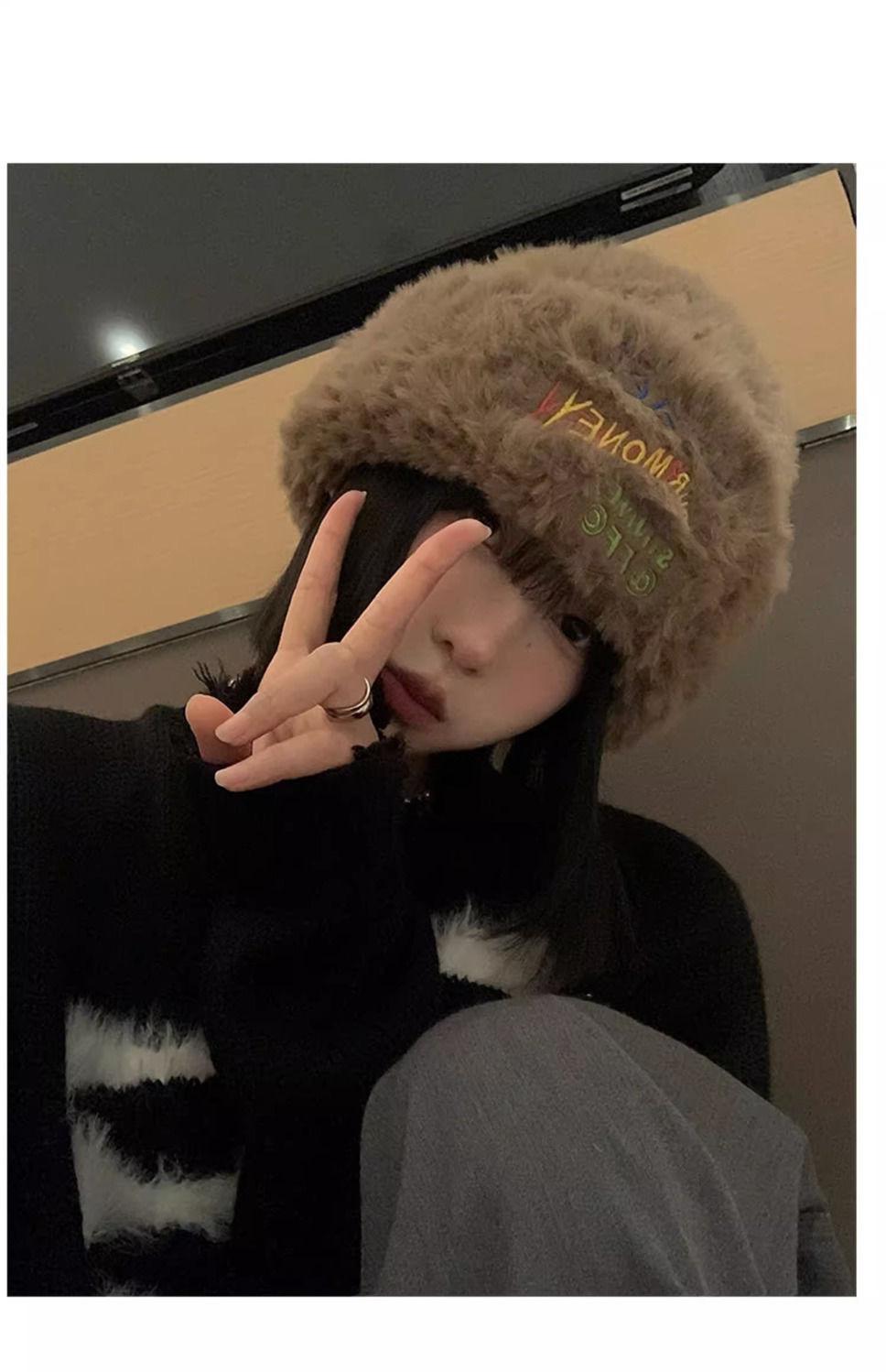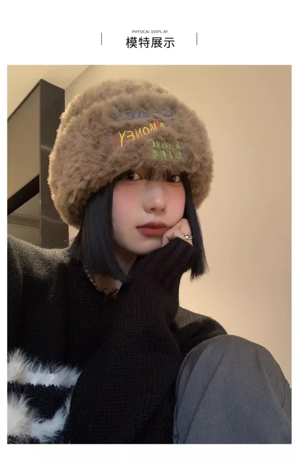 Gorro de punto peludo de otoño e invierno para mujer, estilo japonés, con gran circunferencia de la cabeza, grueso y cálido, de lana, estilo coreano, para exhibir caras, pequeño, a la moda.
