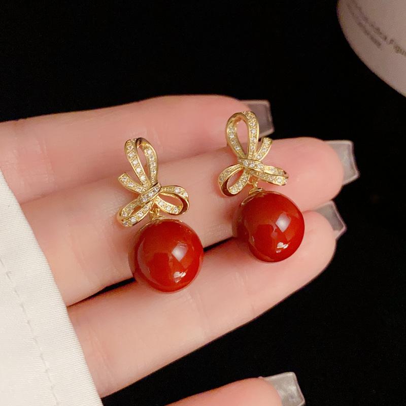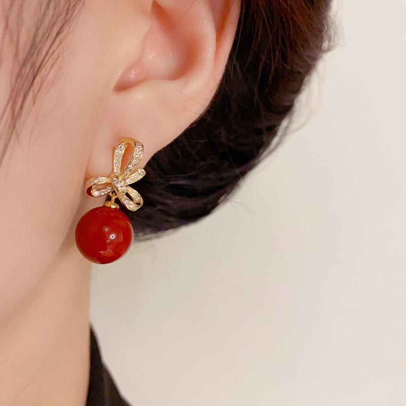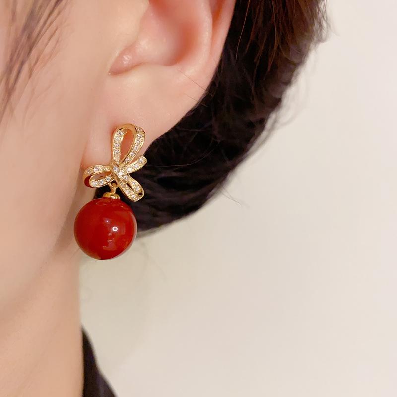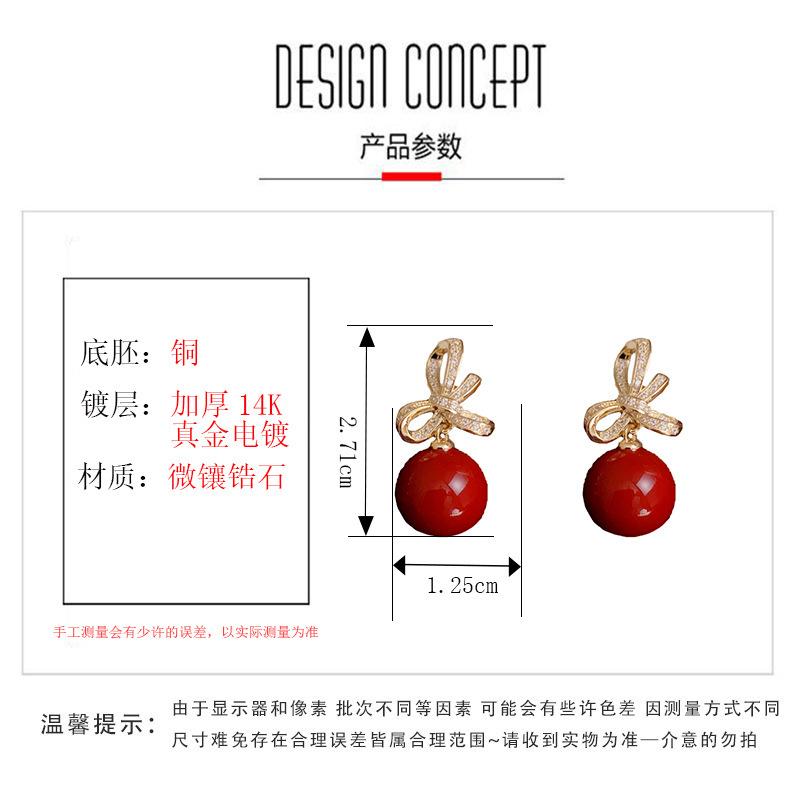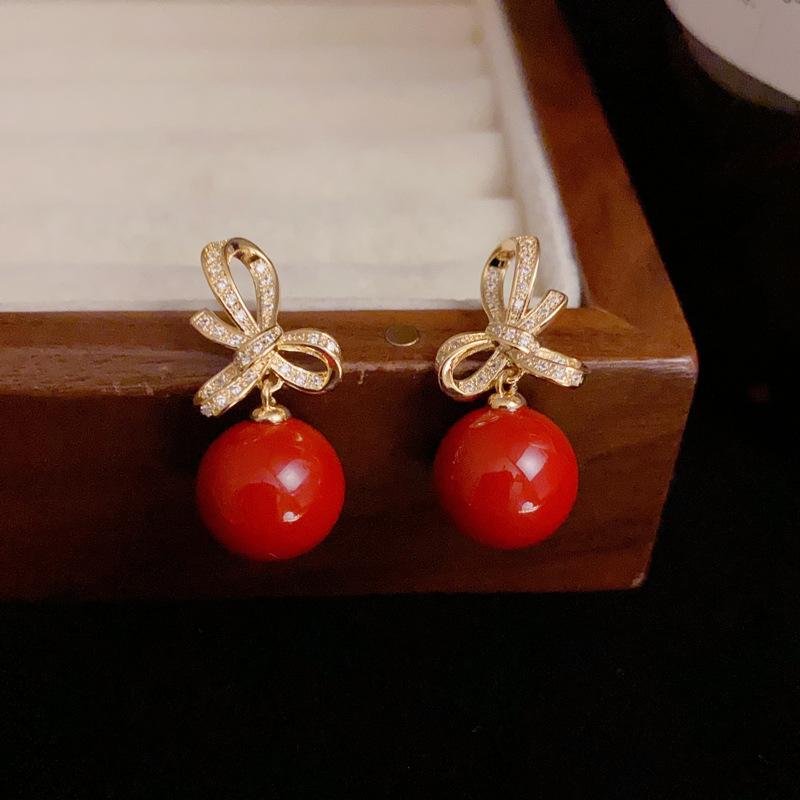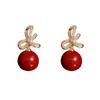 Zircon bow red pearl earrings (thick gold plating)