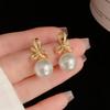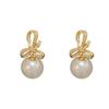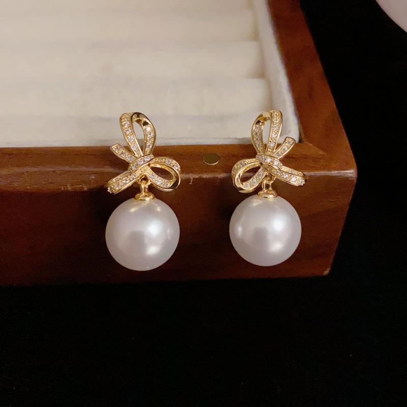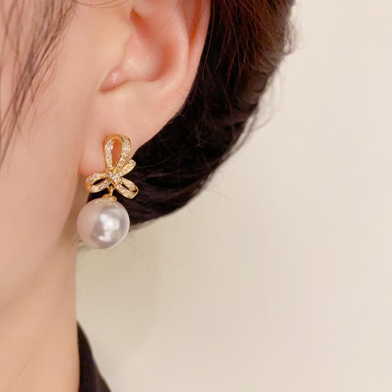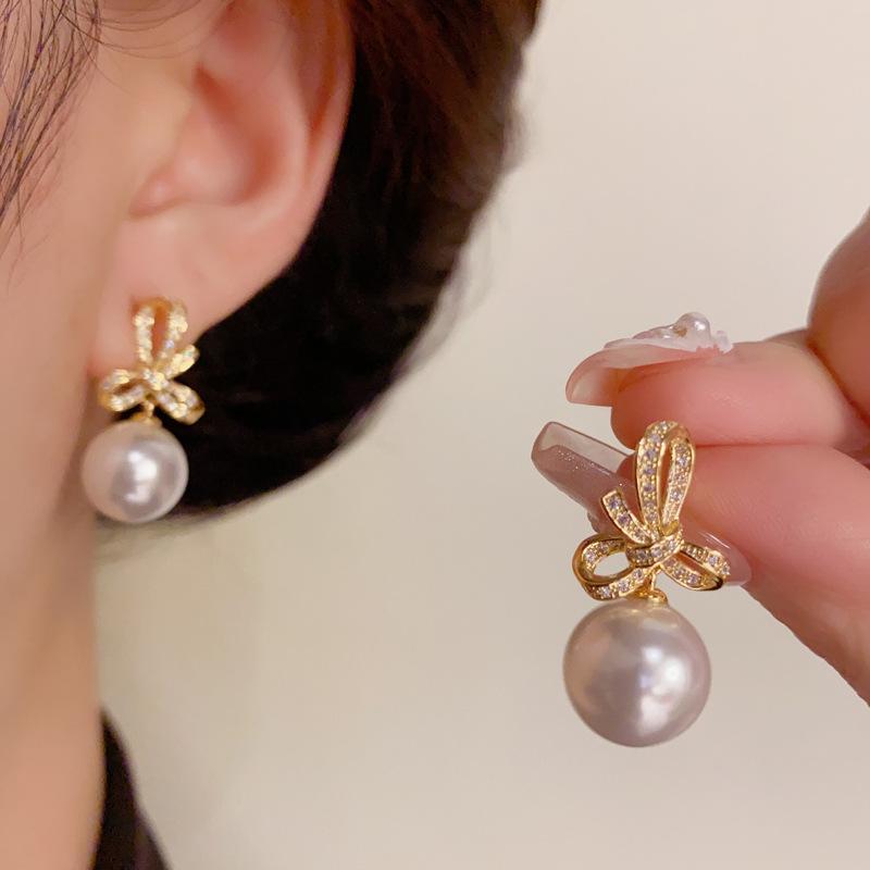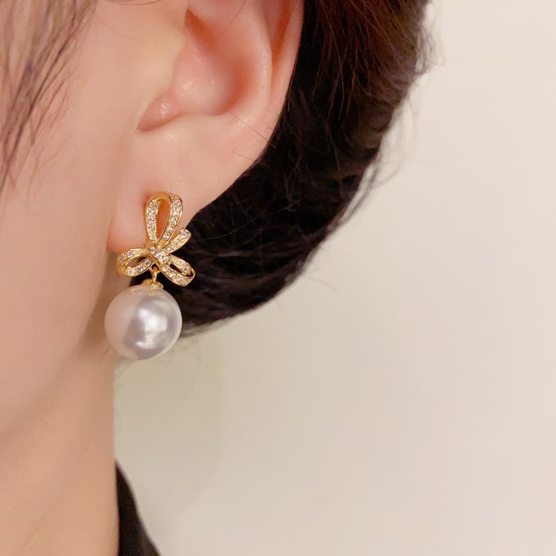 Pendientes de perla con lazo de circón, nuevos pendientes franceses retro ligeros de lujo de alta gama, sencillos y elegantes que combinan con todo.