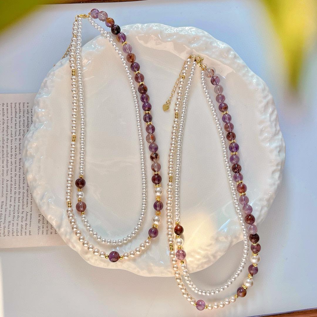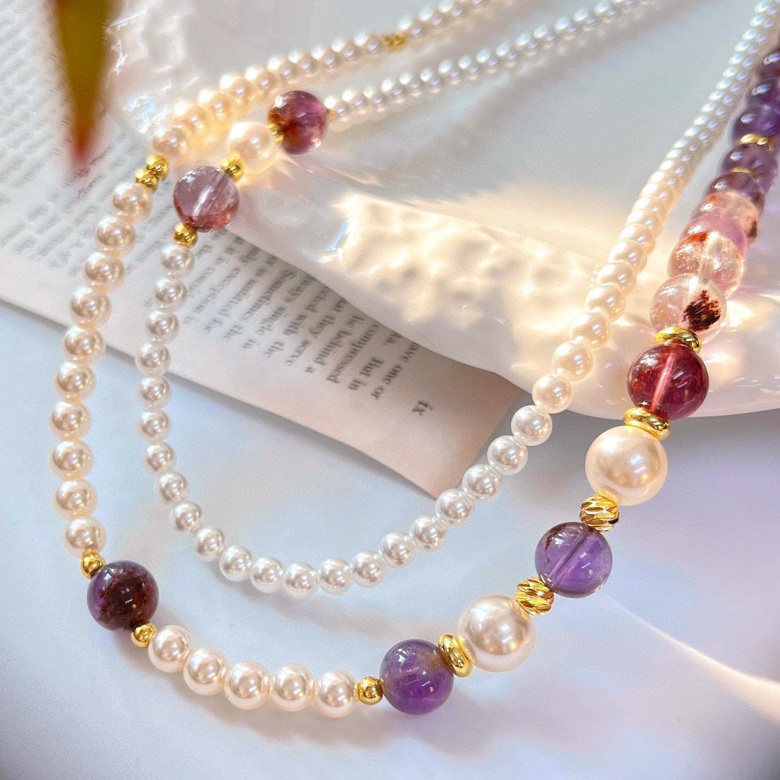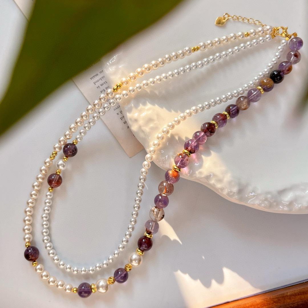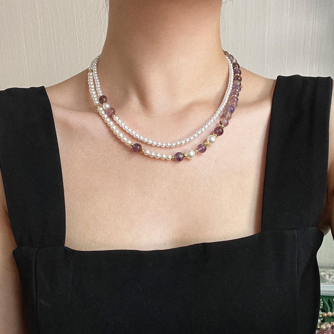 Collar Guofeng retro con cadena de clavícula con diseño de doble capa, con perlas artificiales de cristal, luz fuerte y redonda, color morado natural