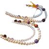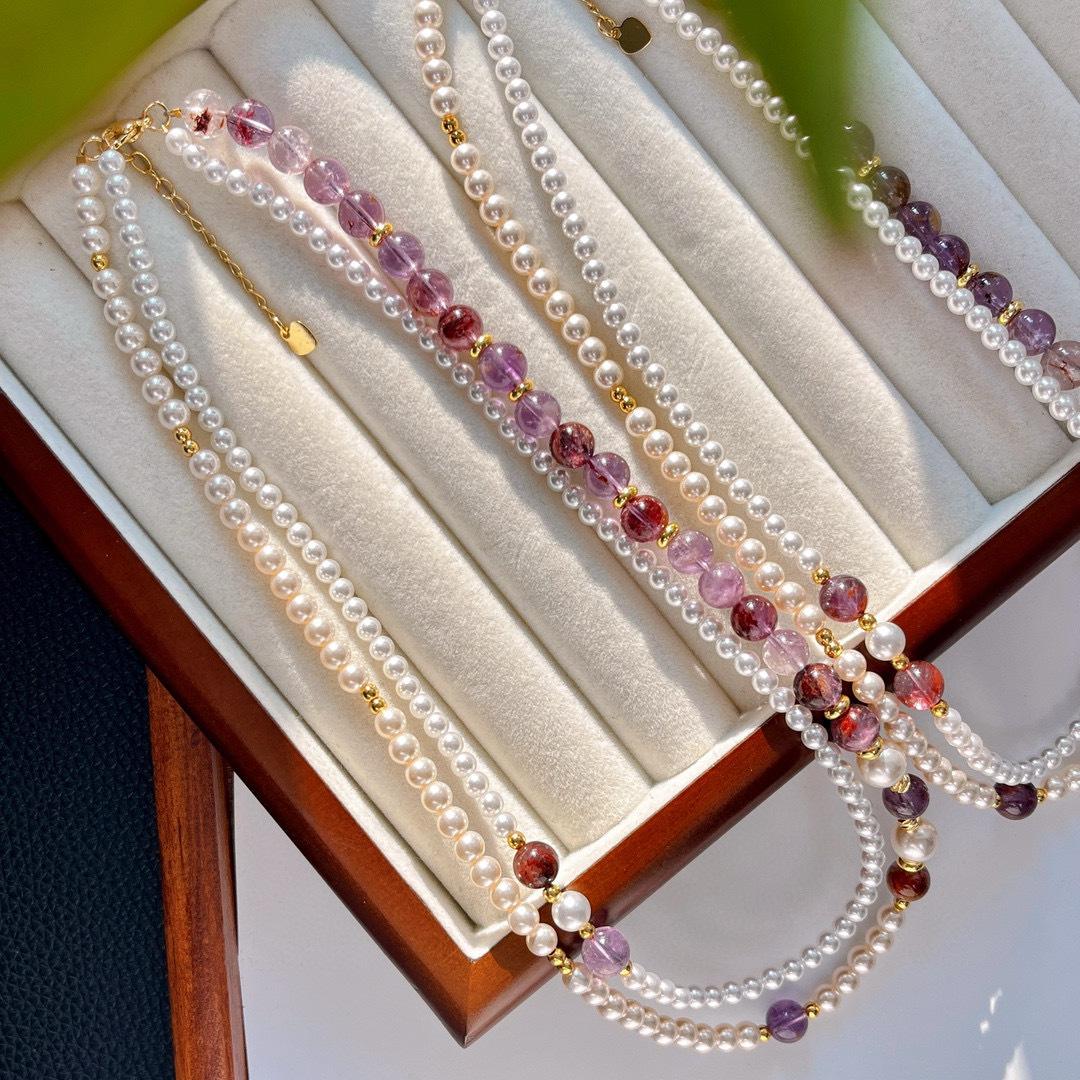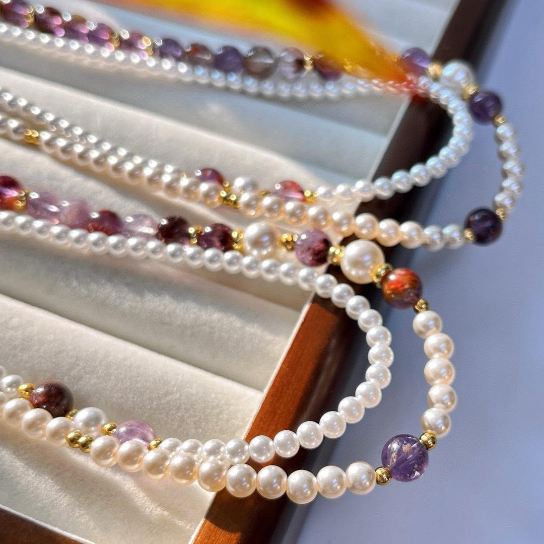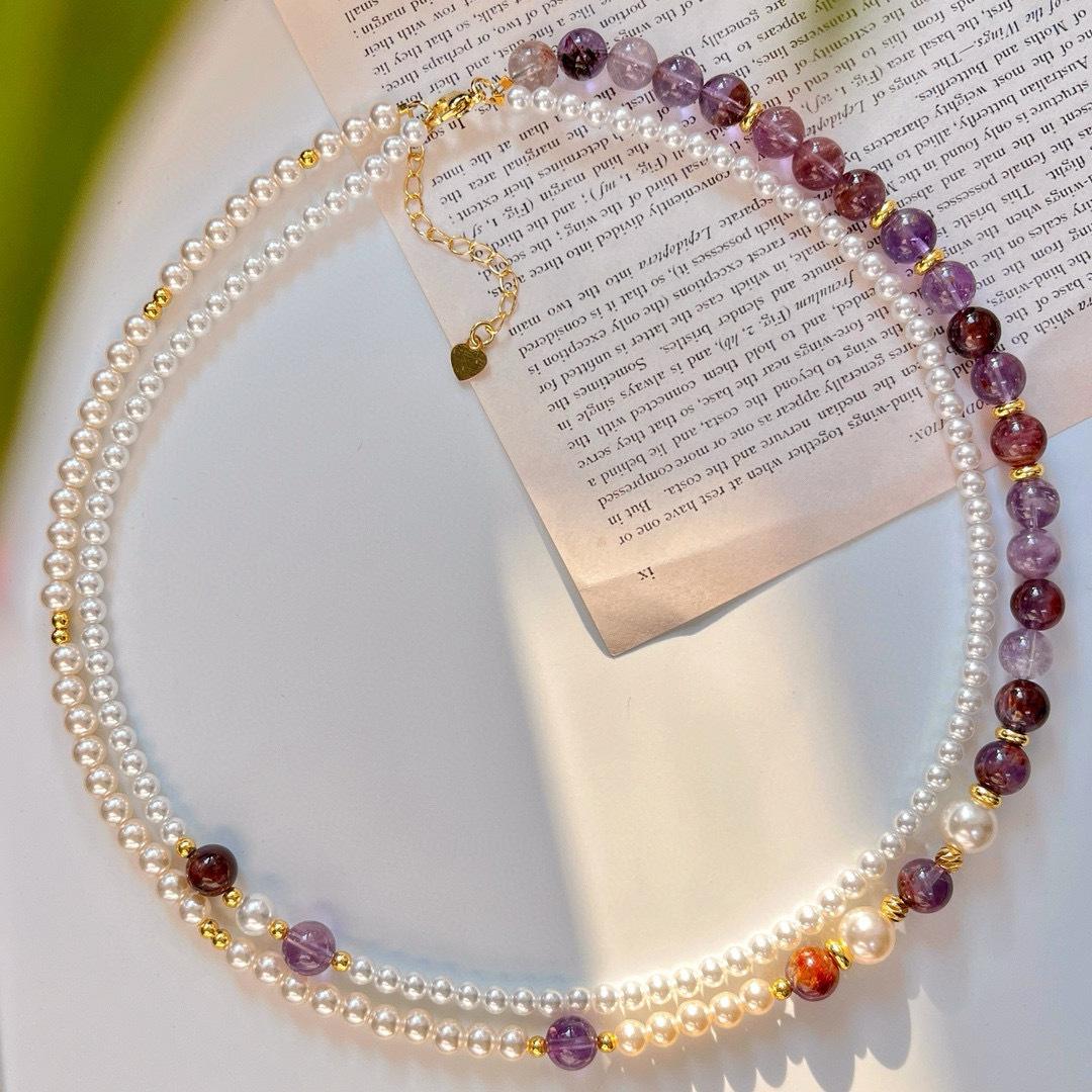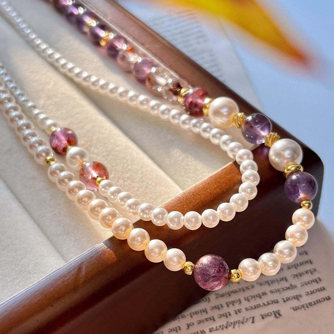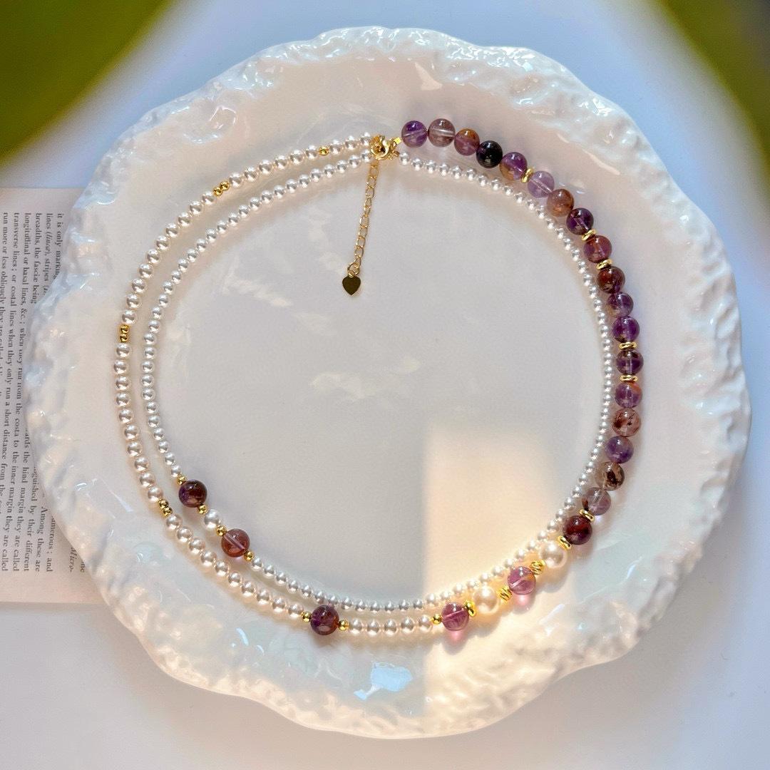 Collar Guofeng retro con cadena de clavícula con diseño de doble capa, con perlas artificiales de cristal, luz fuerte y redonda, color morado natural