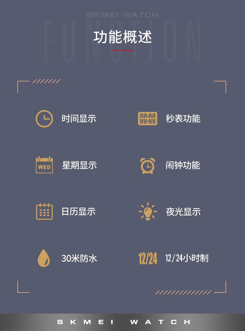 Time, stopwatch timing, el luminous, date display, alarm clock, day of the week, hourly time, 12/24 hour system.