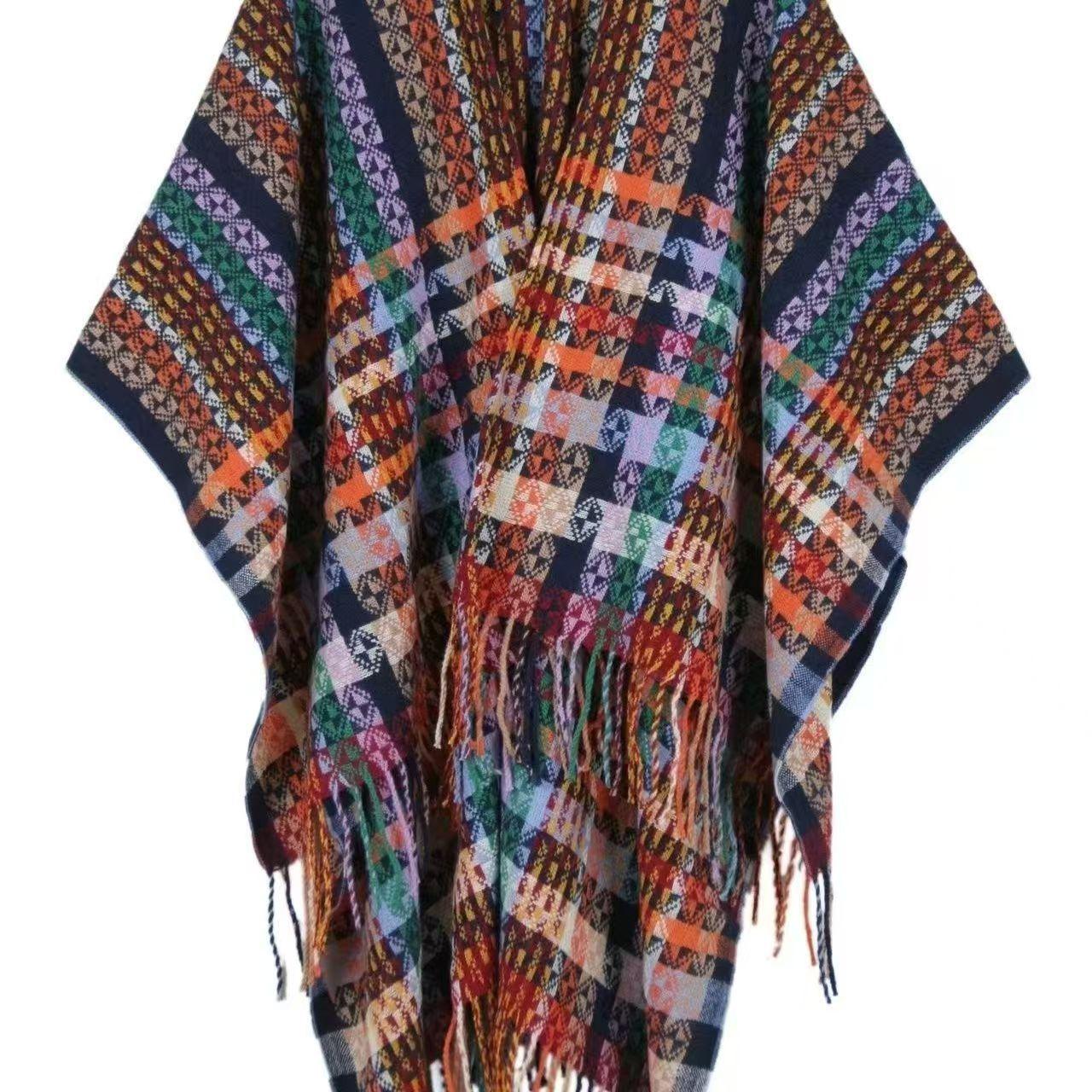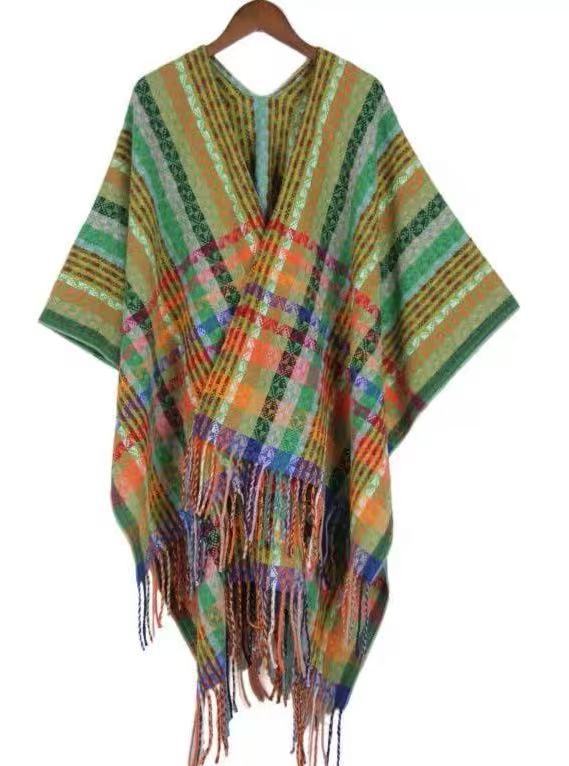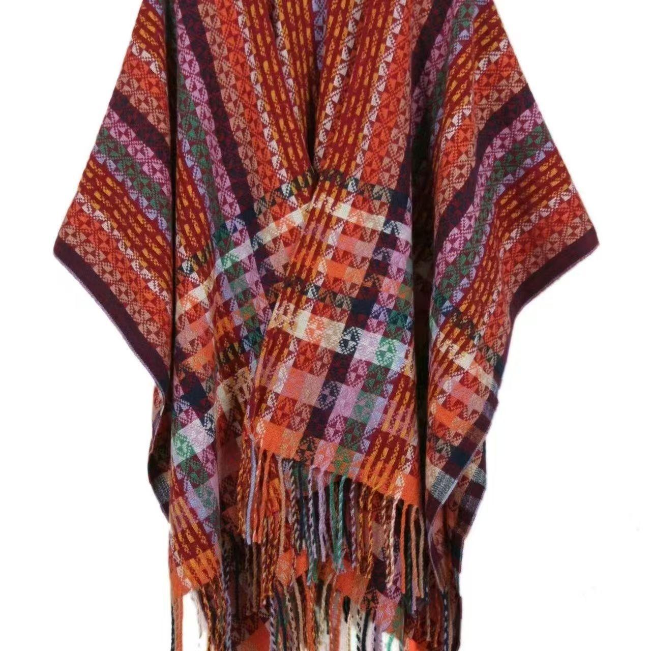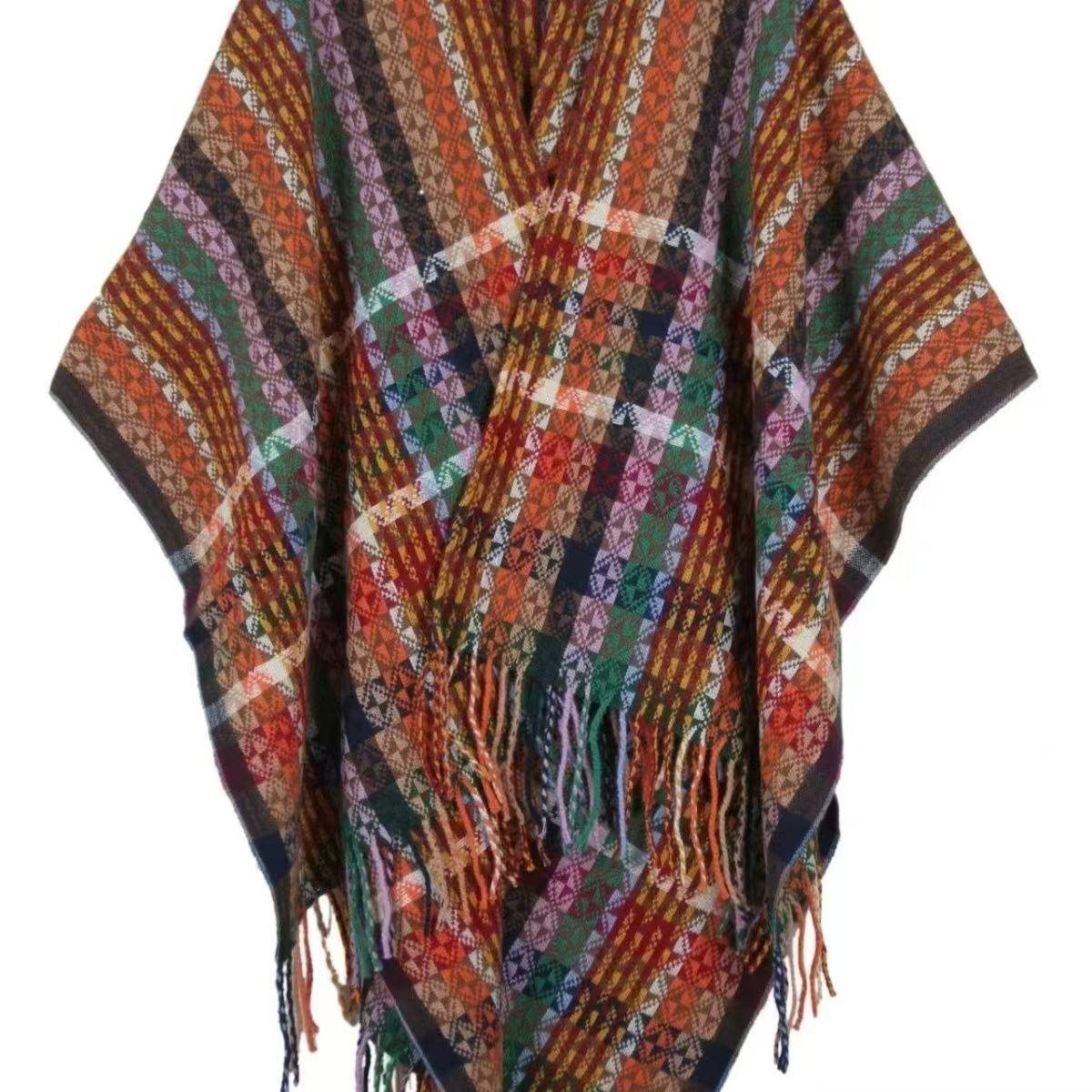 Capa de estilo nacional, estilo retro, nuevo estilo, estilo nacional, capa de color enrejado, tejido fotográfico, borla de viaje, chal cálido para mujer