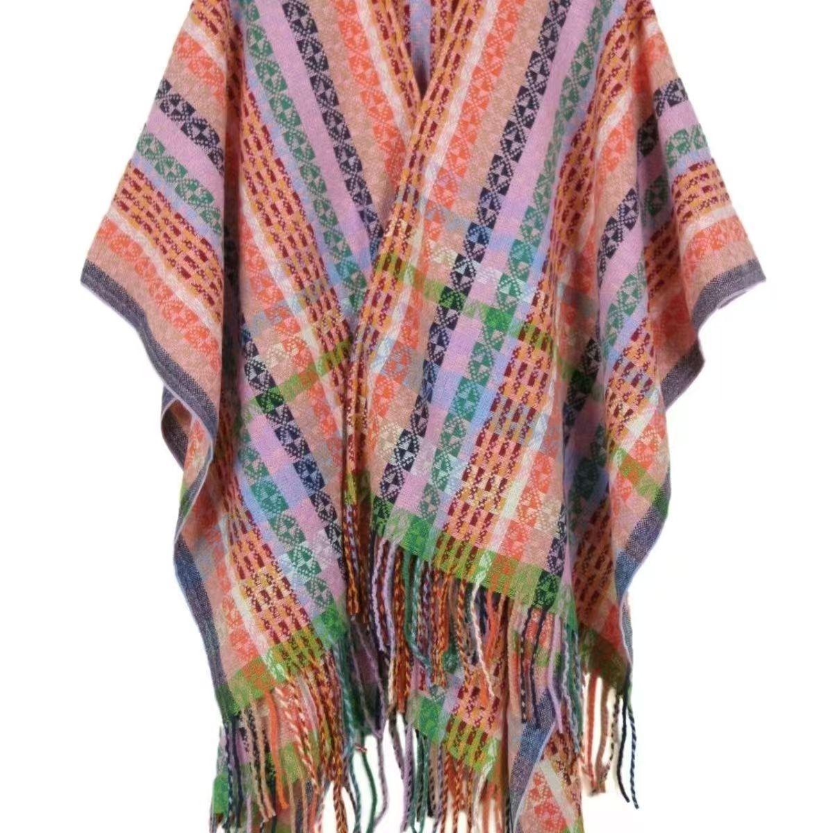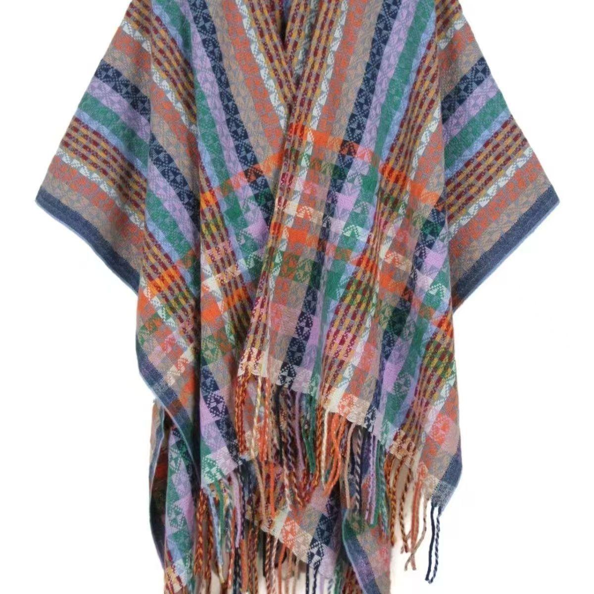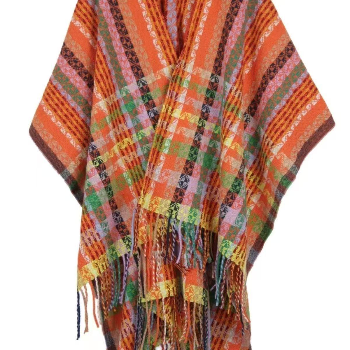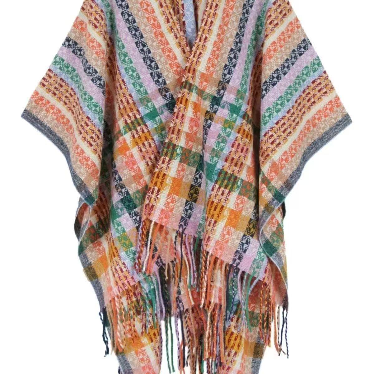 Capa de estilo nacional, estilo retro, nuevo estilo, estilo nacional, capa de color enrejado, tejido fotográfico, borla de viaje, chal cálido para mujer