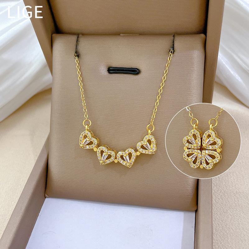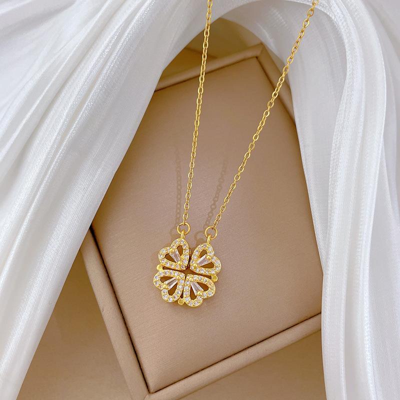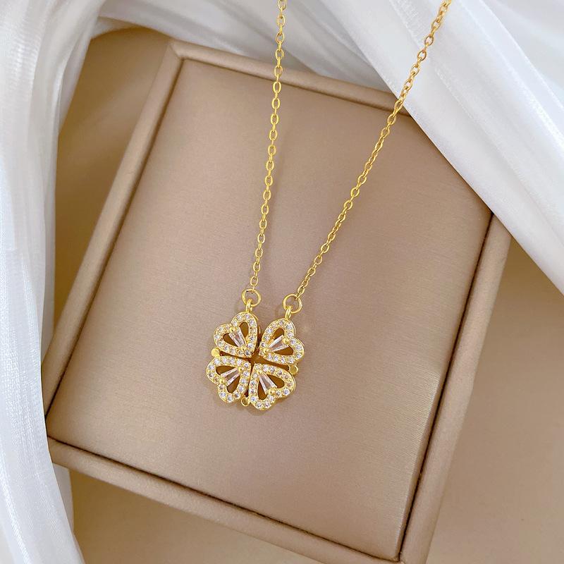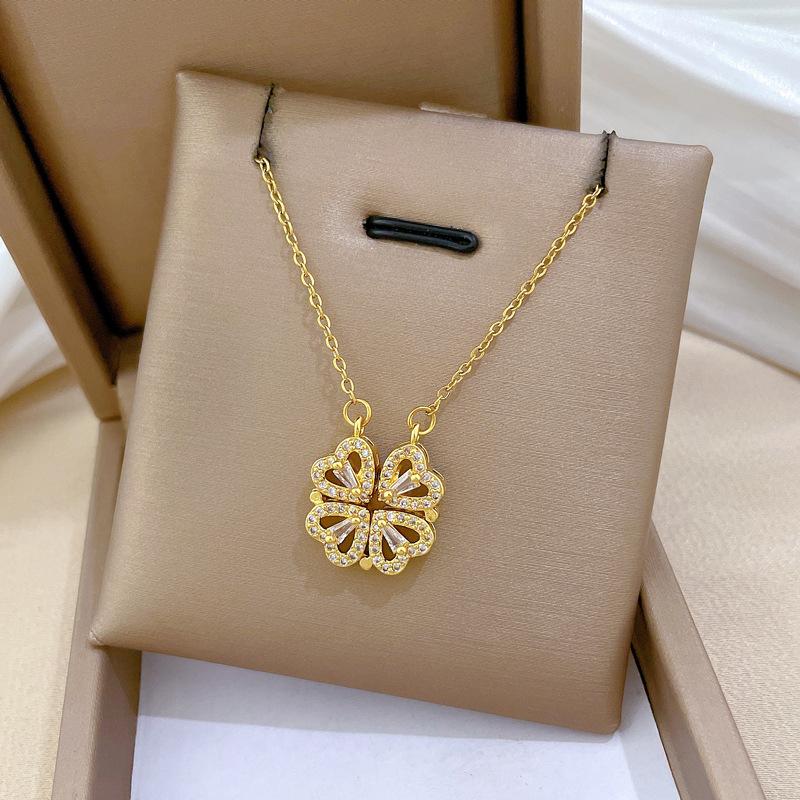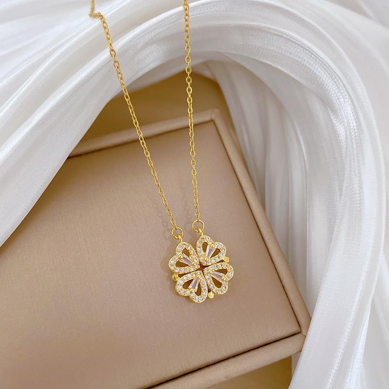 [Acero de Titanio] Collar Nuevo para Mujer Dos Usos Corazón a Corazón Apertura y Cierre Flor de Cuatro Hojas Diamante Completo Joker Cadena Clavicular Acero de Titanio