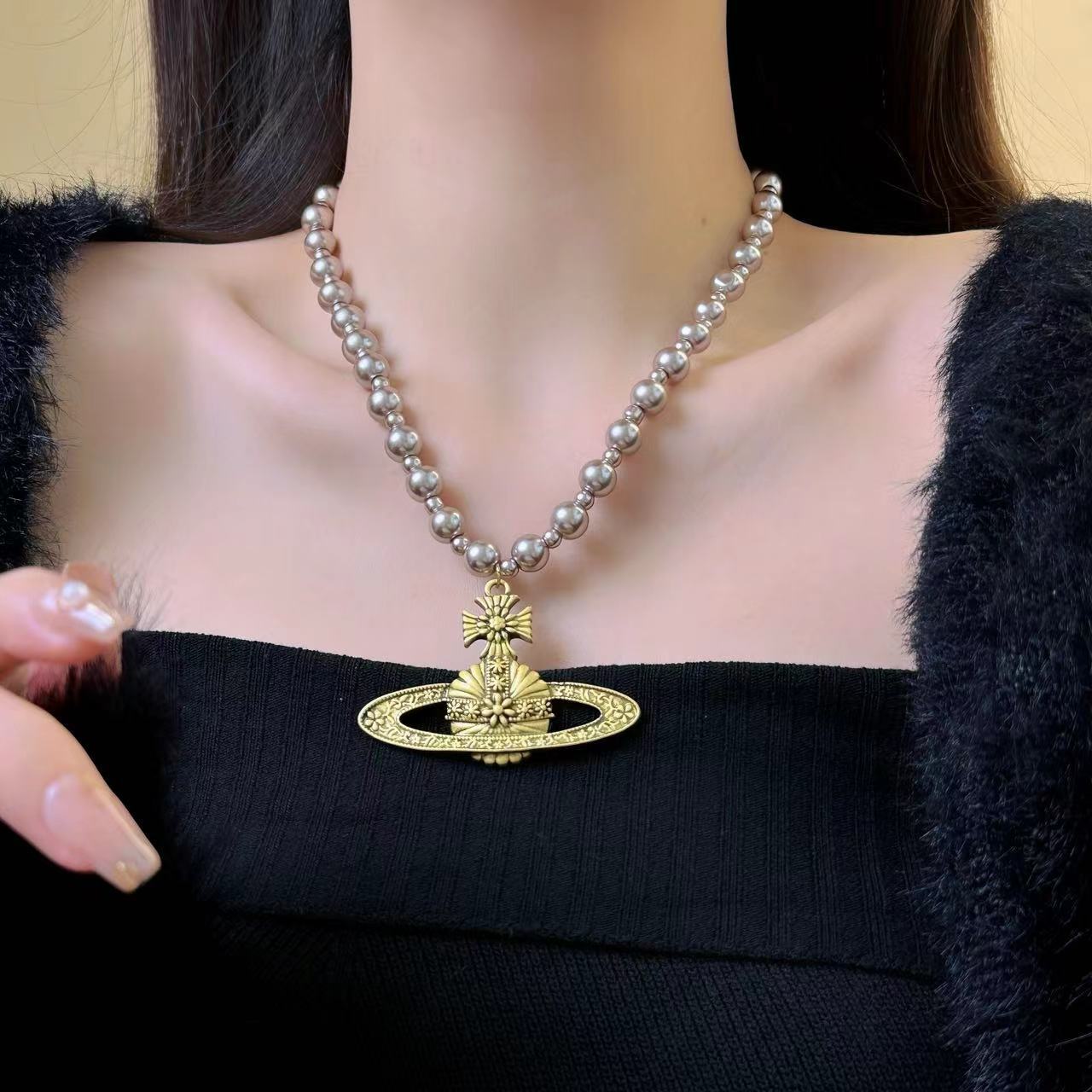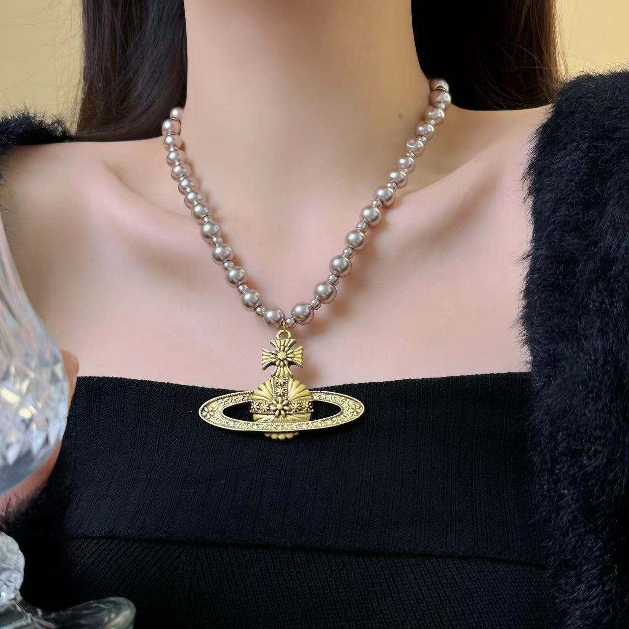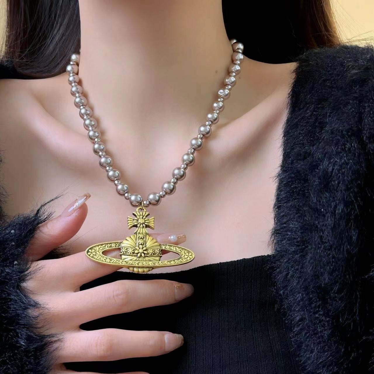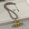 Collar Planeta Saturno Perla Oro Champán Cadena Clavícula para Mujer Otoño e Invierno Sentido de Lujo Ligero de Alta Gama Cadena de Lana Nueva Moda 2024