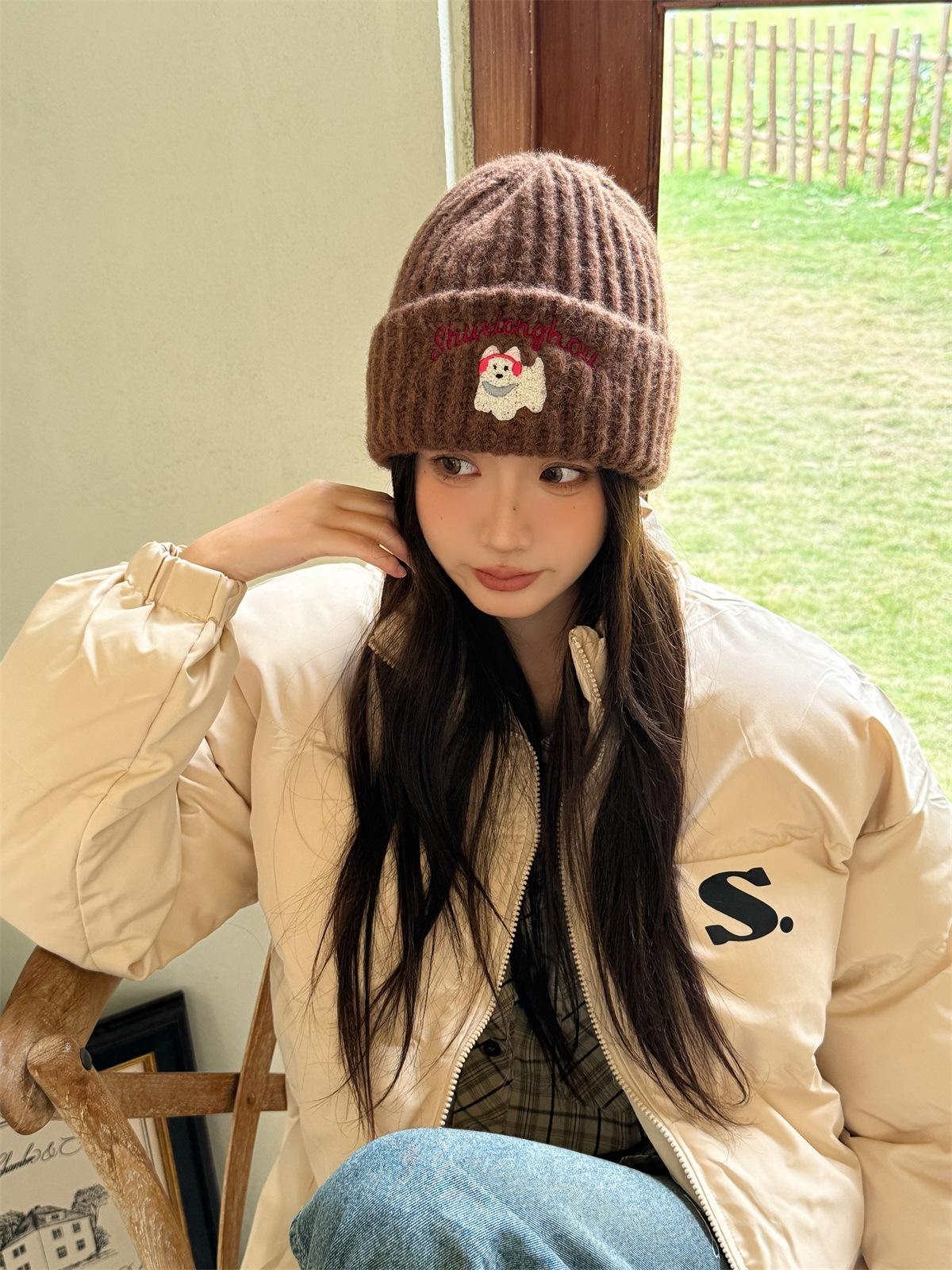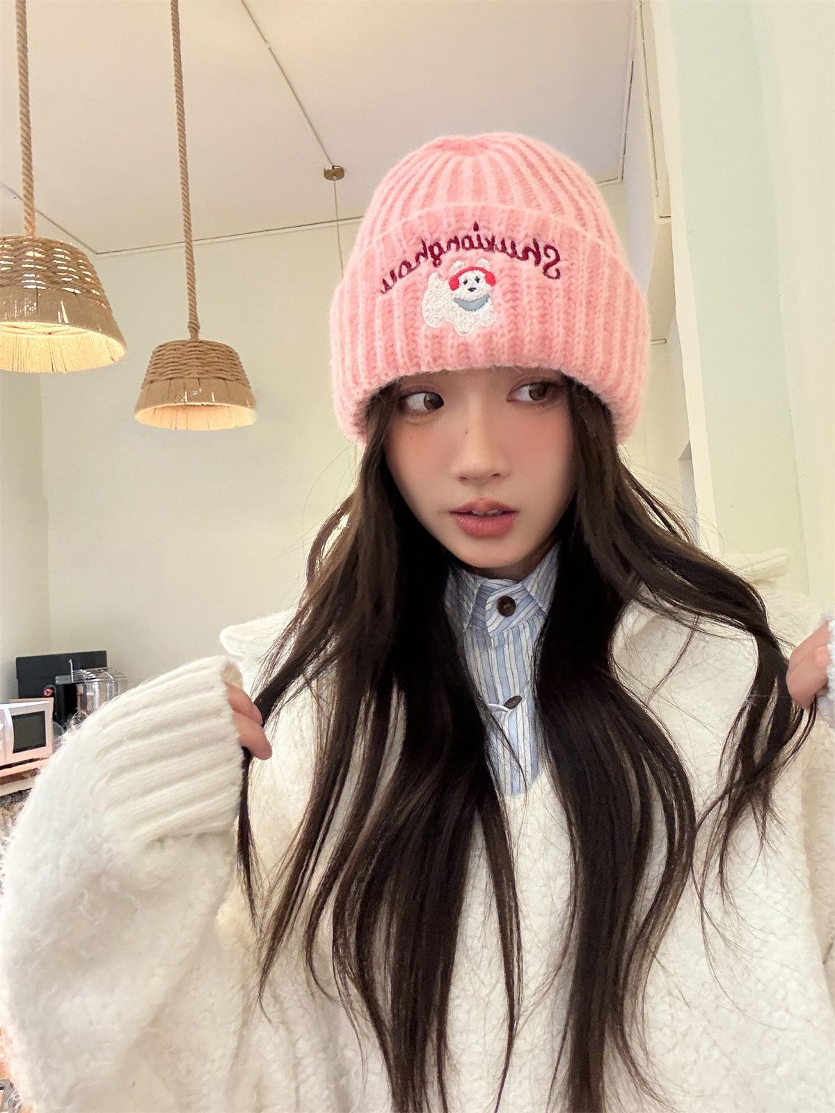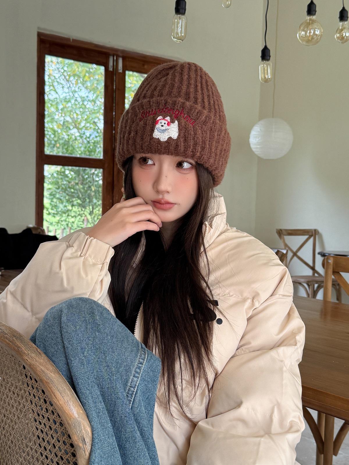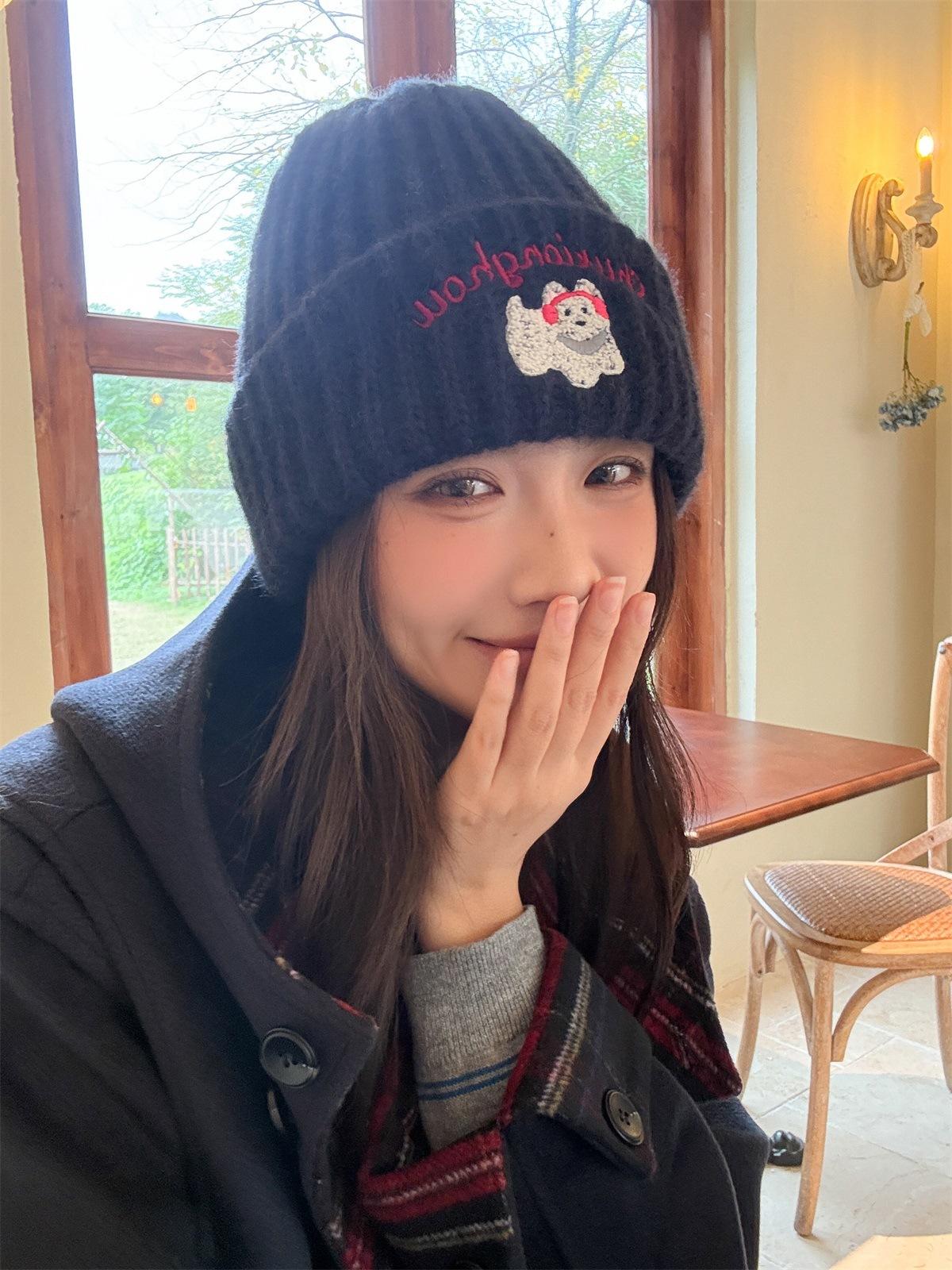 Sombrero de Lana Bordado de Cachorro Japonés Dulce y Lindo para Niños Otoño e Invierno Cara Pequeña Gorro de Punto Cálido con Protección para las Orejas