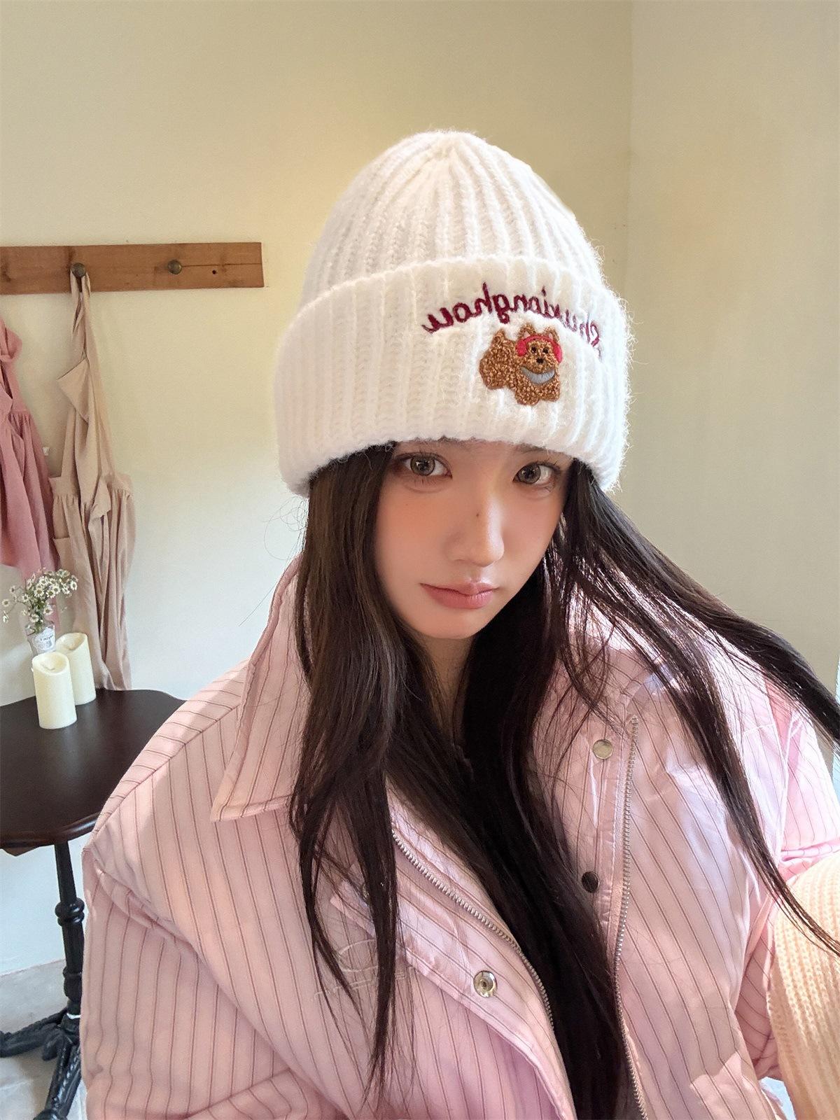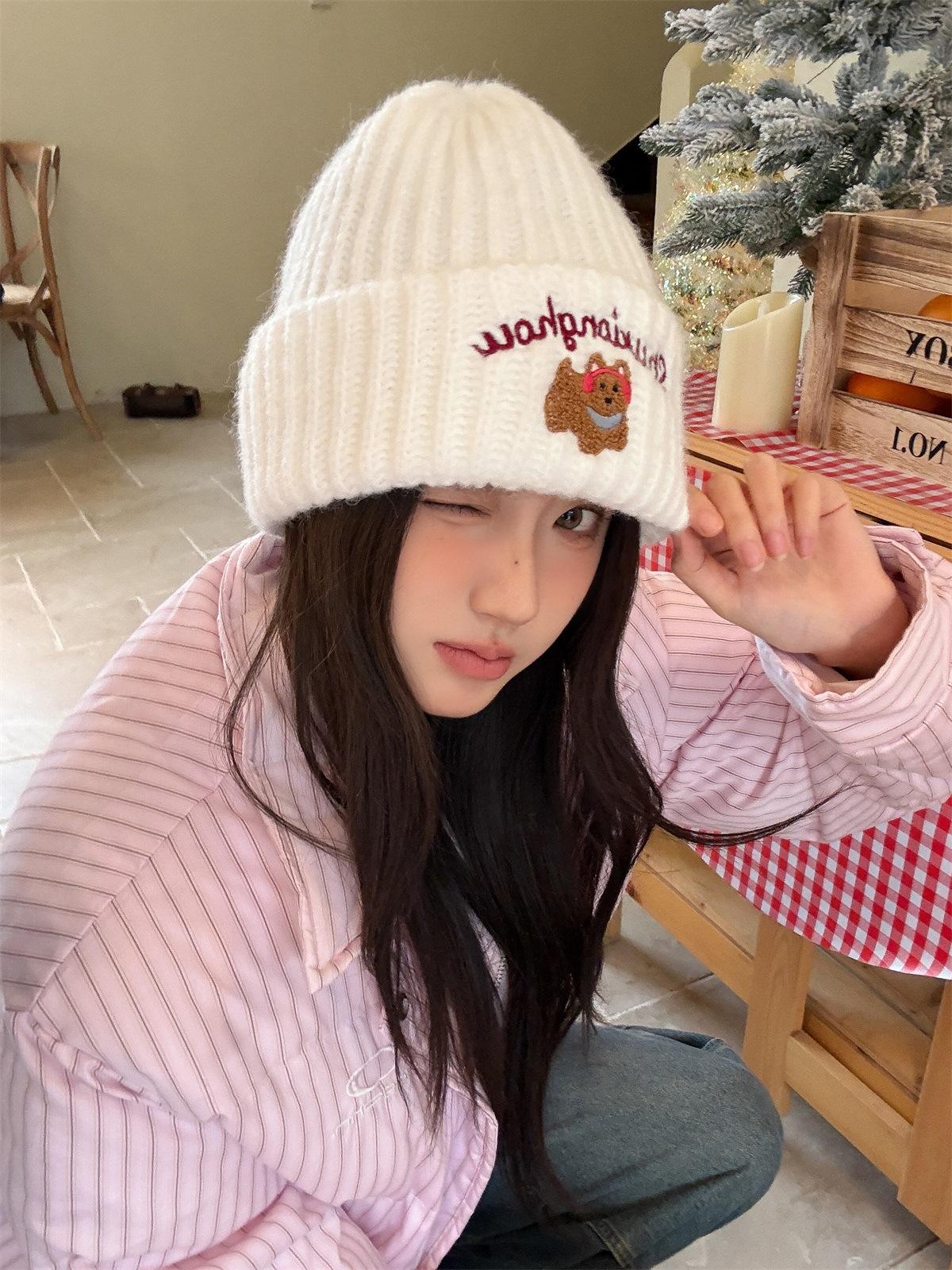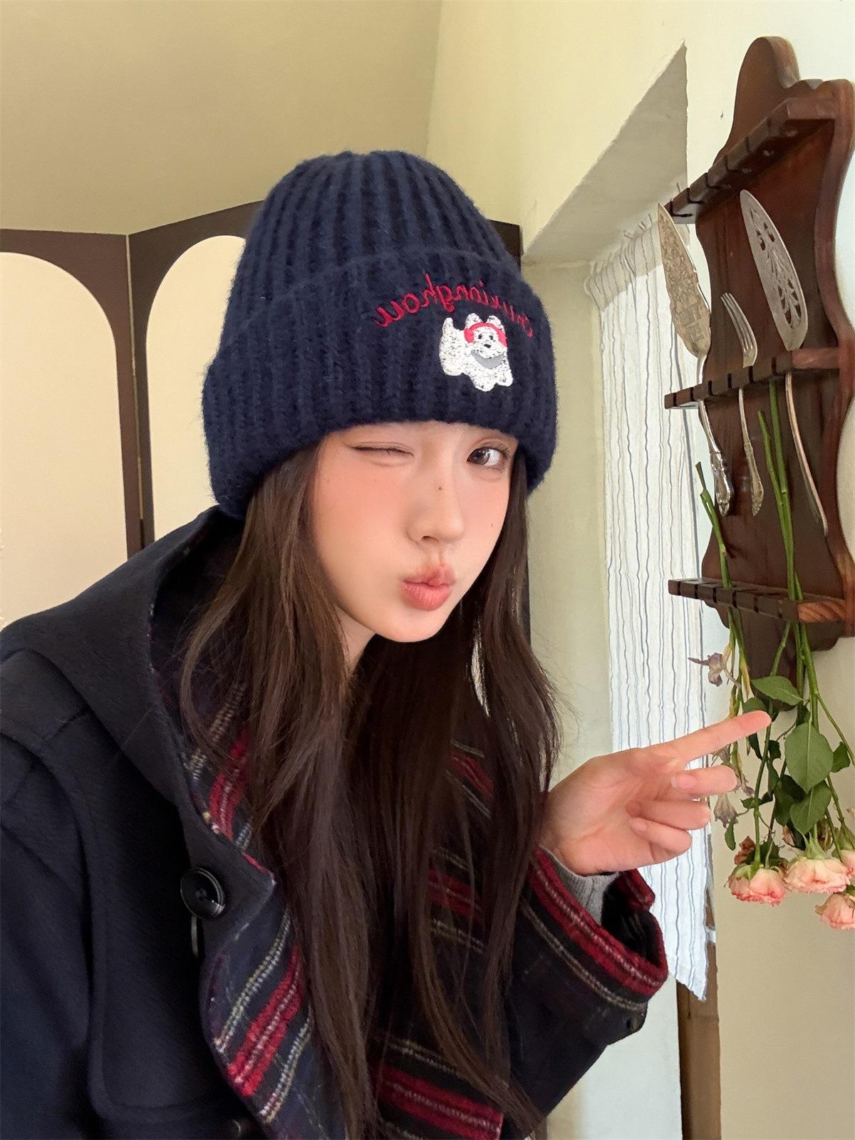 Sombrero de Lana Bordado de Cachorro Japonés Dulce y Lindo para Niños Otoño e Invierno Cara Pequeña Gorro de Punto Cálido con Protección para las Orejas