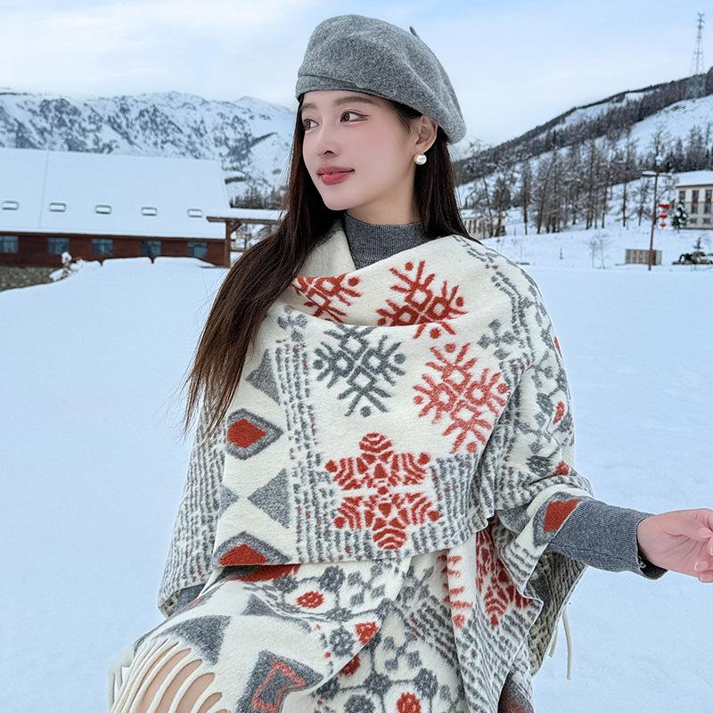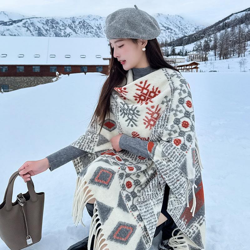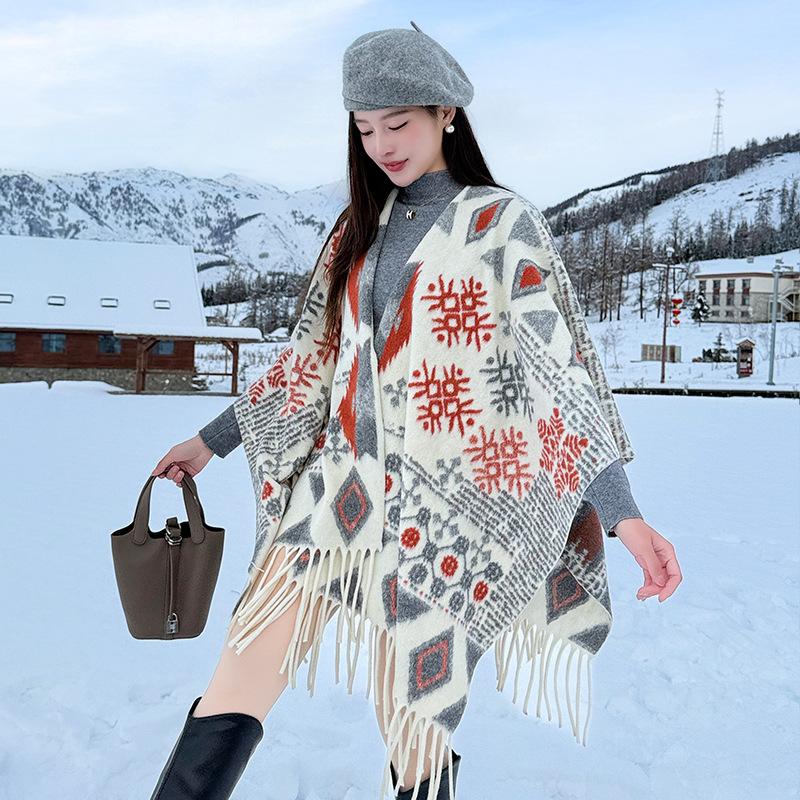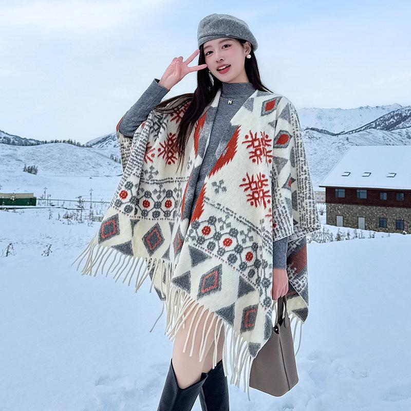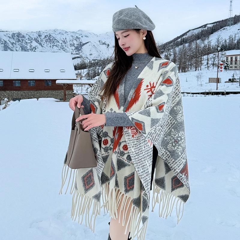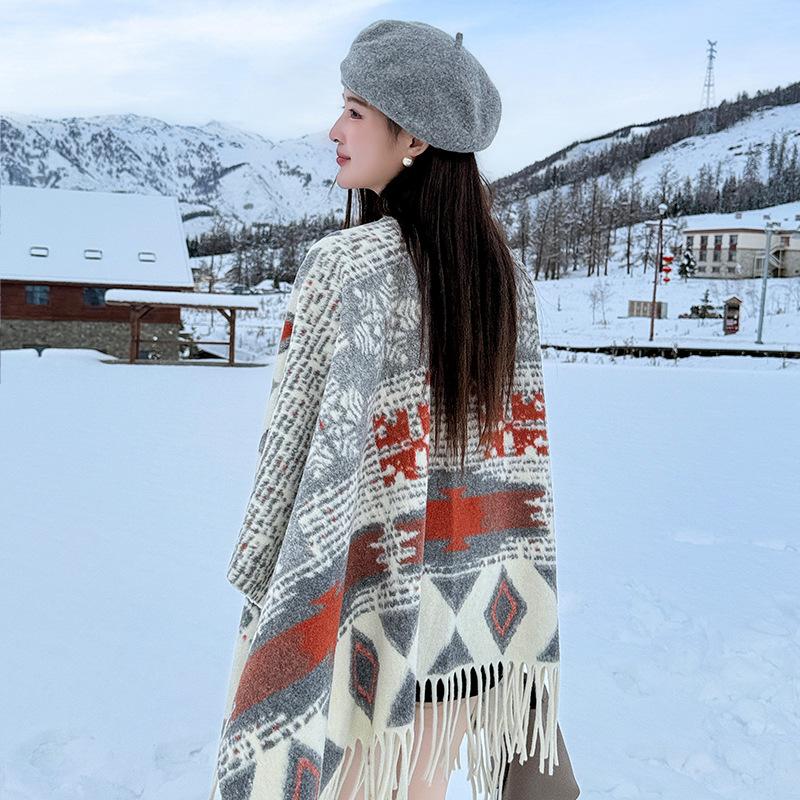 Poncho Étnico con Borlas Abrigo Chal Bufanda Otoño e Invierno para Mujer Turismo Xinjiang Xizang Ala Exterior Bufanda de Cachemira