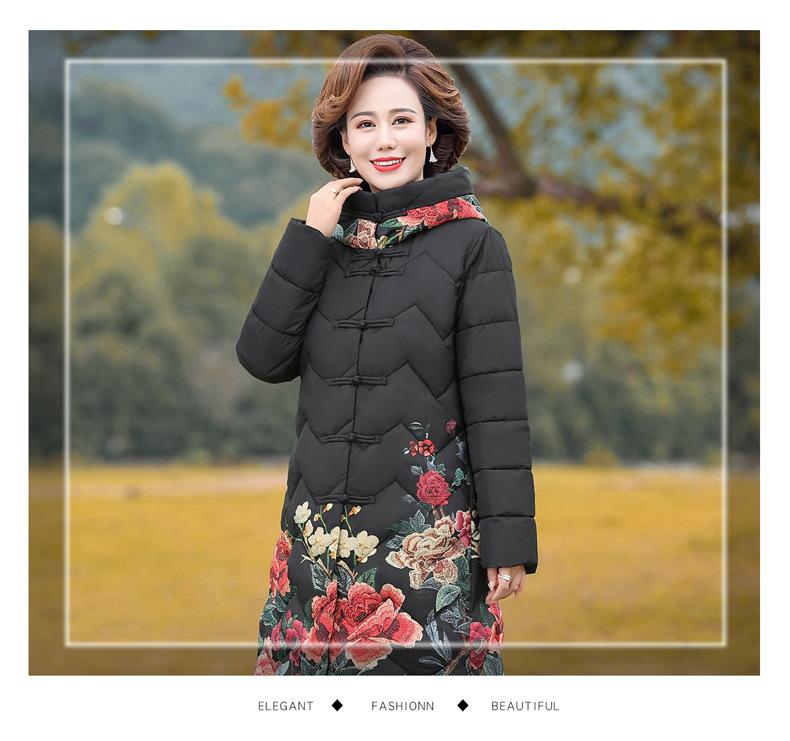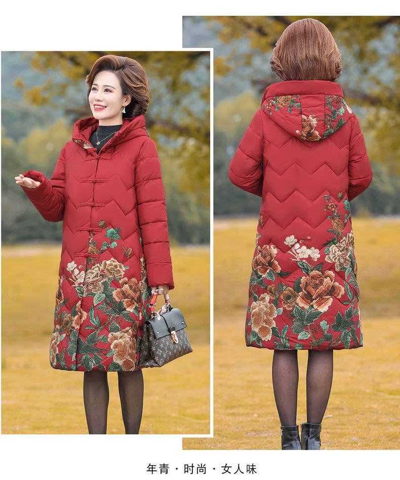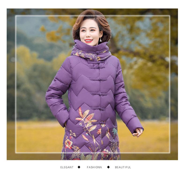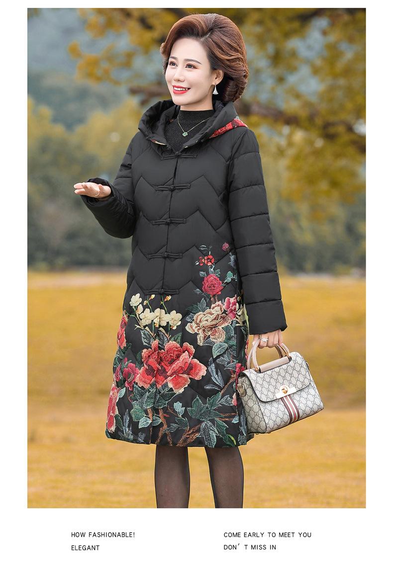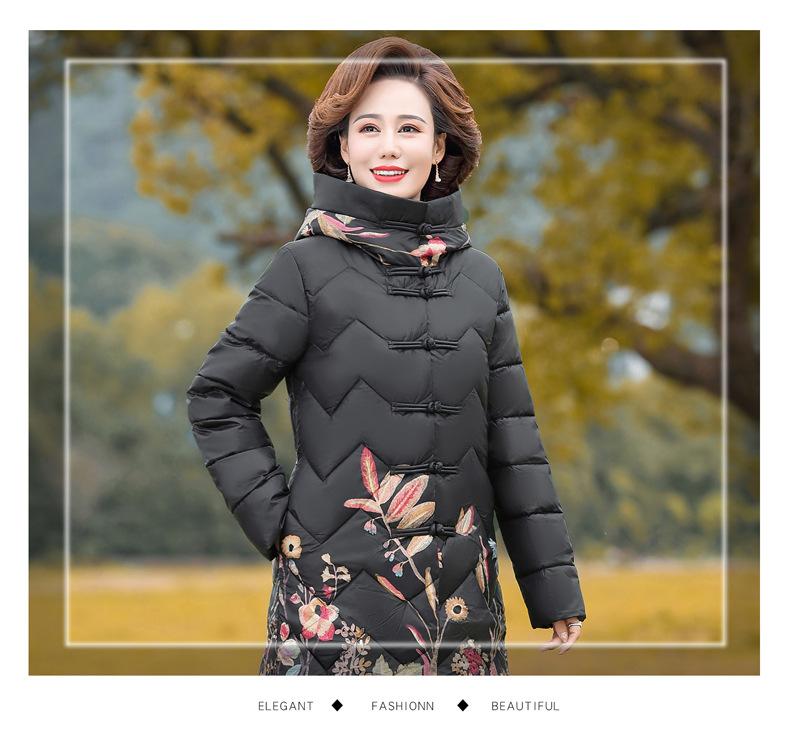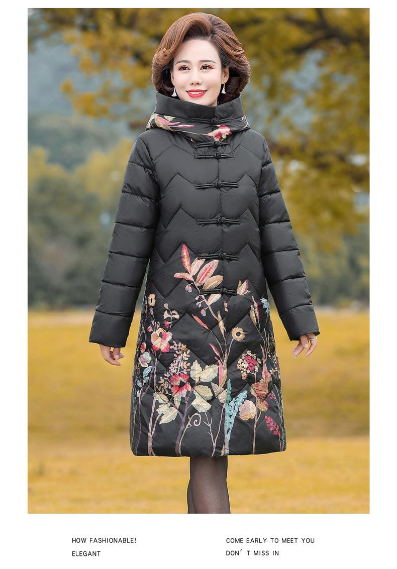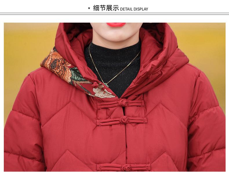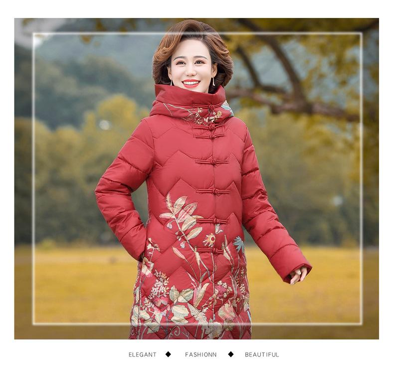 Abrigo de invierno para mamá acolchado de algodón con plumón, largo medio sobre la rodilla, grueso, para mujeres de mediana edad y mayores, abrigo de otoño e invierno, estilo étnico con hebilla