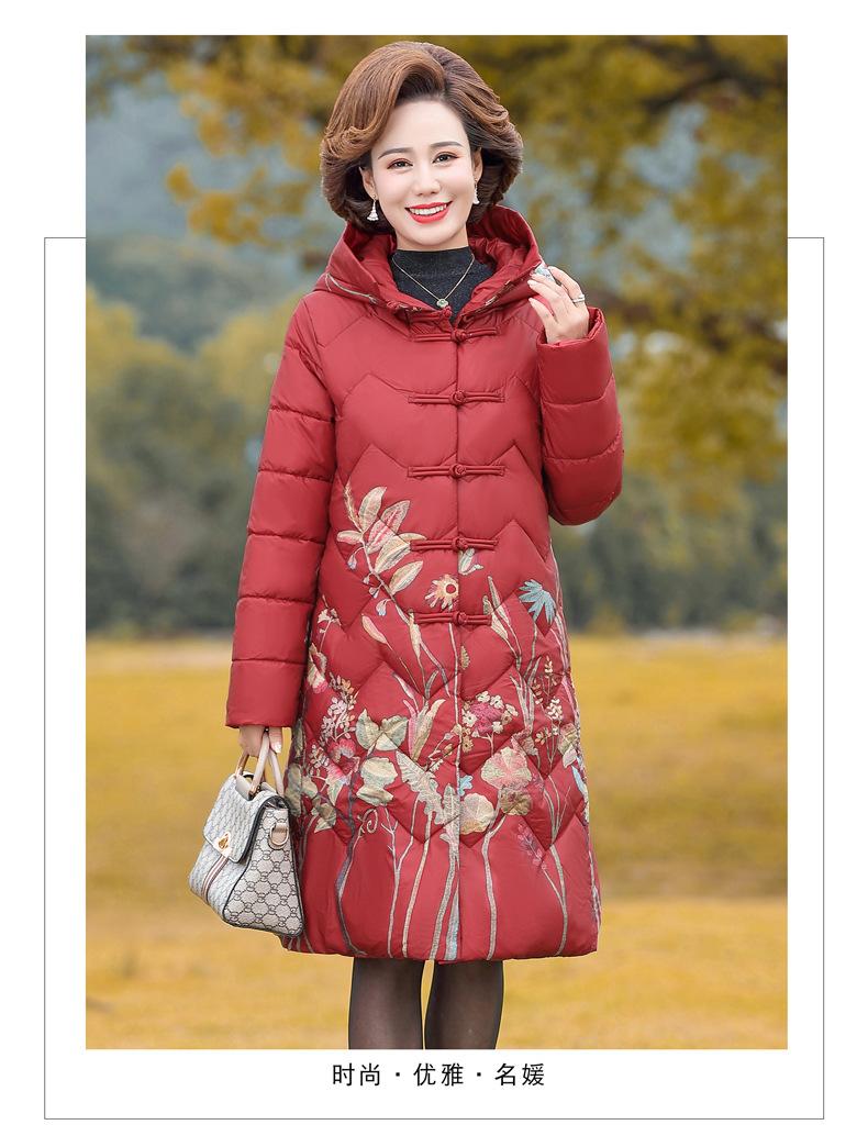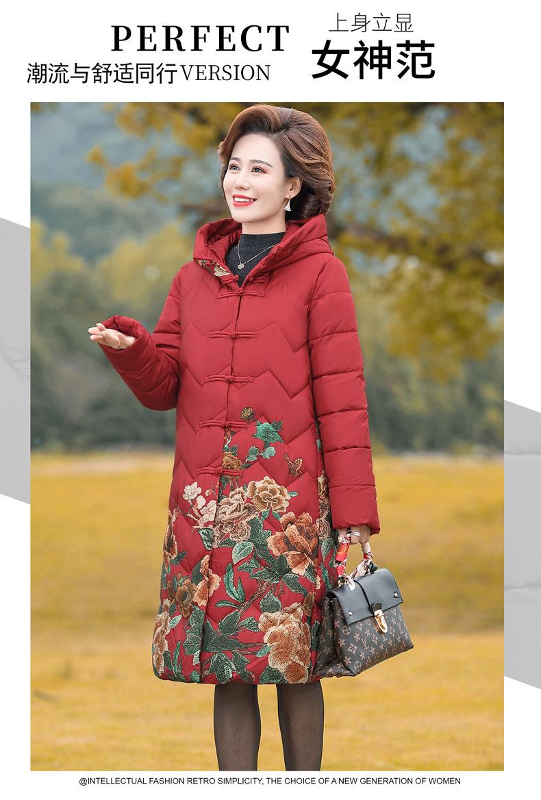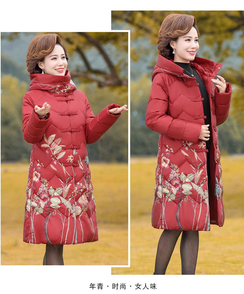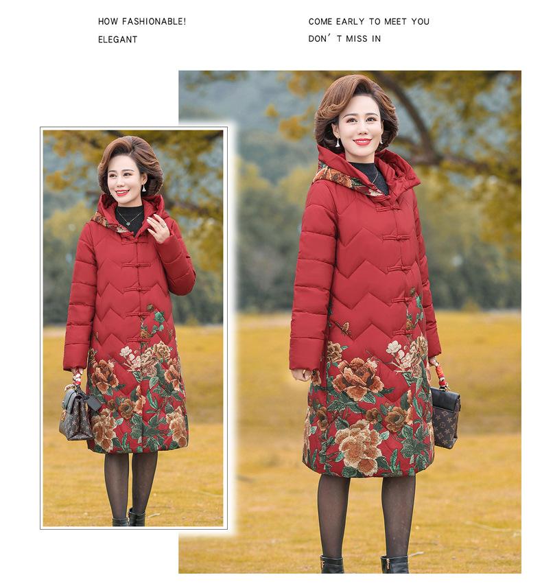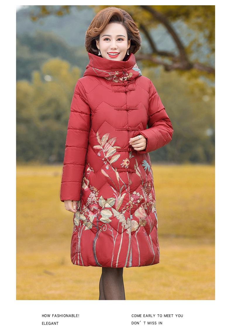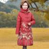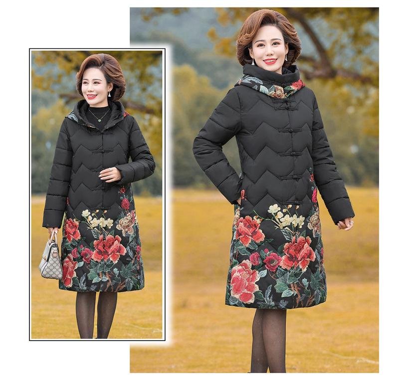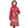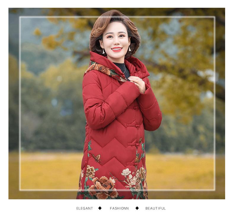 Abrigo de invierno para mamá acolchado de algodón con plumón, largo medio sobre la rodilla, grueso, para mujeres de mediana edad y mayores, abrigo de otoño e invierno, estilo étnico con hebilla