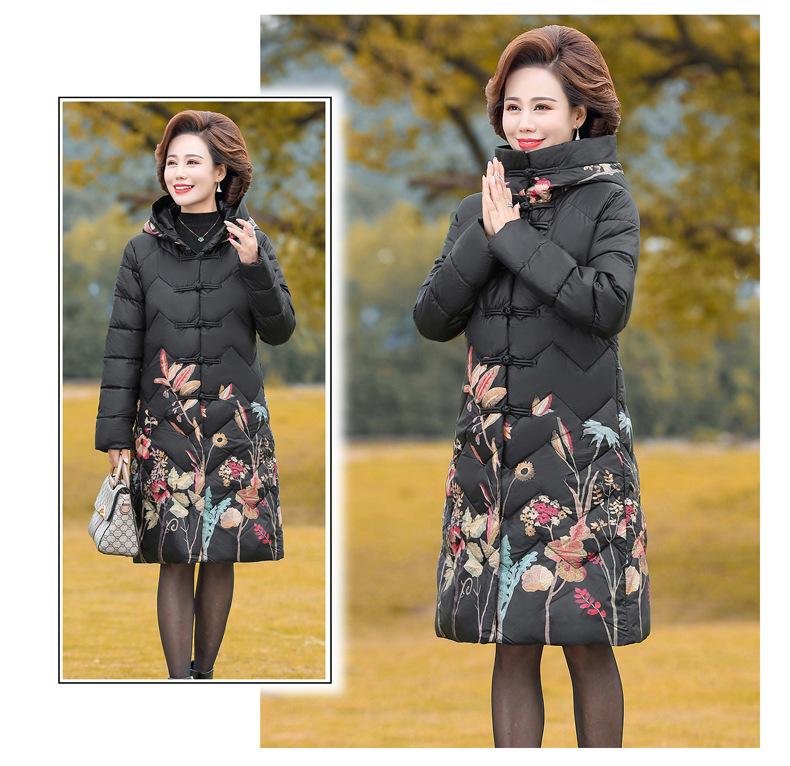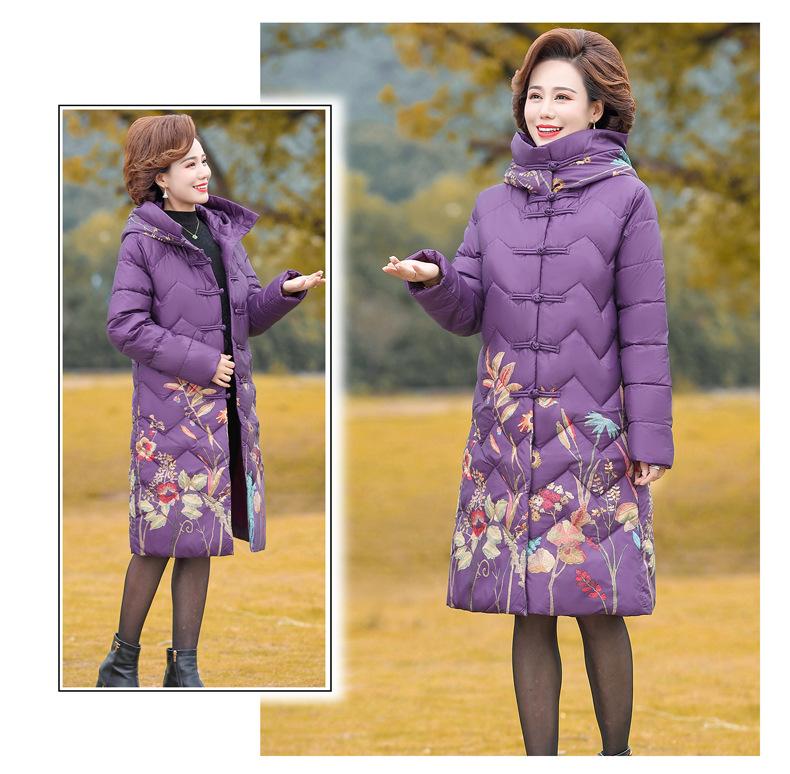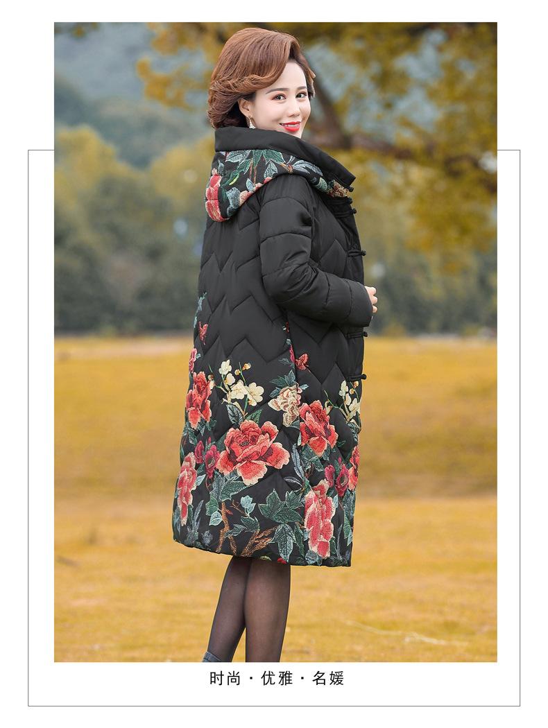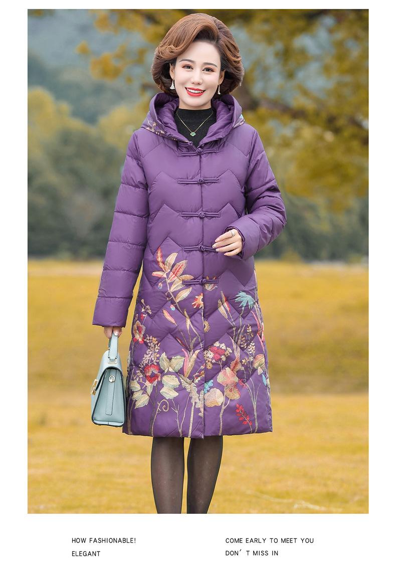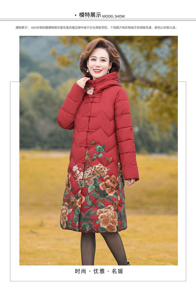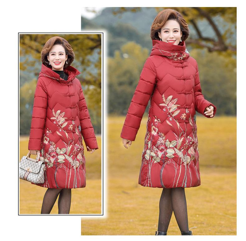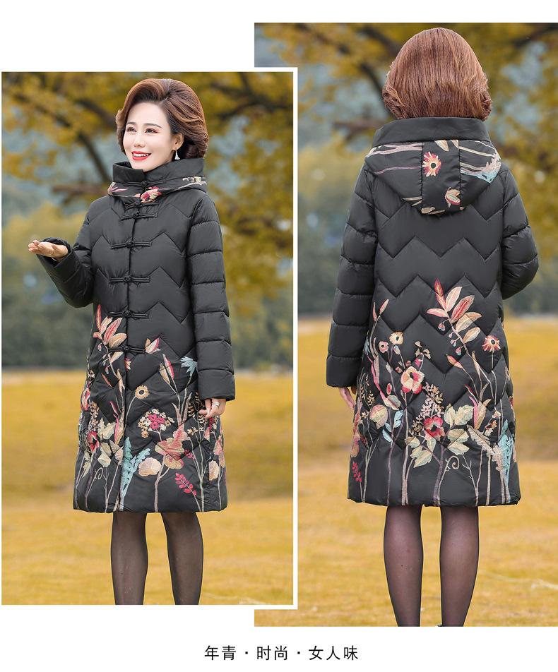 Abrigo de invierno para mamá acolchado de algodón con plumón, largo medio sobre la rodilla, grueso, para mujeres de mediana edad y mayores, abrigo de otoño e invierno, estilo étnico con hebilla