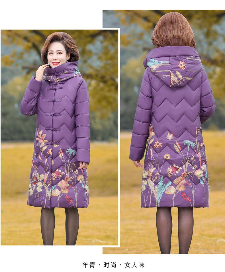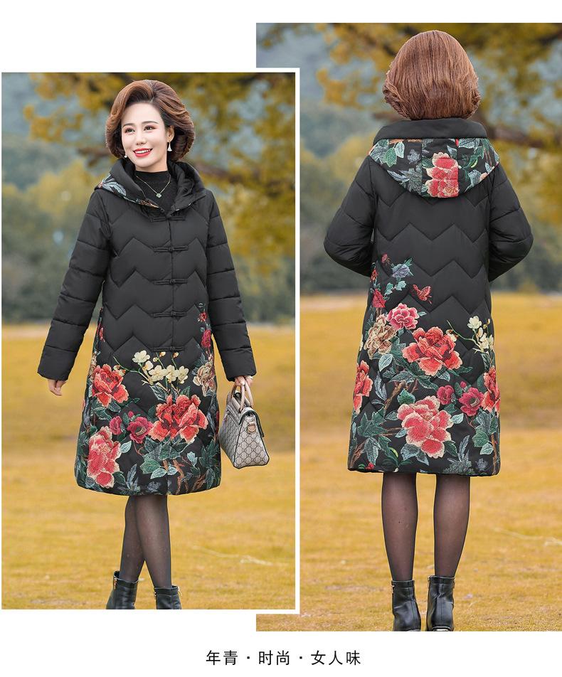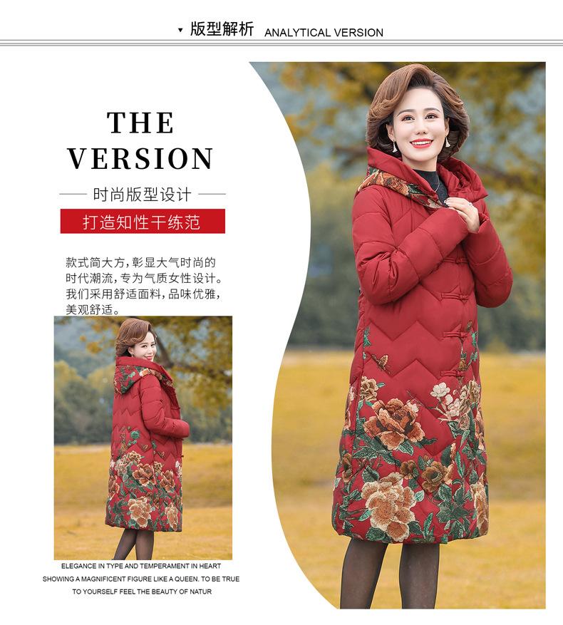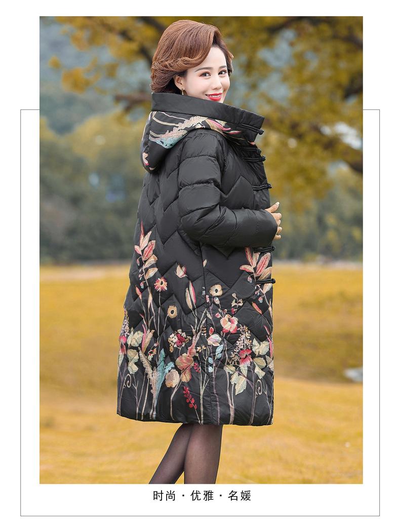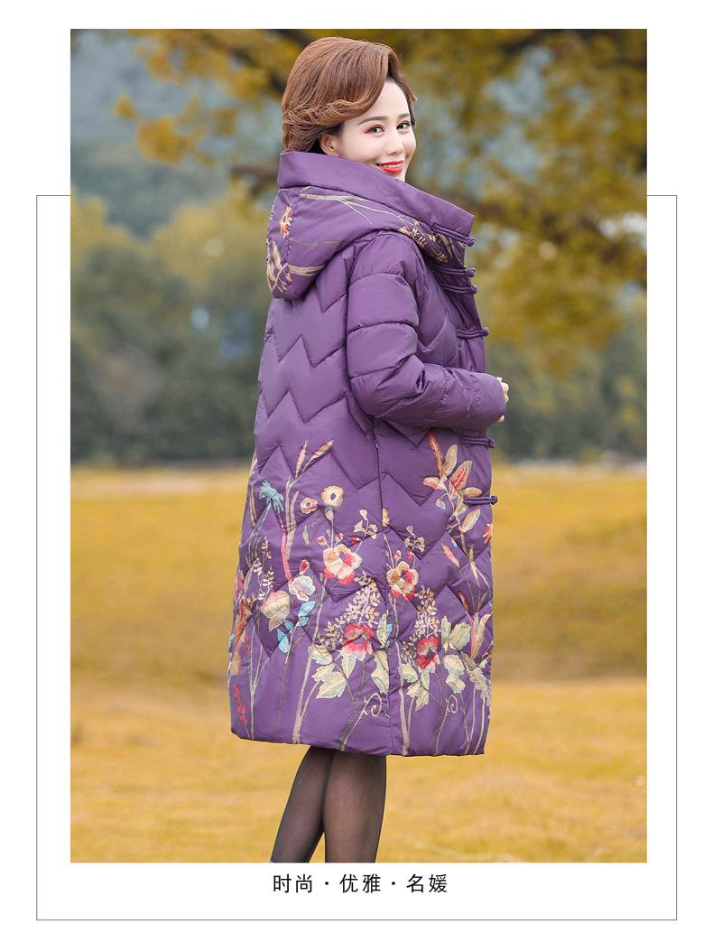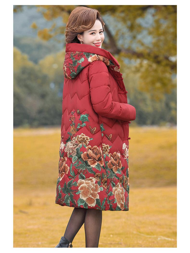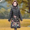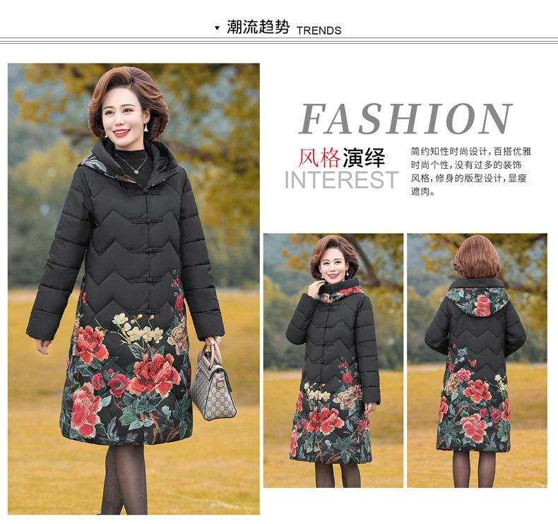 Abrigo de invierno para mamá acolchado de algodón con plumón, largo medio sobre la rodilla, grueso, para mujeres de mediana edad y mayores, abrigo de otoño e invierno, estilo étnico con hebilla