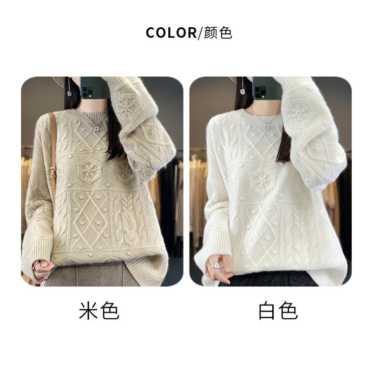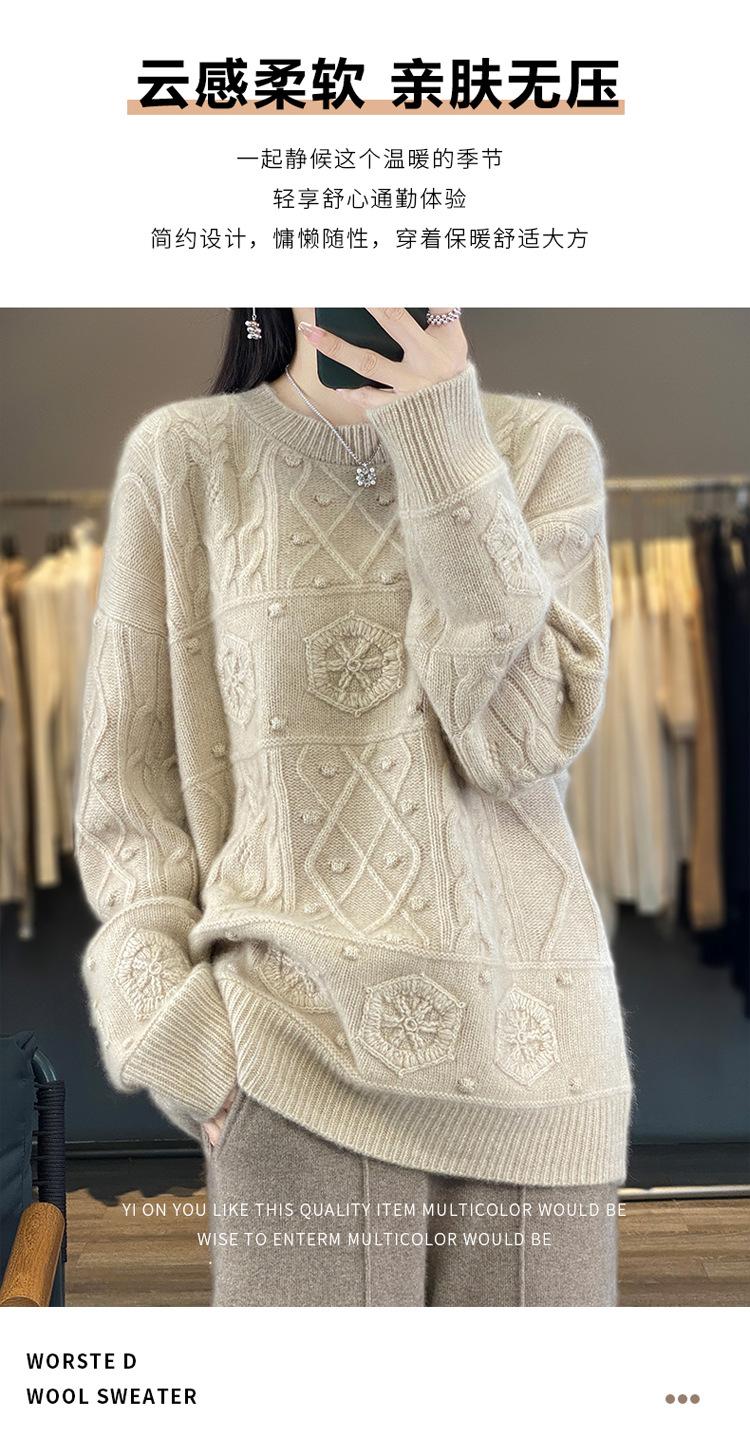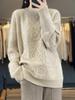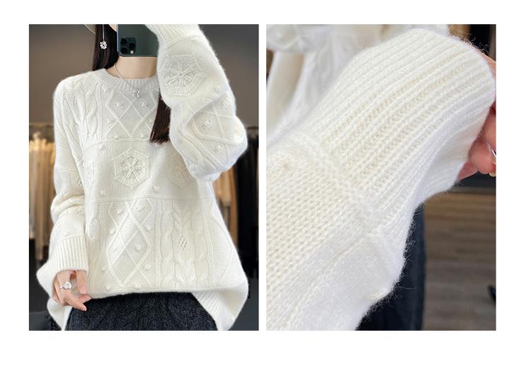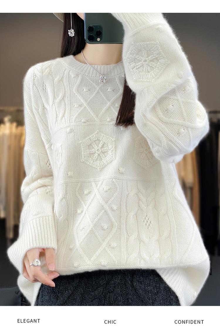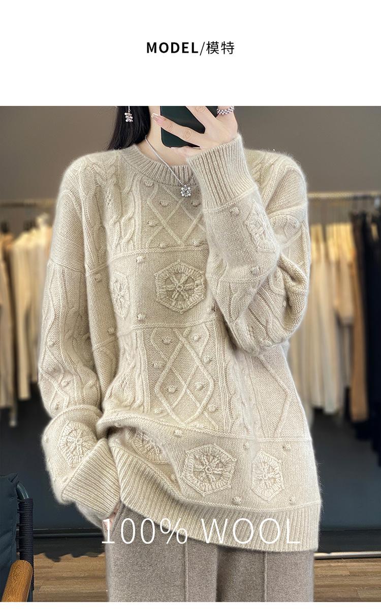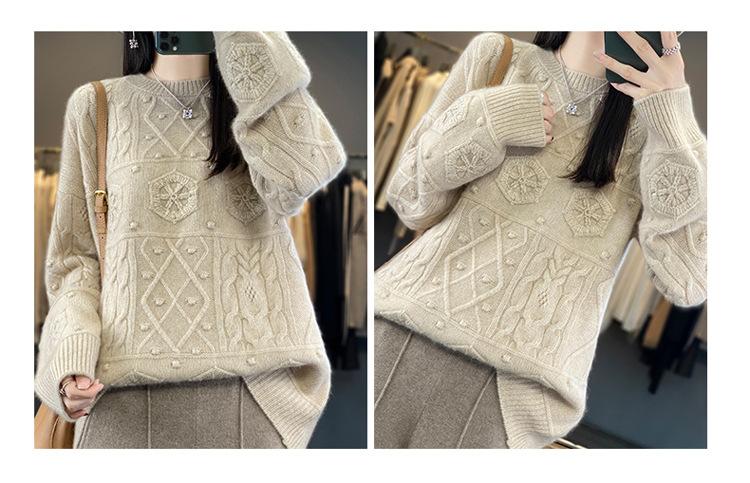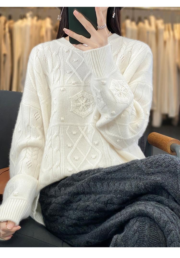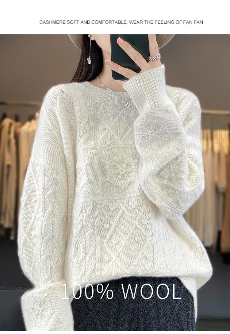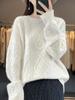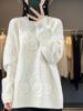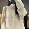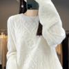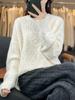 Suéter de punto holgado e informal de color sólido con cuello redondo de lana completa y trenzado de diamante para mujer de otoño e invierno de 2023