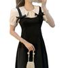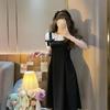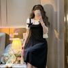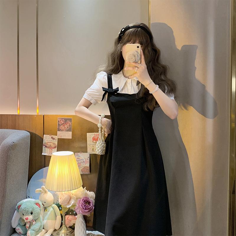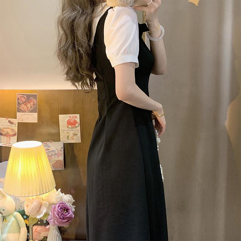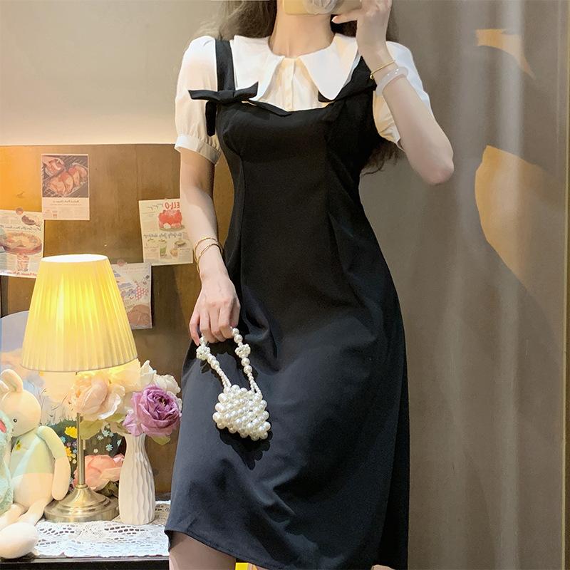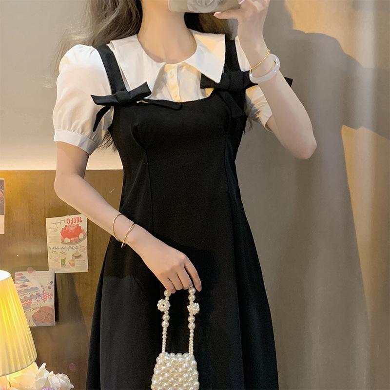 Vestido nuevo de verano 2023, estilo académico, estilo coreano, estilo francés, retro, falso, de dos piezas, con lazo y manga corta.