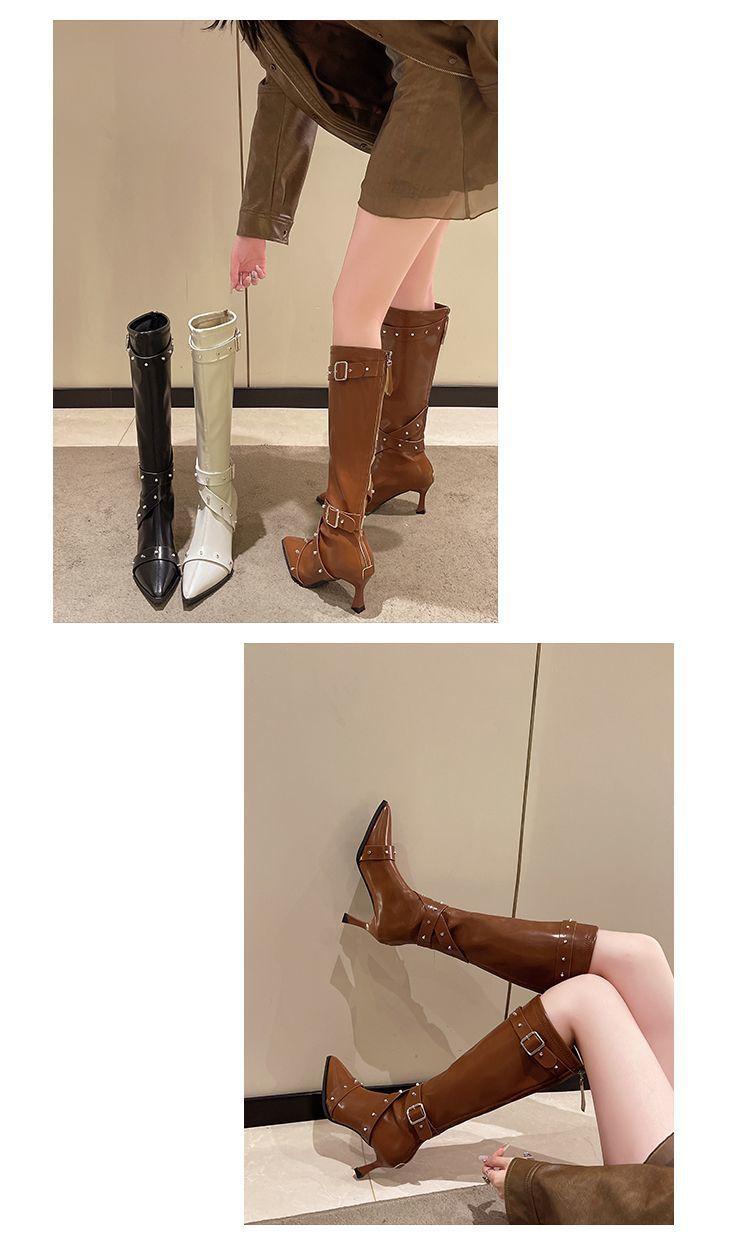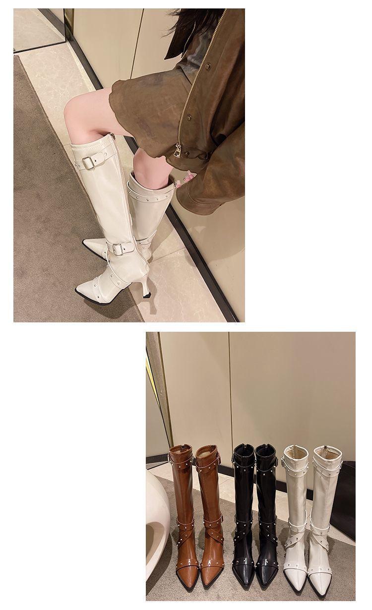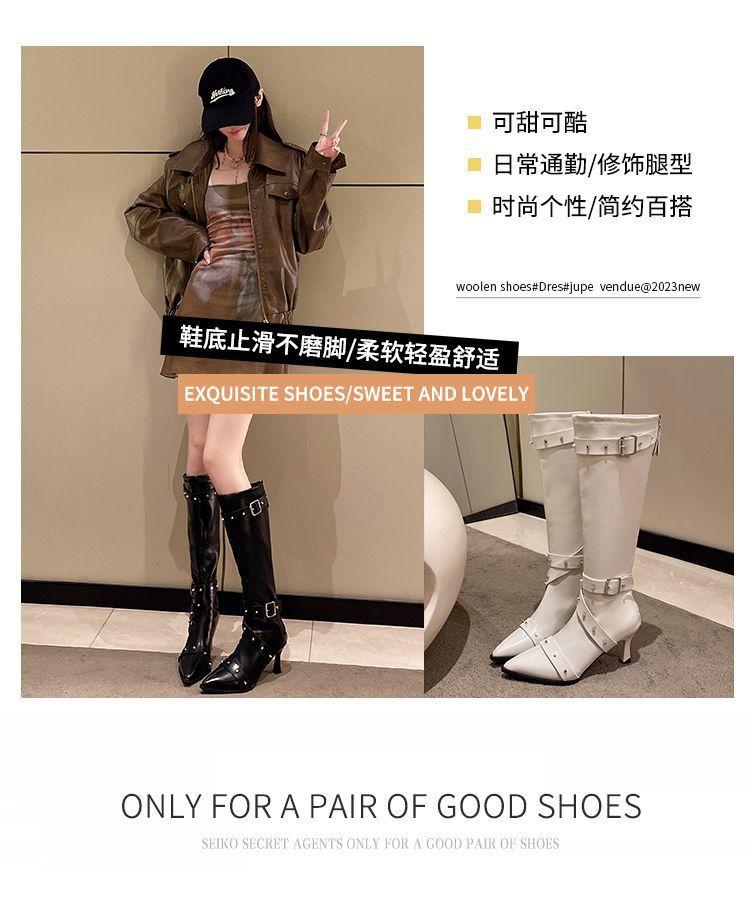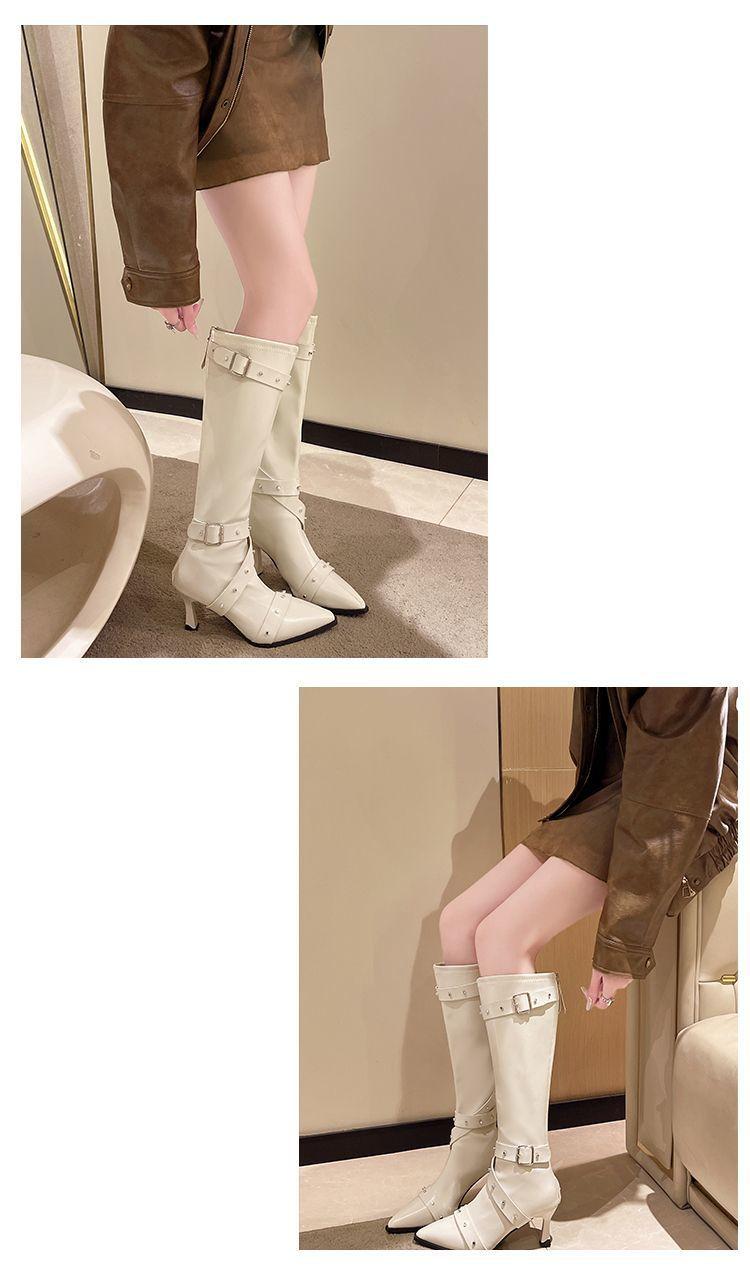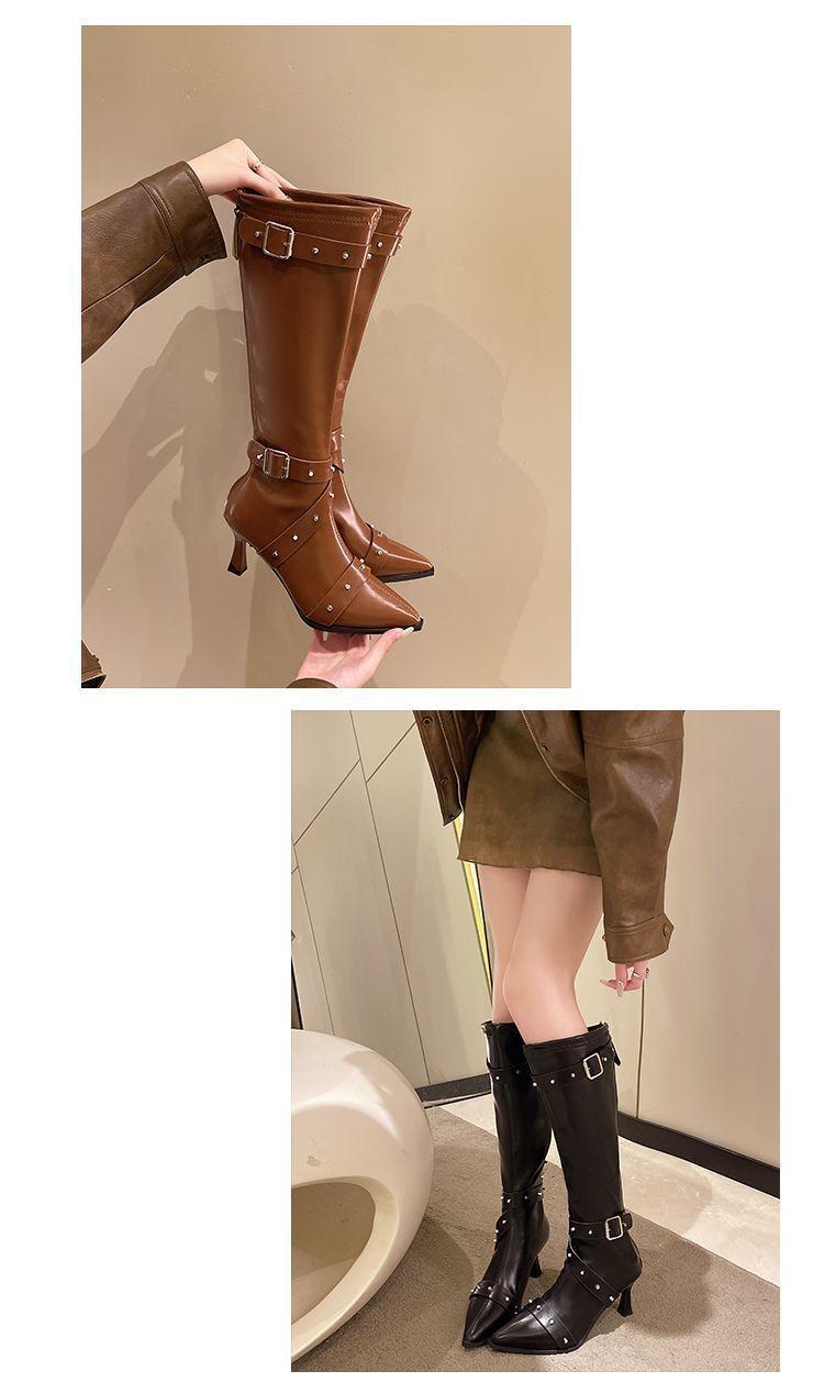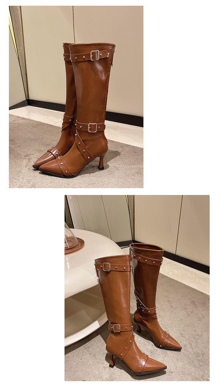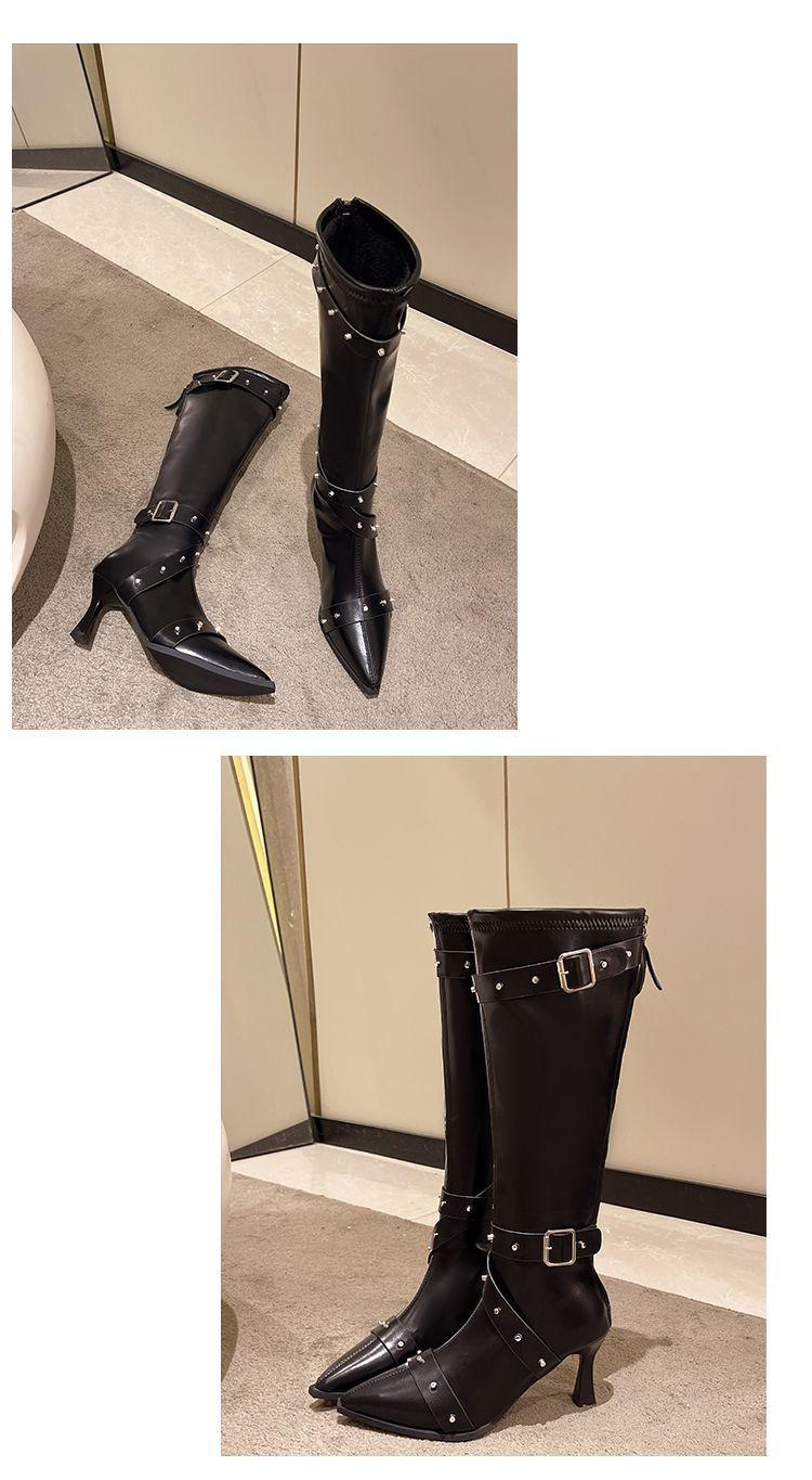 Botas altas con hebilla de cinturón y remaches para otoño e invierno, zapatos de mujer de punta puntiaguda, botas finas elásticas de tacón fino, botas largas