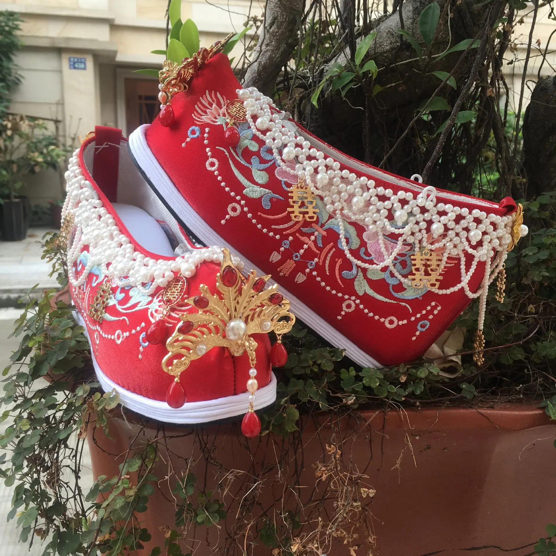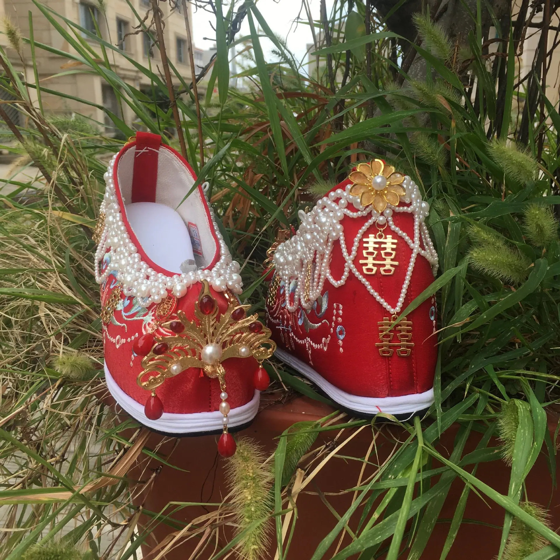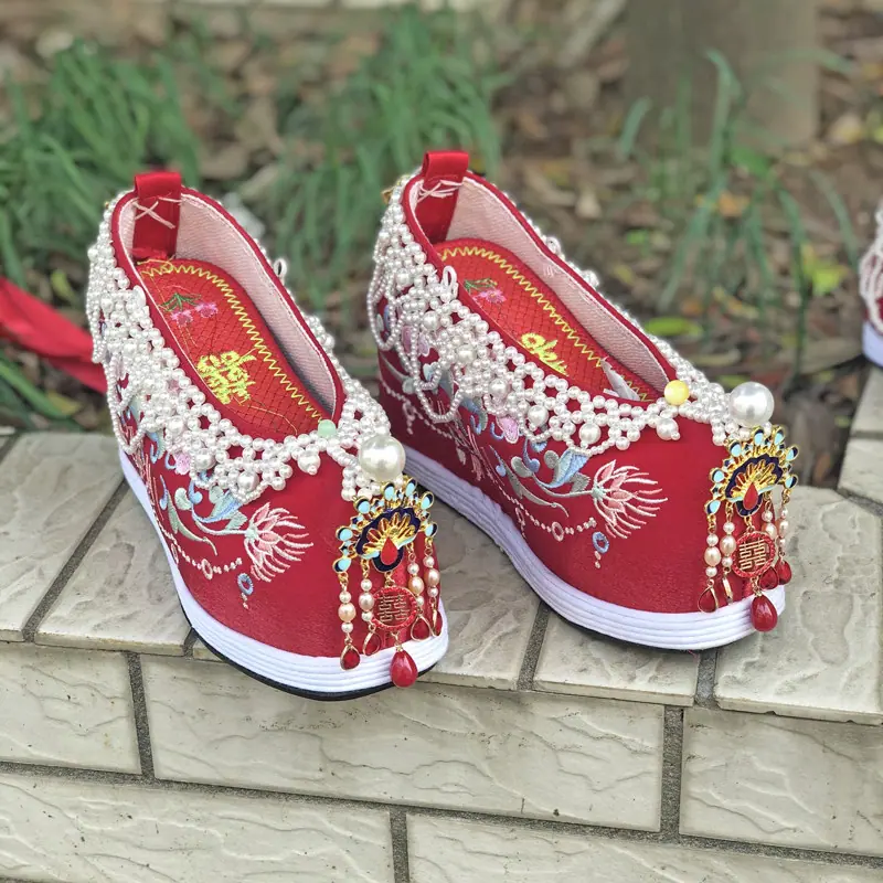 Zapatos Hanfu Originales de Estilo Chino Tradicional para Mujer, Zapatos de Boda Xiuhe Estilo Chino con Tacón Oculto, Zapatos Bordados con Perlas de Punta Fina, Estilo Ming 9cm