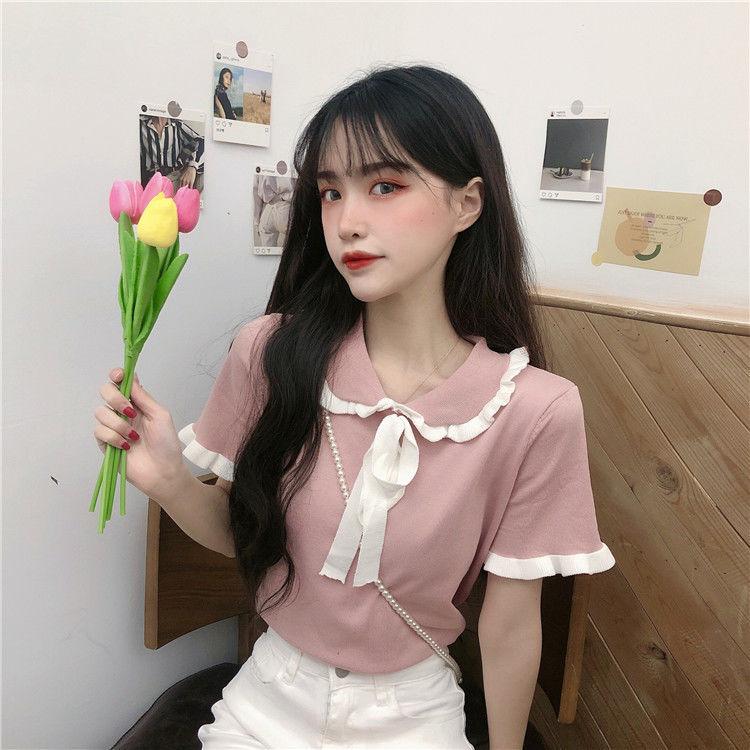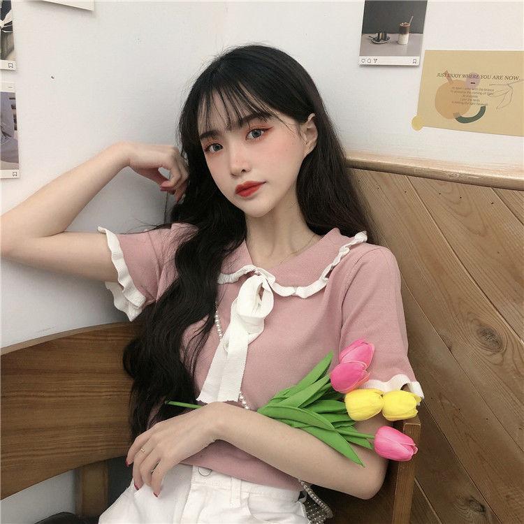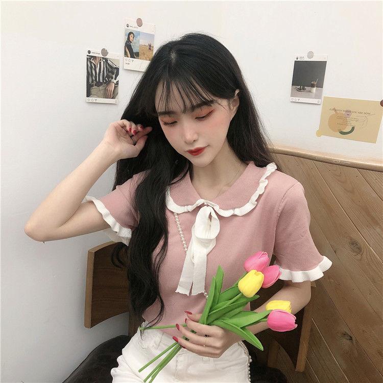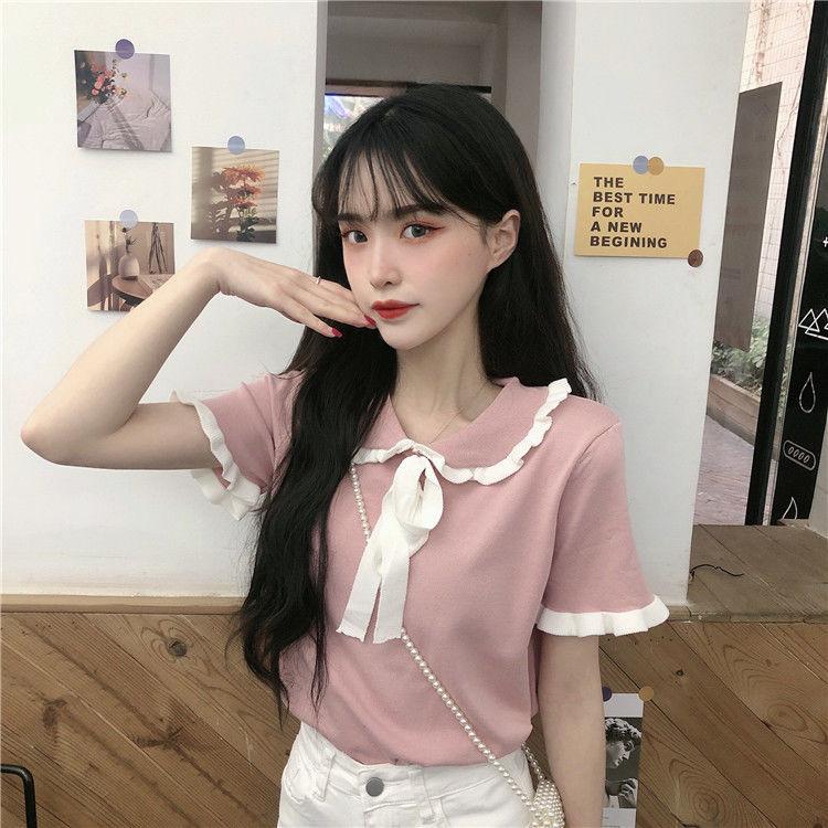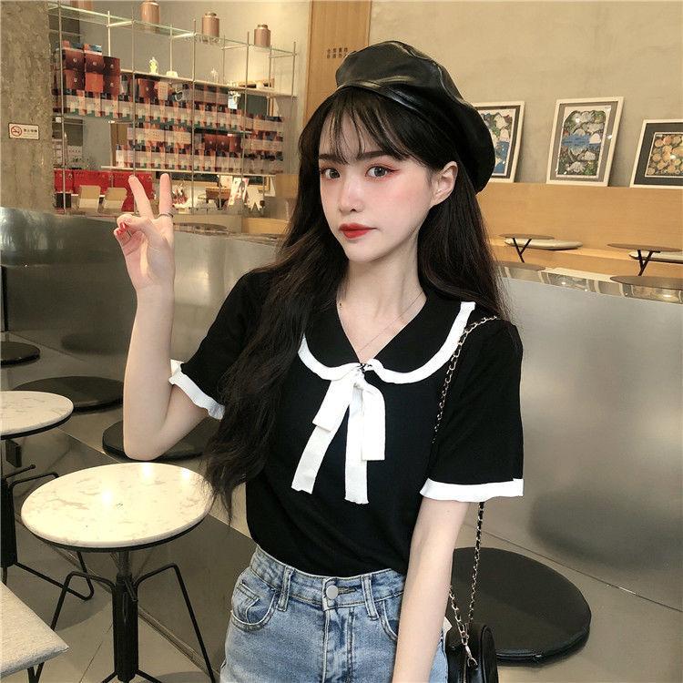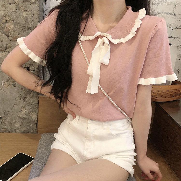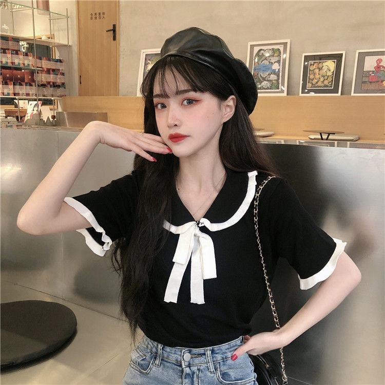 Verano 2021 Nuevo Color Combinado Solapa Oreja de Madera Manga Corta Camisa con Forro Reductora de Edad Top con Lazo Camiseta de Punto