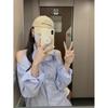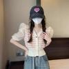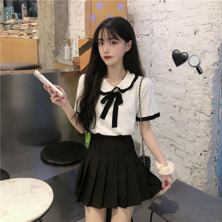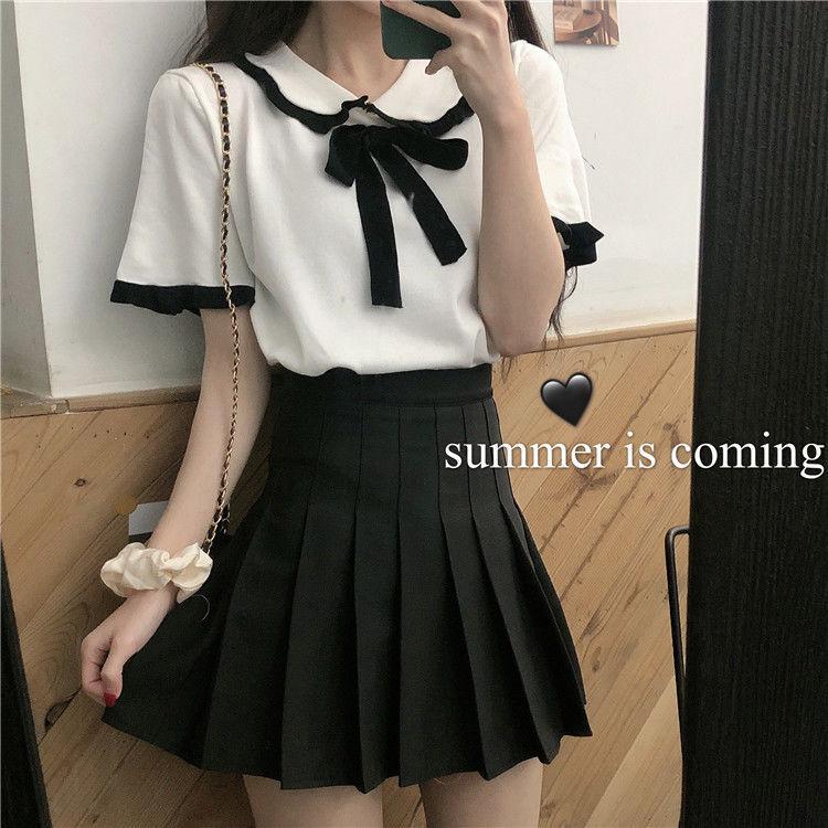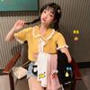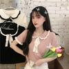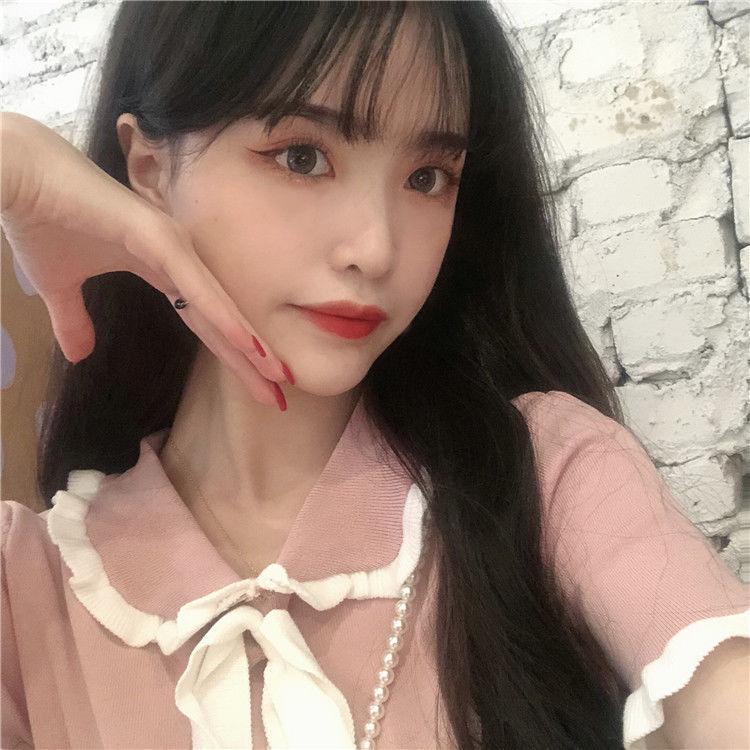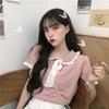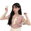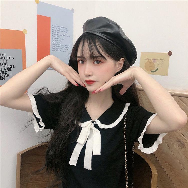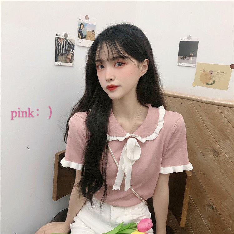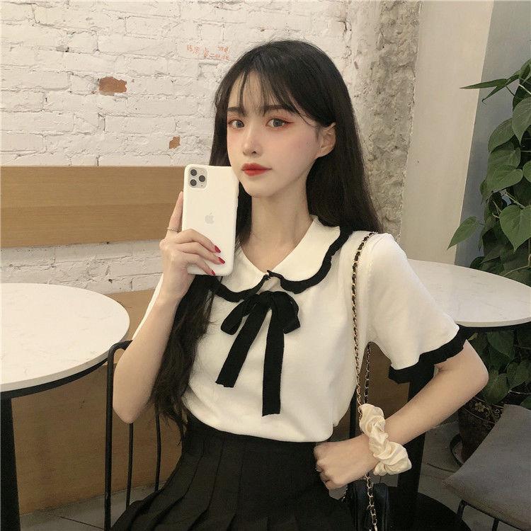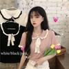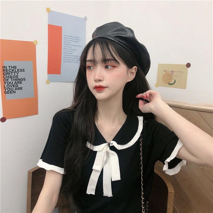 Verano 2021 Nuevo Color Combinado Solapa Oreja de Madera Manga Corta Camisa con Forro Reductora de Edad Top con Lazo Camiseta de Punto