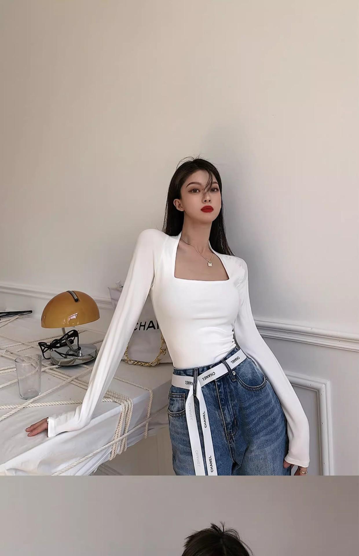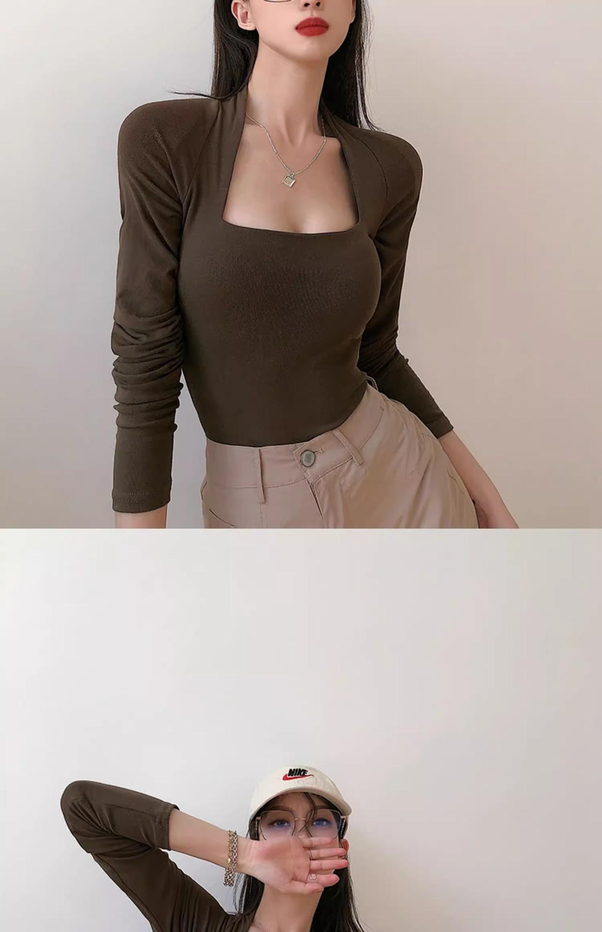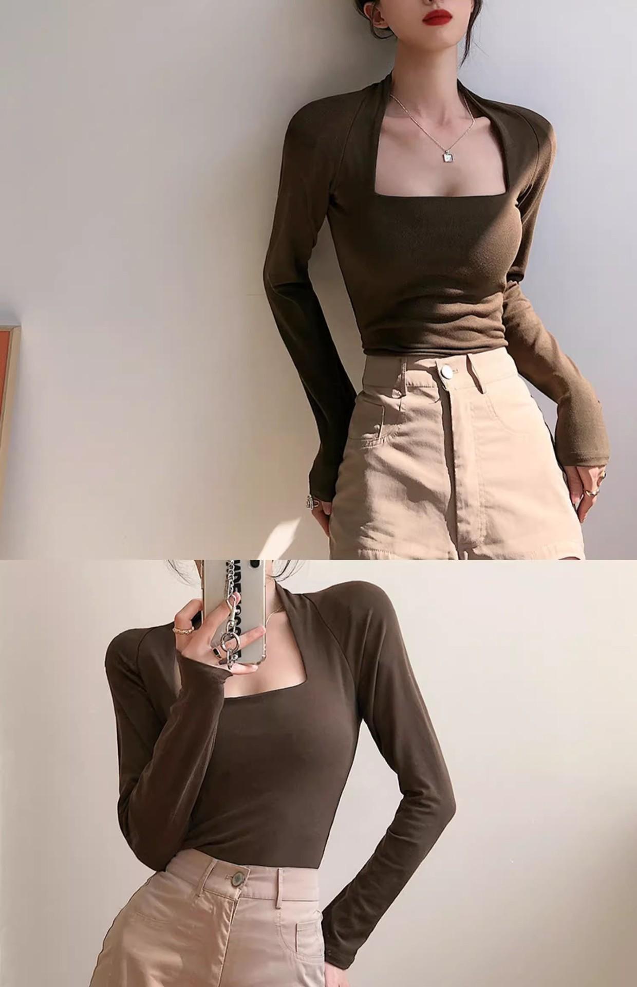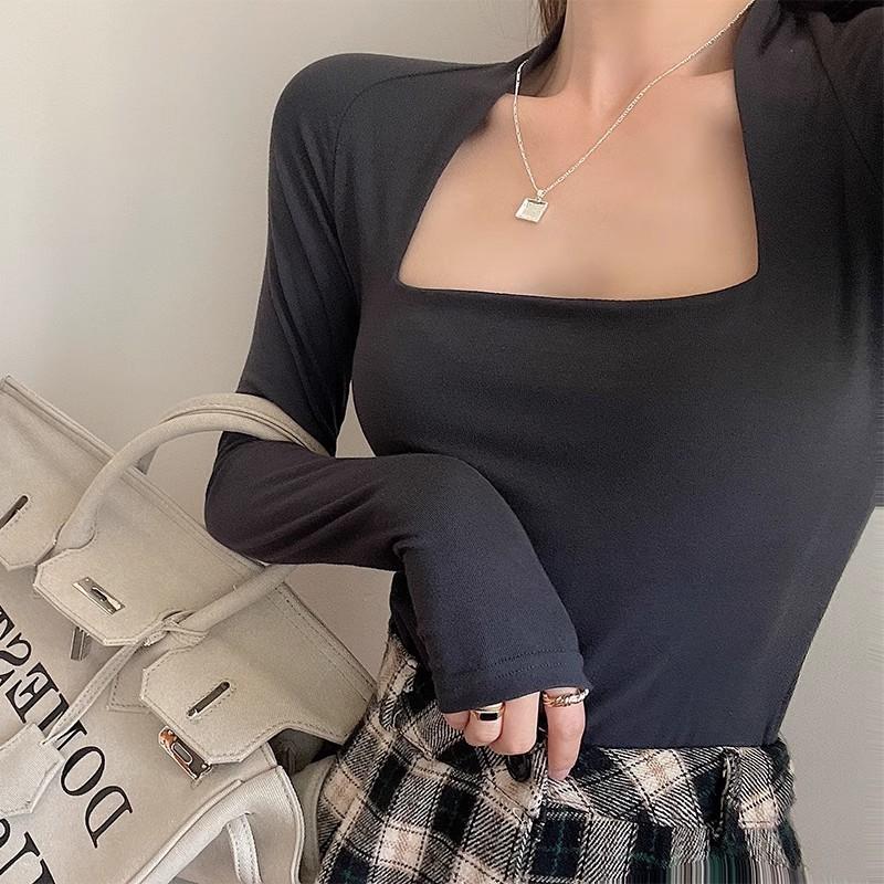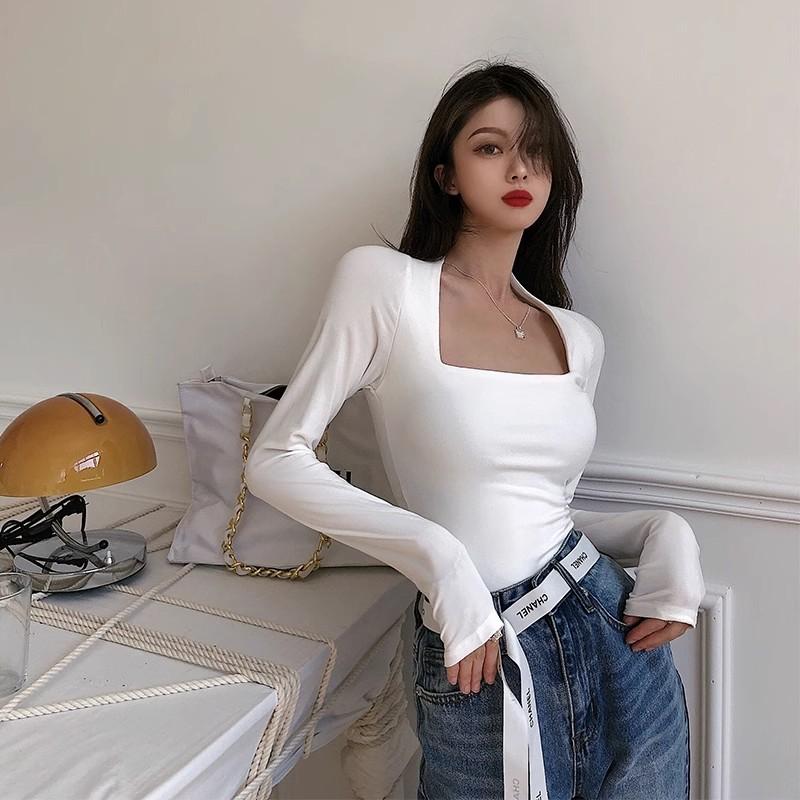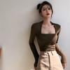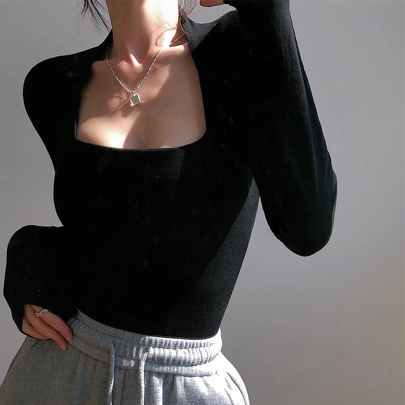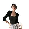 Camiseta básica de manga larga con cuello cuadrado francés de terciopelo acanalado de alta elasticidad, diseño adelgazante Spice Girls Niche Ins Top
