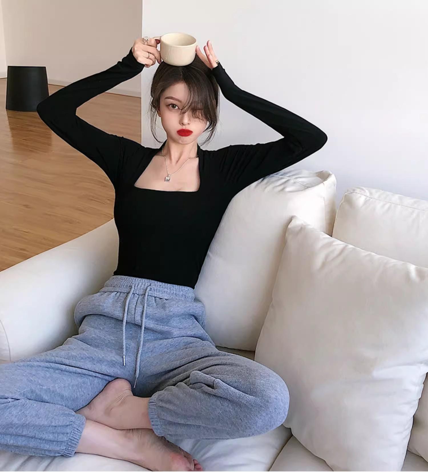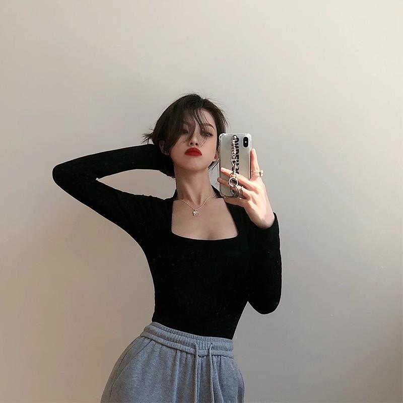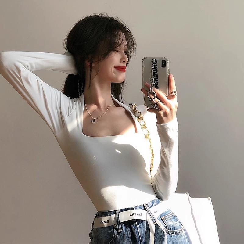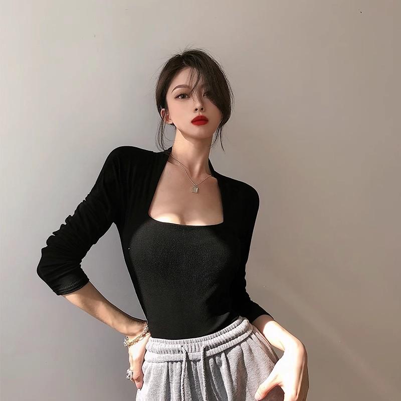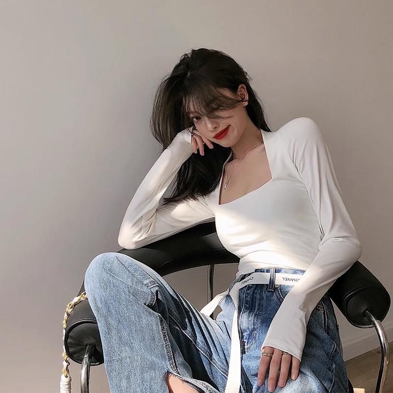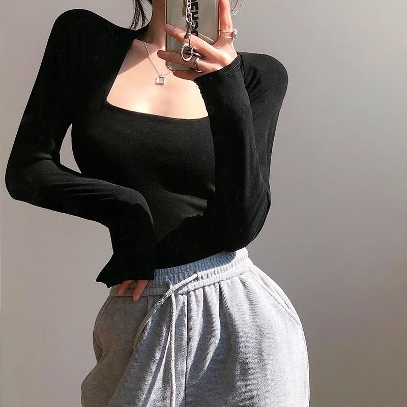 Camiseta básica de manga larga con cuello cuadrado francés de terciopelo acanalado de alta elasticidad, diseño adelgazante Spice Girls Niche Ins Top