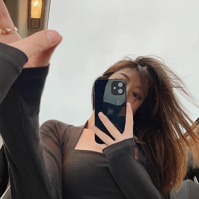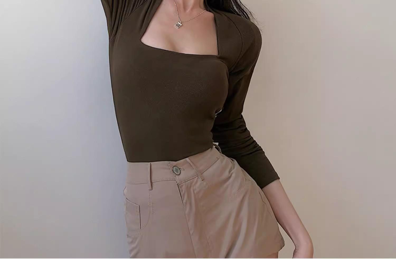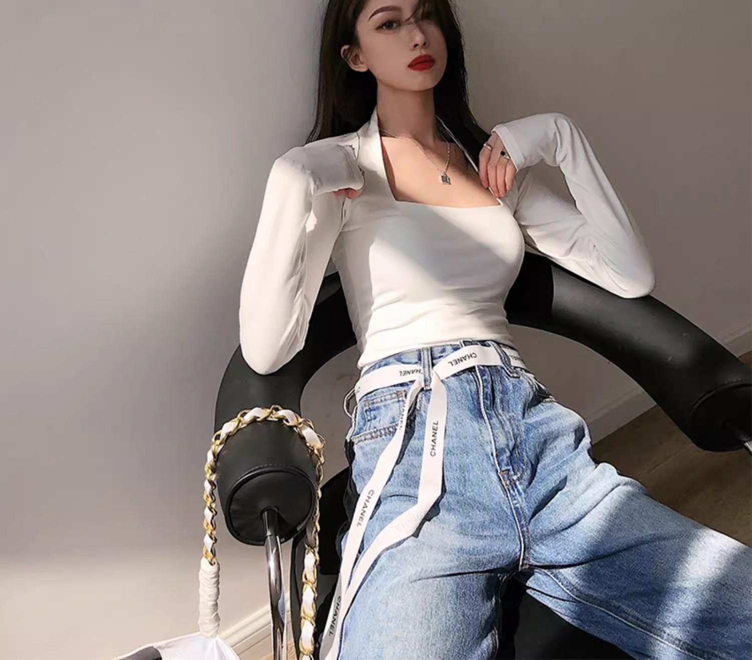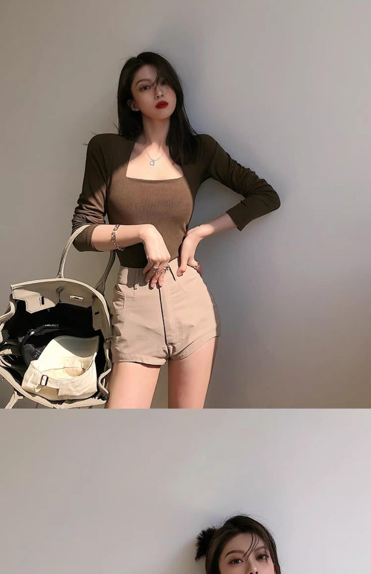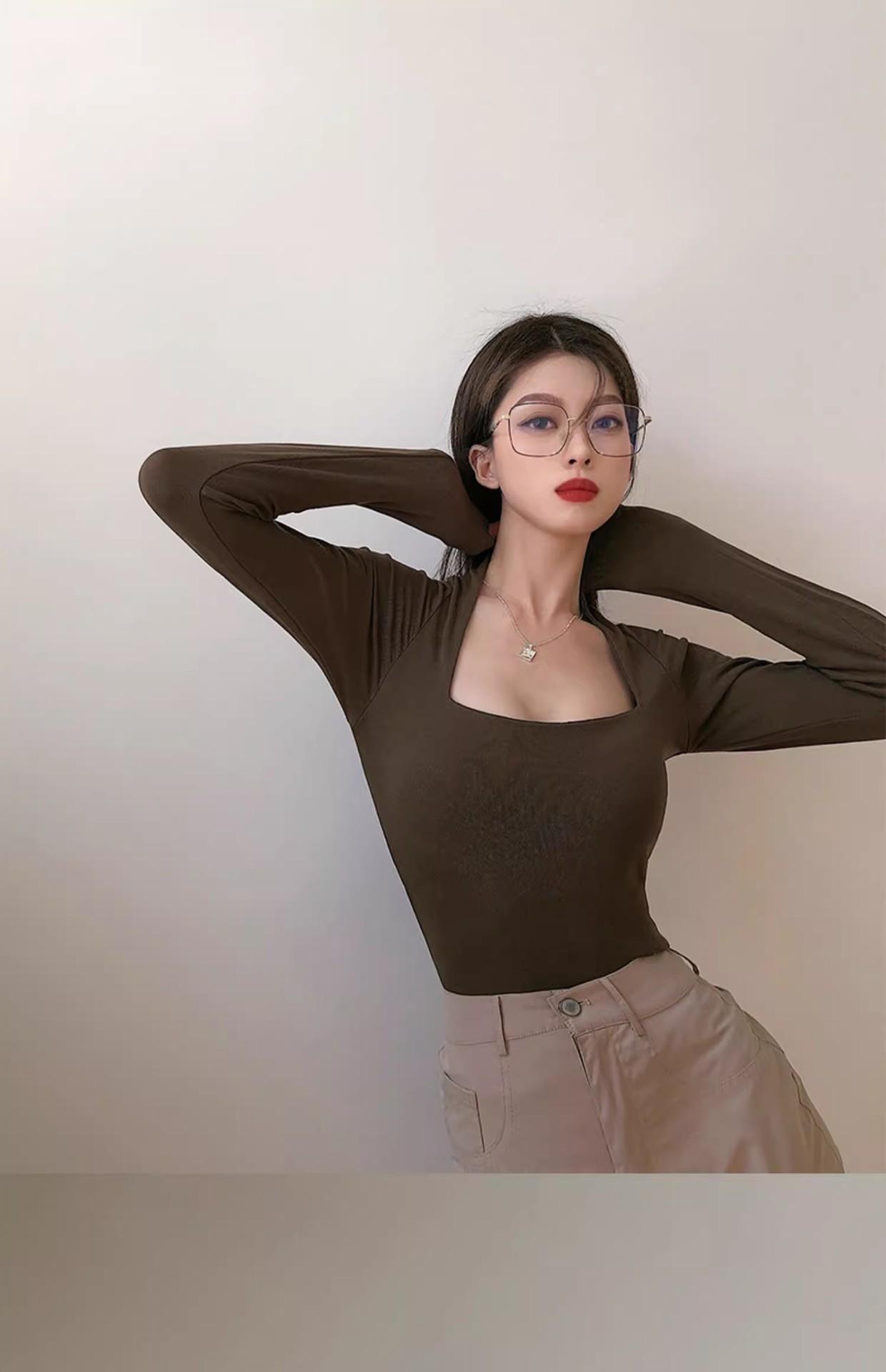 Camiseta básica de manga larga con cuello cuadrado francés de terciopelo acanalado de alta elasticidad, diseño adelgazante Spice Girls Niche Ins Top