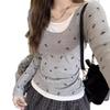Otoño Nuevo Elegante Versátil Nicho Blusa Falsa de Dos Piezas Top Protector Solar Estampado de Lazo Camiseta Fina de Manga Larga para Mujer