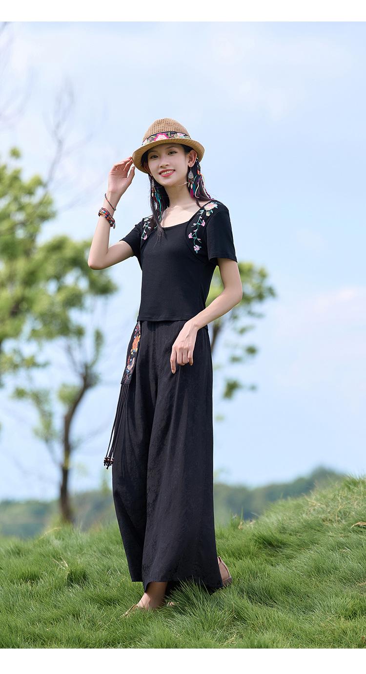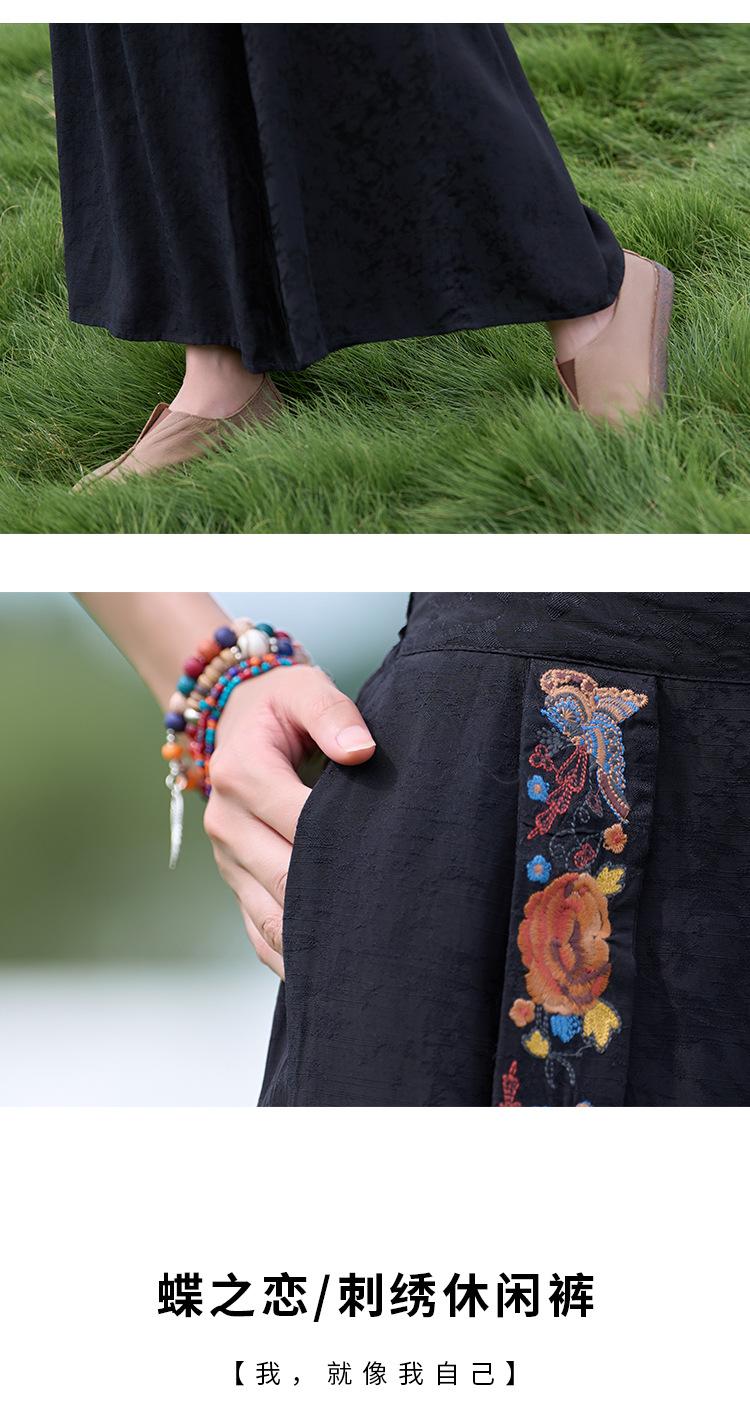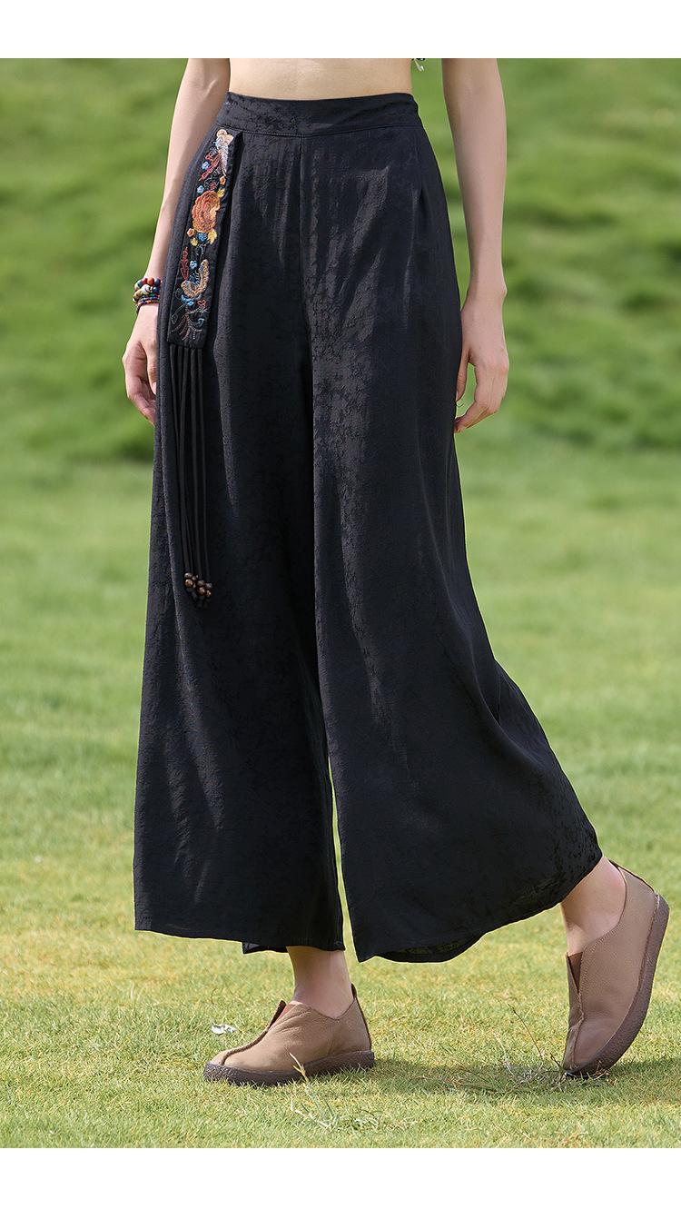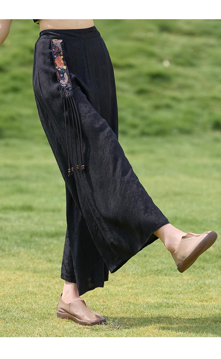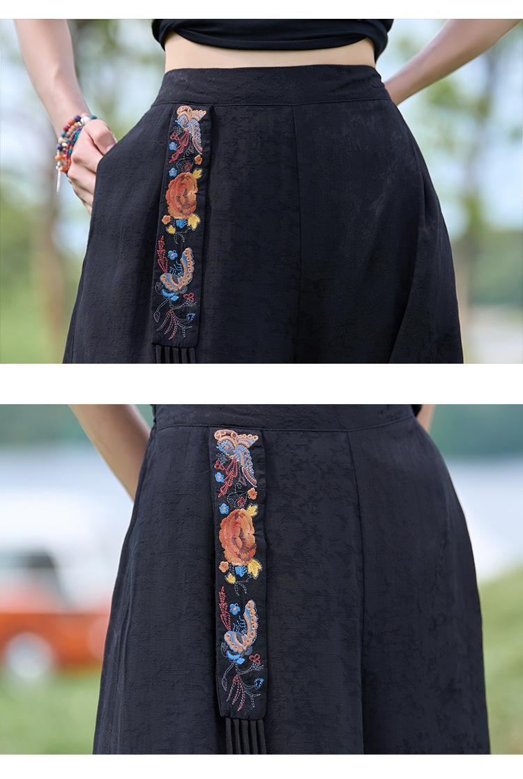 2024 estilo étnico bordado cinta borla pantalones de pierna ancha holgados adelgazantes rectos pantalones pantalones falda negra combinable