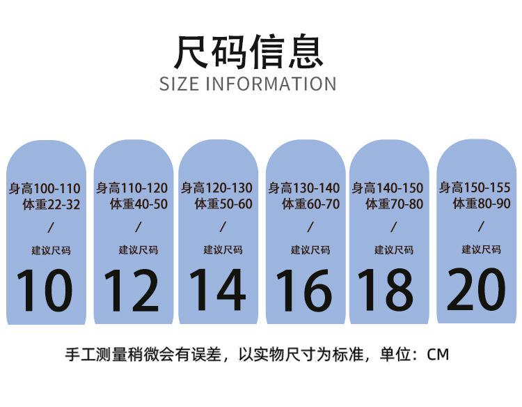 10 size recommended height 100-110cm, 12 size recommended height 110-120cm, 14 yards recommended height 120-13...