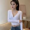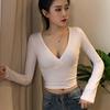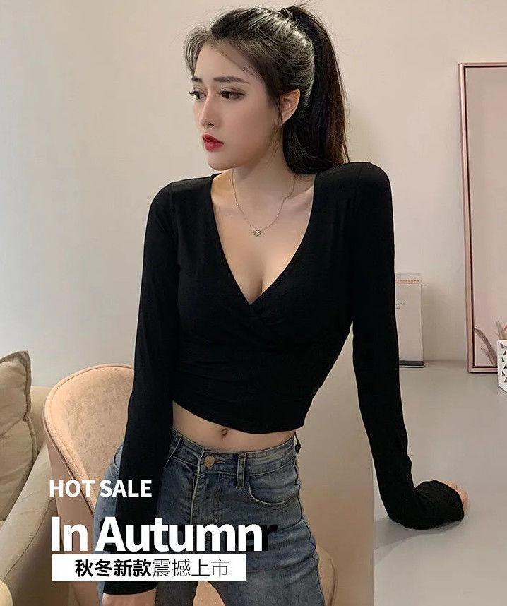 Camiseta básica sexy ajustada de otoño e invierno con escote en V profundo, top de manga larga para mujer, ropa de club nocturno para mujer con corte bajo y ombligo descubierto