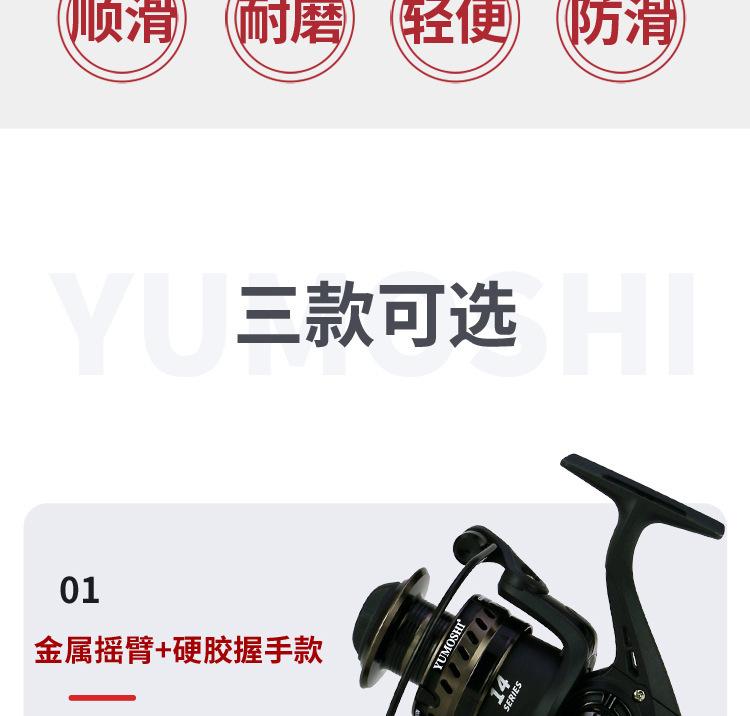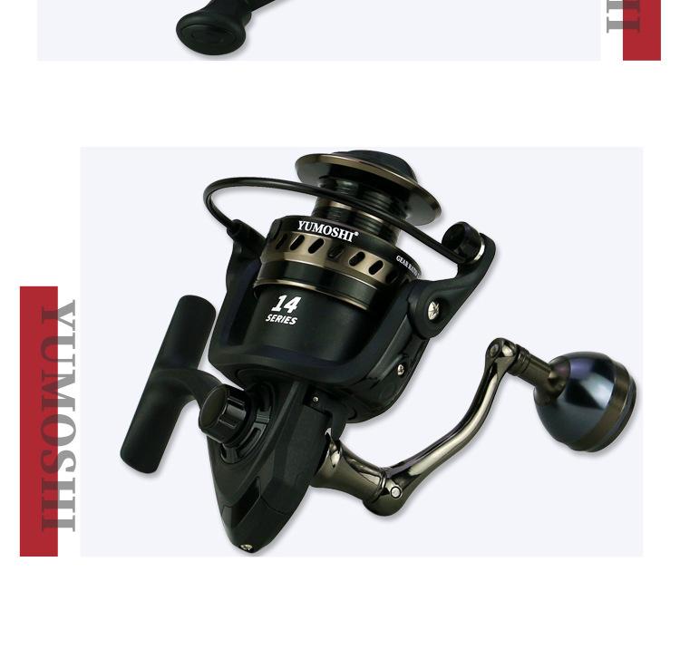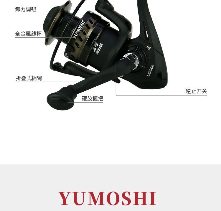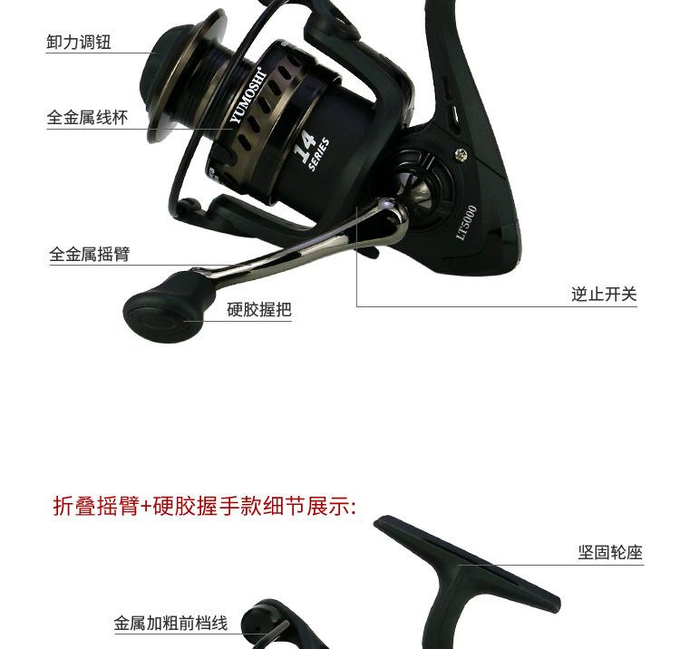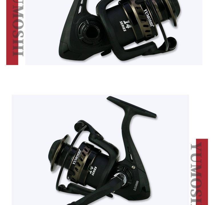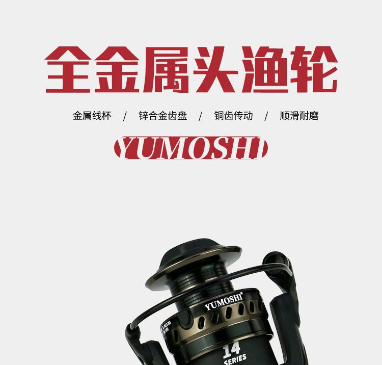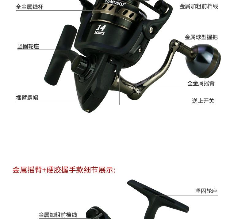 Configuración del modelo 2000-7000 de la marca YUMOSHI: carrete de metal, cuerpo de plástico, configuración de línea de lanzamiento grueso, el balancín se puede intercambiar entre izquierda y derecha, placa de resonancia de metal, placa de engranaje de aleación de zinc, transmisión de varilla de engranaje de cobre.