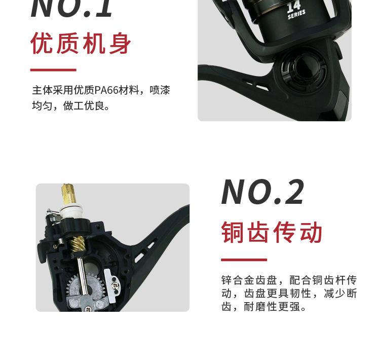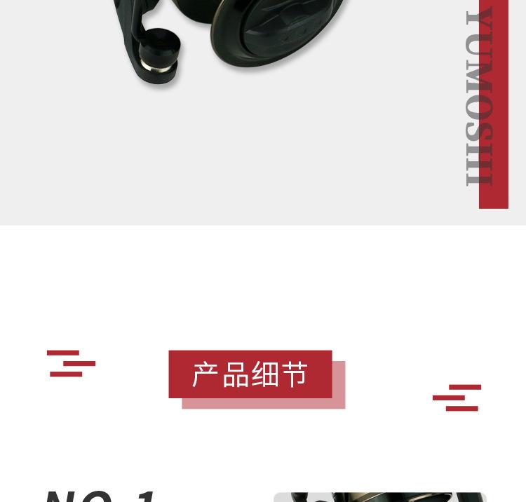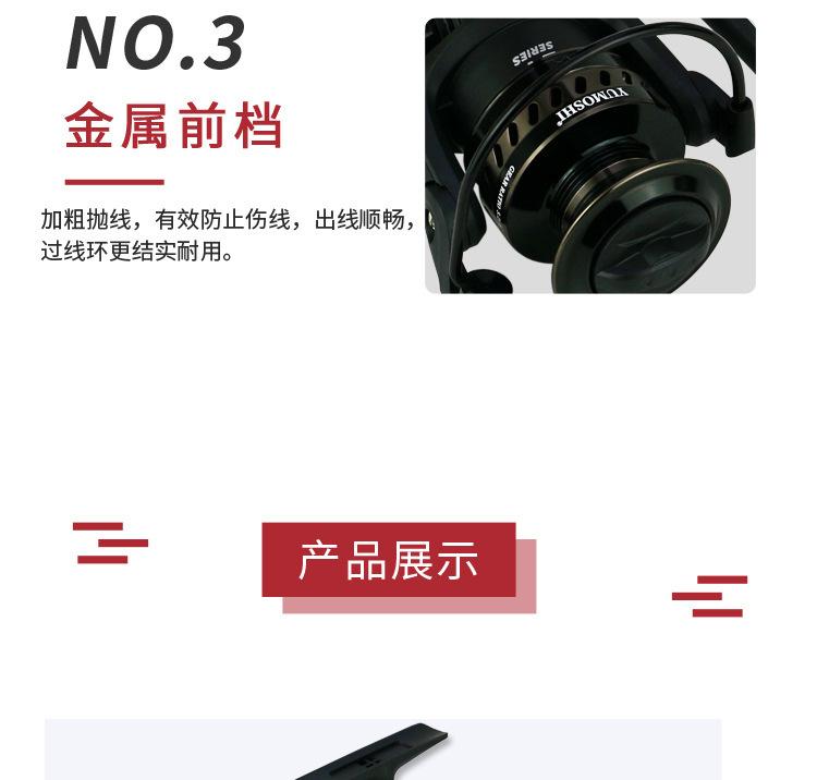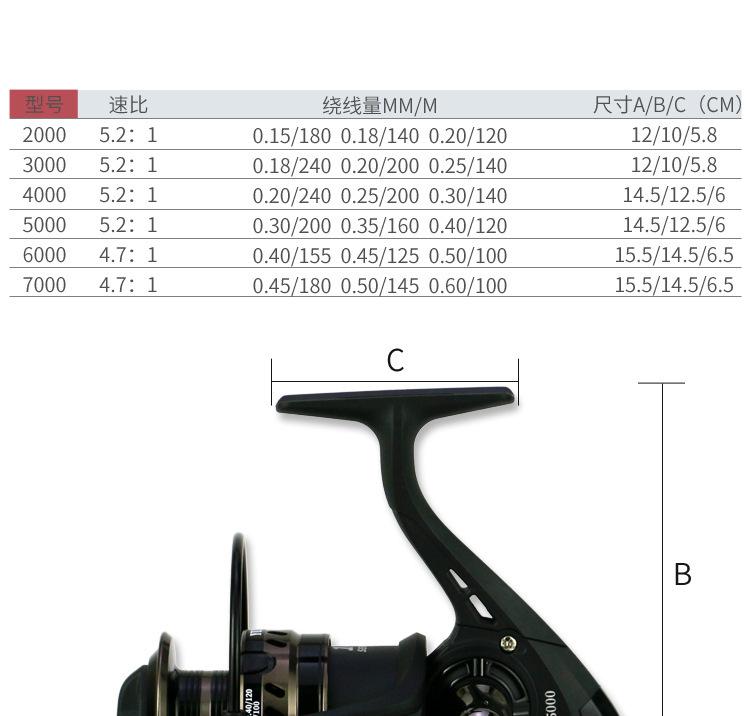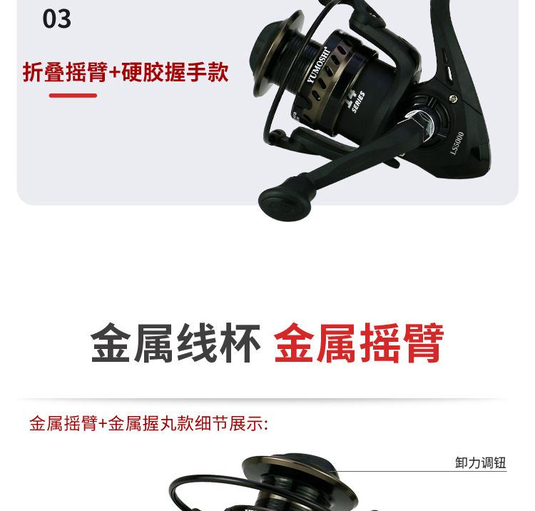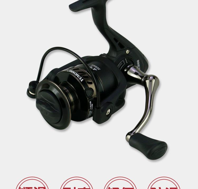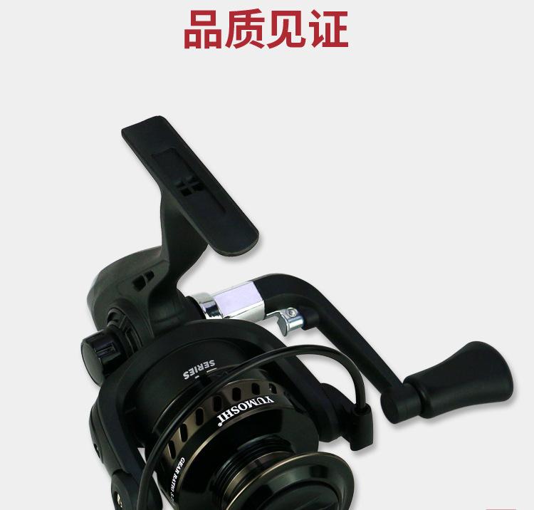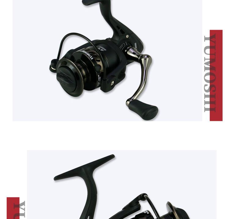 Configuración del modelo 2000-7000 de la marca YUMOSHI: carrete de metal, cuerpo de plástico, configuración de línea de lanzamiento grueso, el balancín se puede intercambiar entre izquierda y derecha, placa de resonancia de metal, placa de engranaje de aleación de zinc, transmisión de varilla de engranaje de cobre.