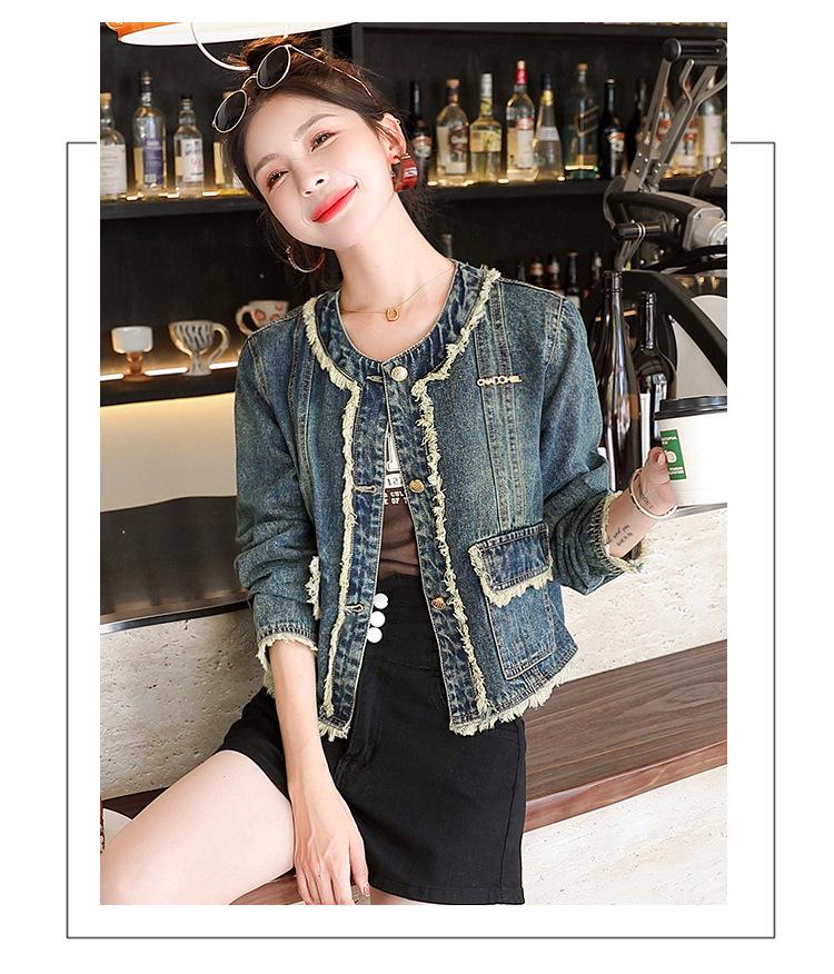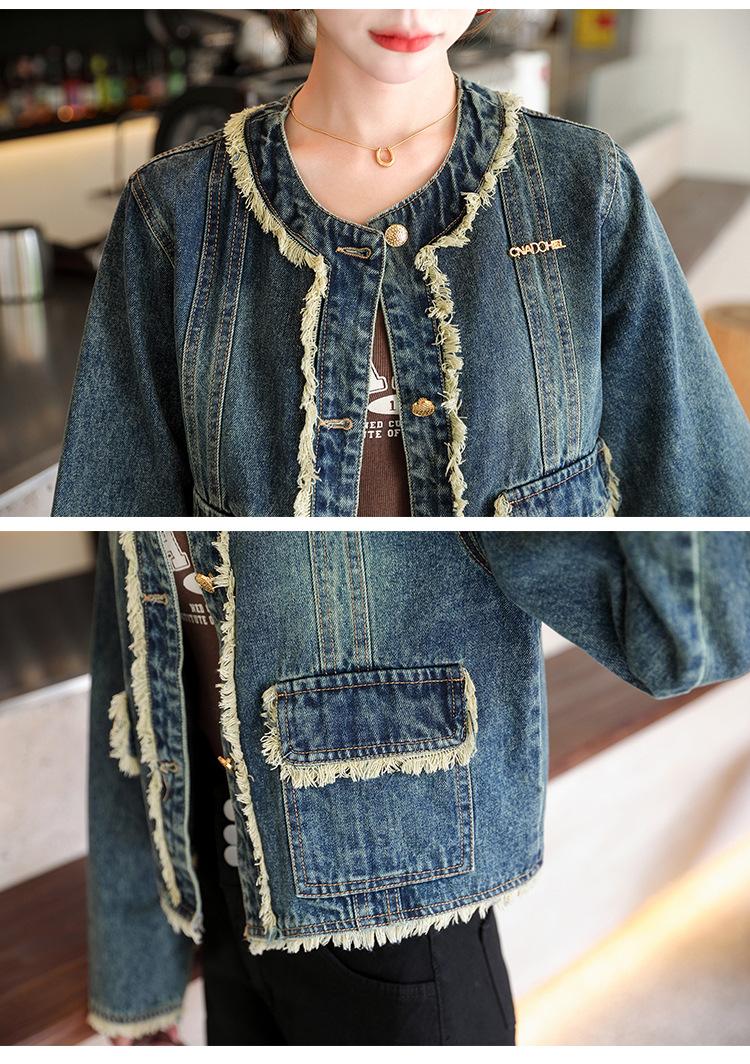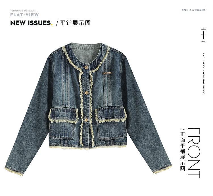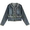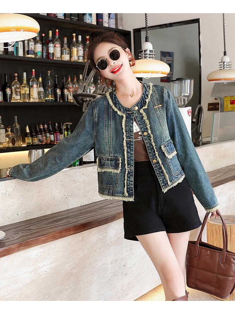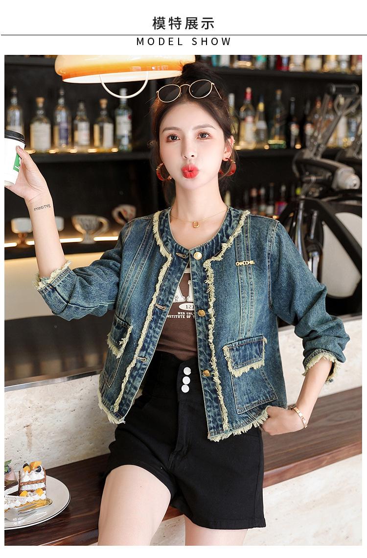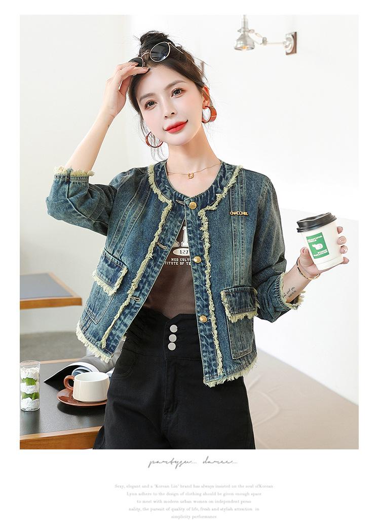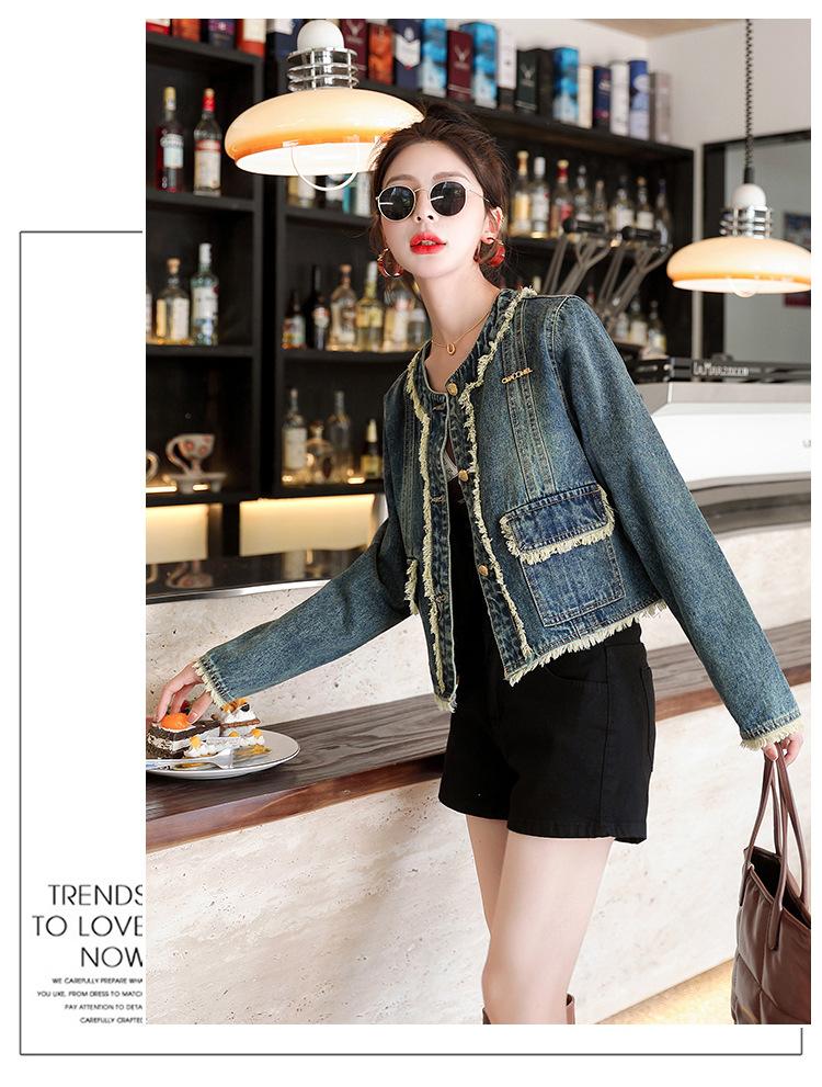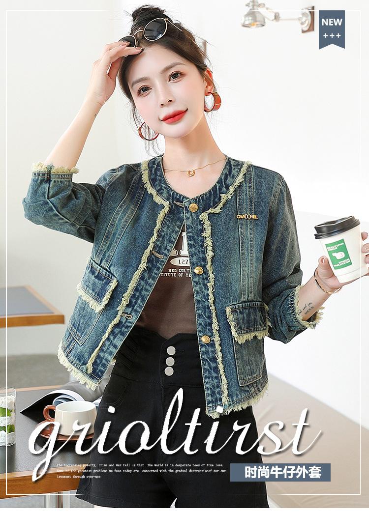 Abrigo corto de mezclilla retro estilo Hong Kong para mujer 2023 Primavera y Otoño Nuevo con flecos deshilachados cuello redondo estilo ropa de trabajo chaqueta top a la moda