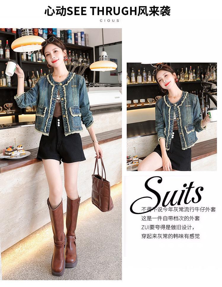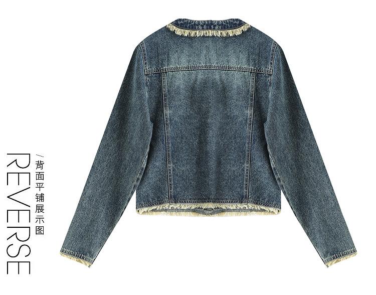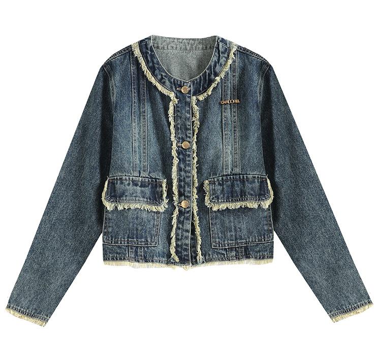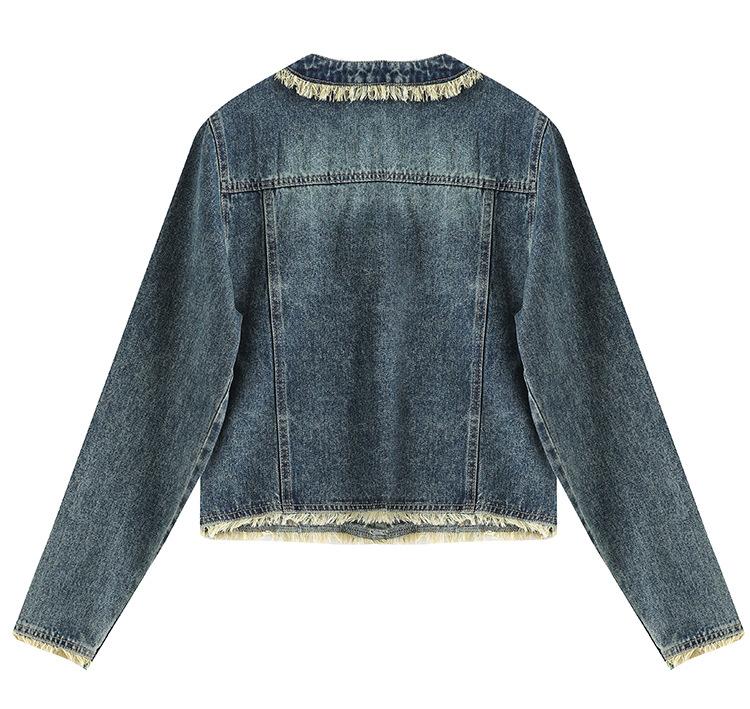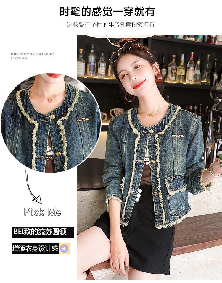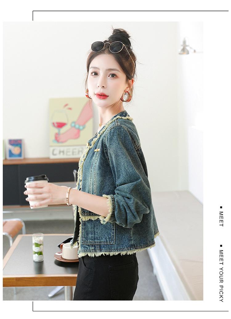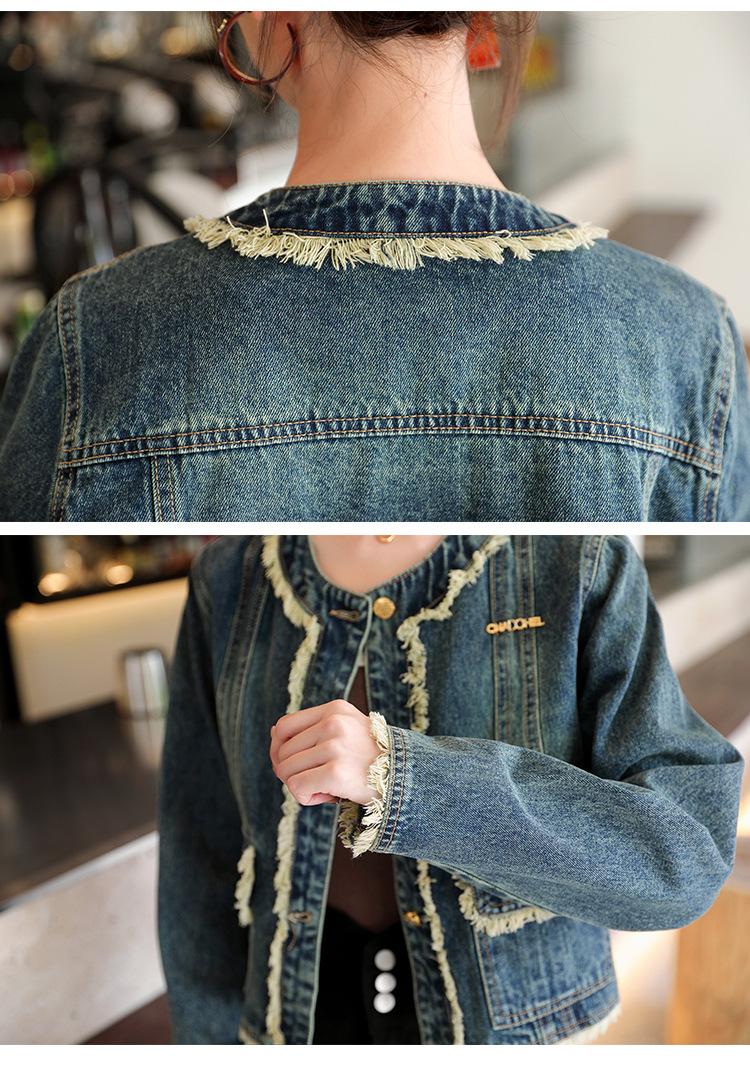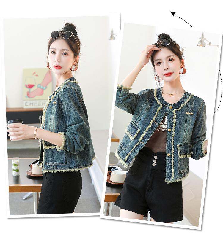 Abrigo corto de mezclilla retro estilo Hong Kong para mujer 2023 Primavera y Otoño Nuevo con flecos deshilachados cuello redondo estilo ropa de trabajo chaqueta top a la moda