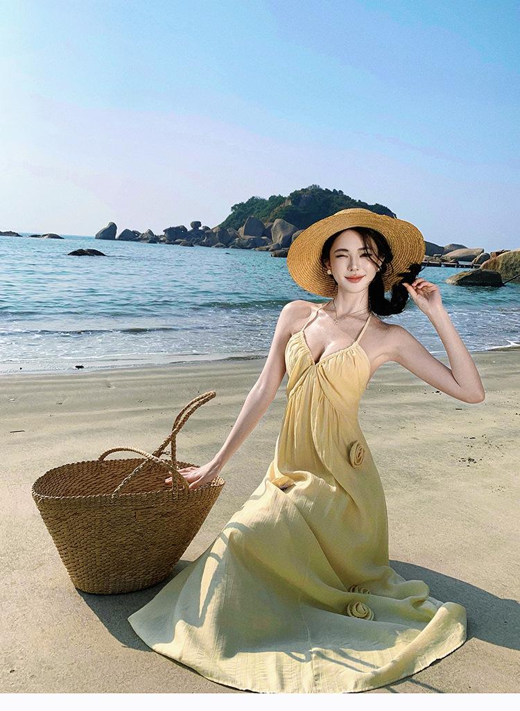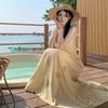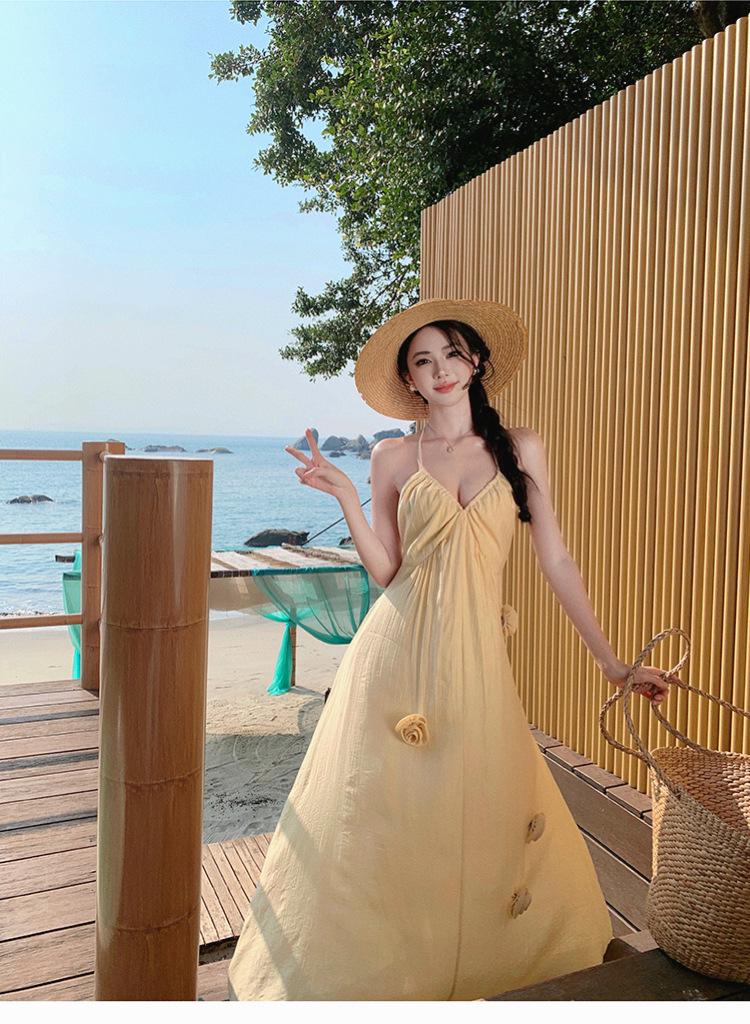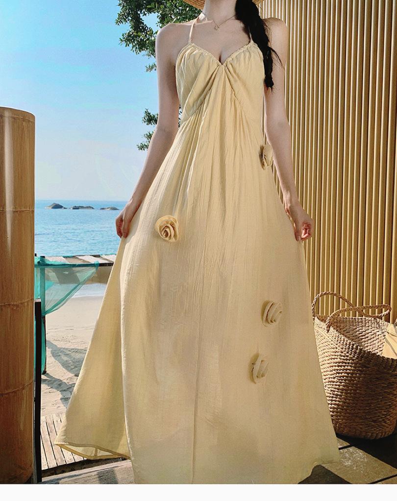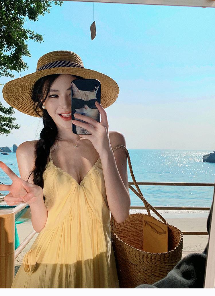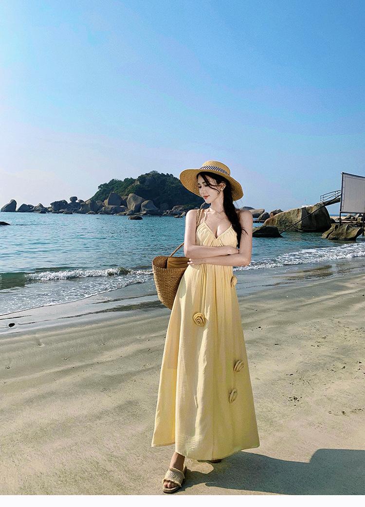 Estilo Suave Hora del Té Cuello en V Francés Flor Estéreo Tirantes Falda Larga Vacaciones en la Playa Vestido Amarillo Super Lindo para Mujer