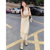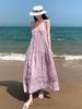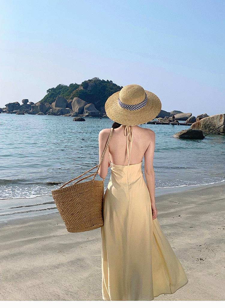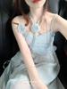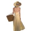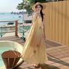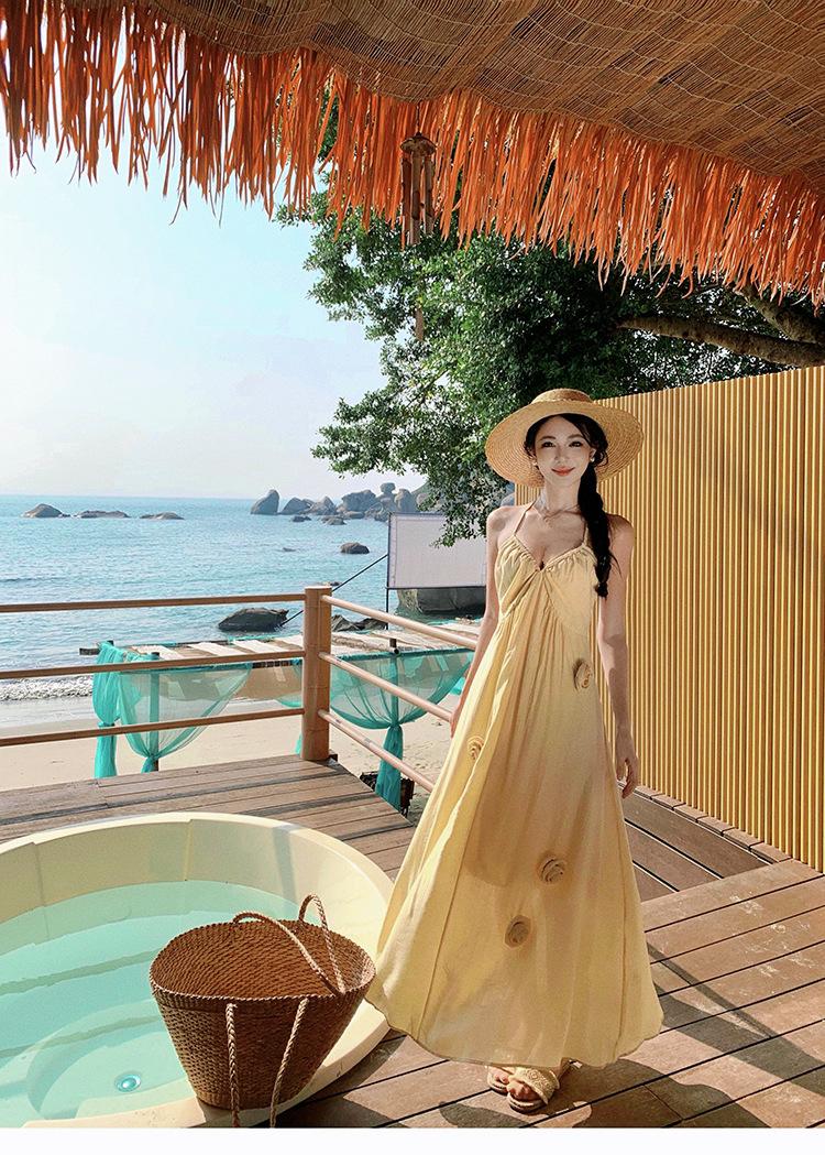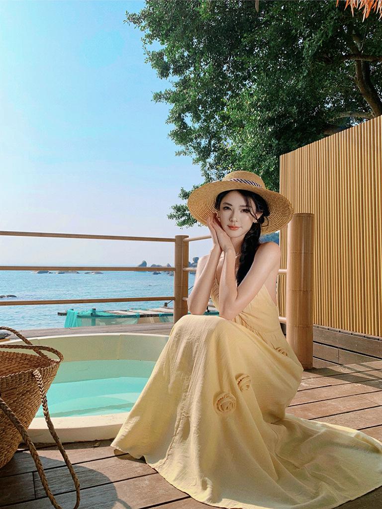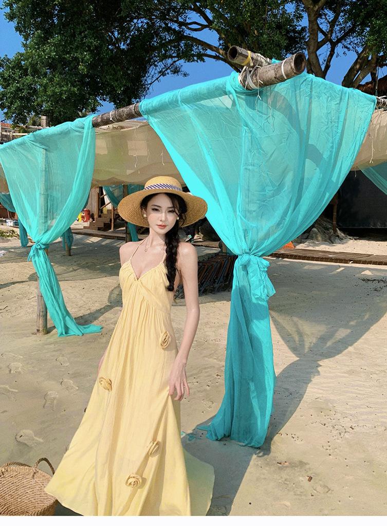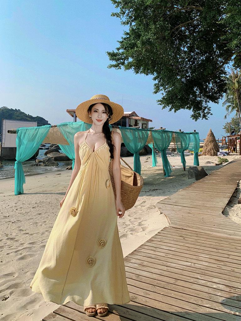 Estilo Suave Hora del Té Cuello en V Francés Flor Estéreo Tirantes Falda Larga Vacaciones en la Playa Vestido Amarillo Super Lindo para Mujer