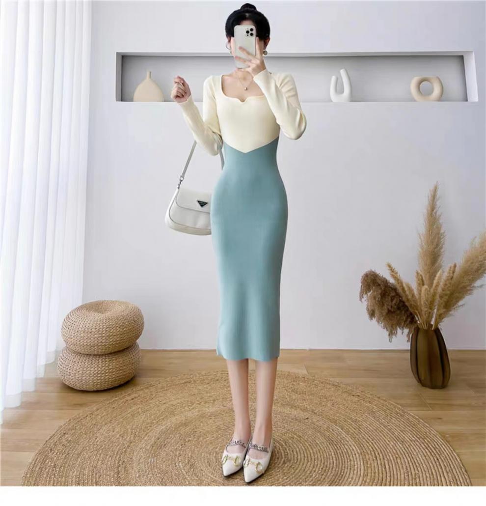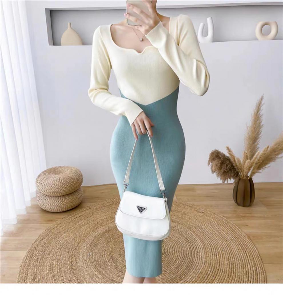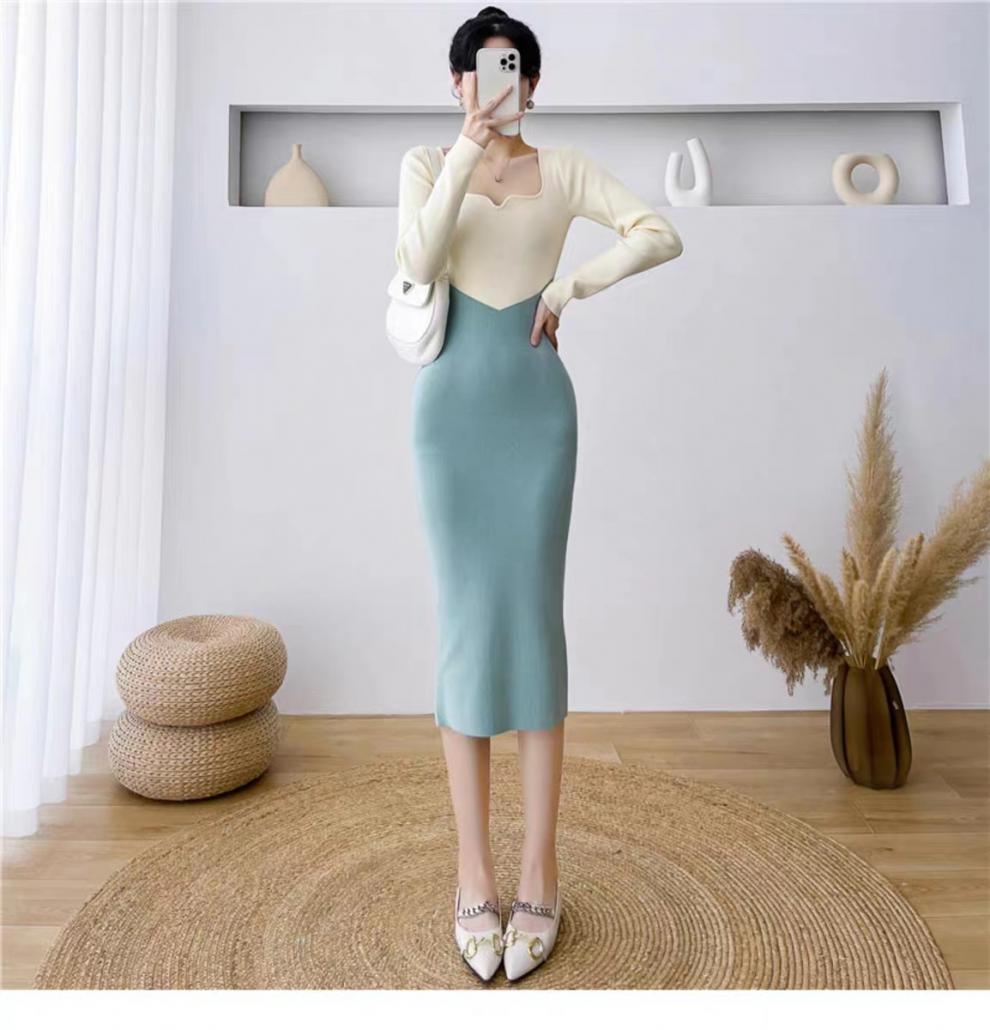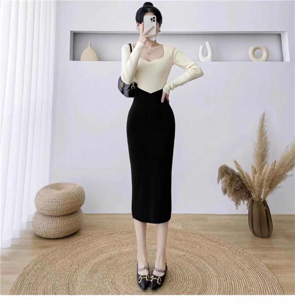 Vestido de punto empalmado de manga larga para mujer, otoño e invierno 2024, nuevo estilo francés, falda de diseño de nicho de alta gama.
