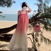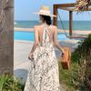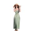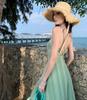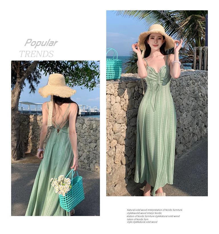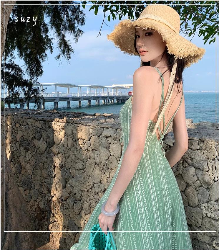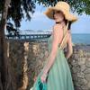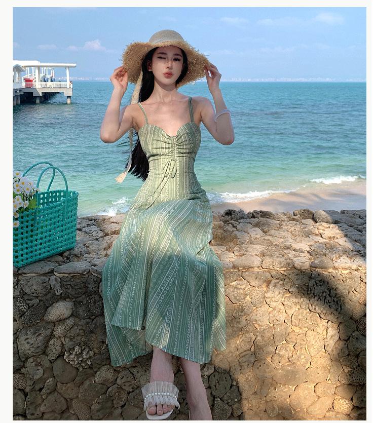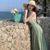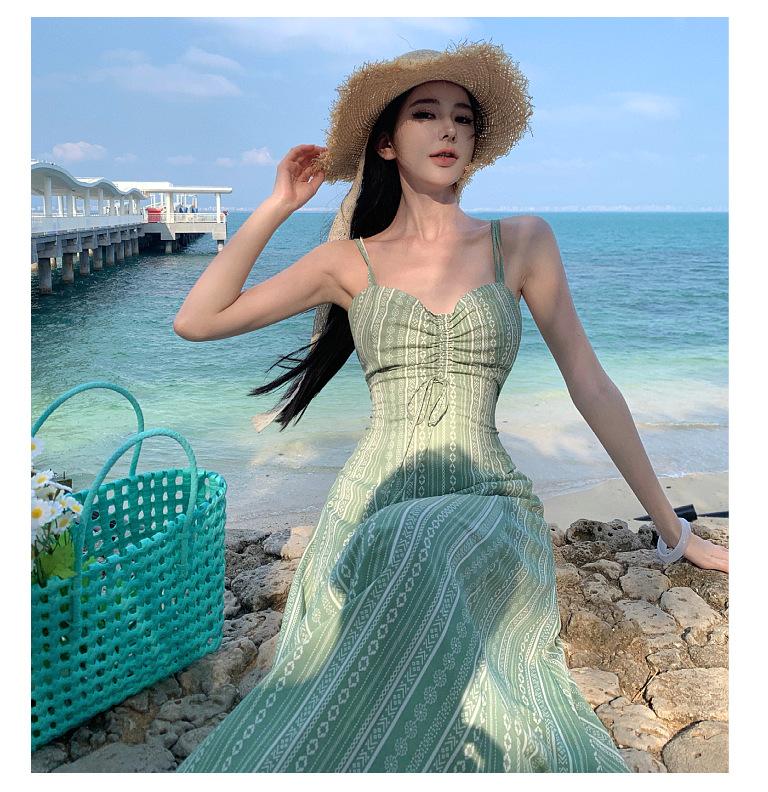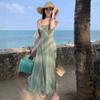 Vestido de tirantes con estampado verde claro nuevo de estilo coreano de alta calidad, vestido de espalda súper ajustada para vacaciones en la costa de Yunnan