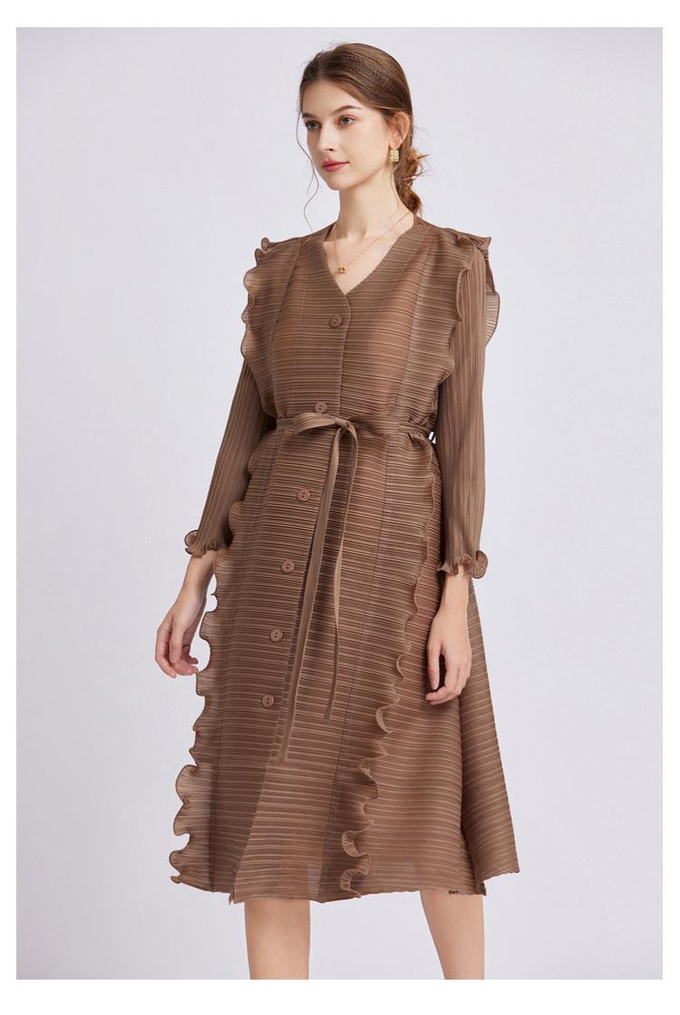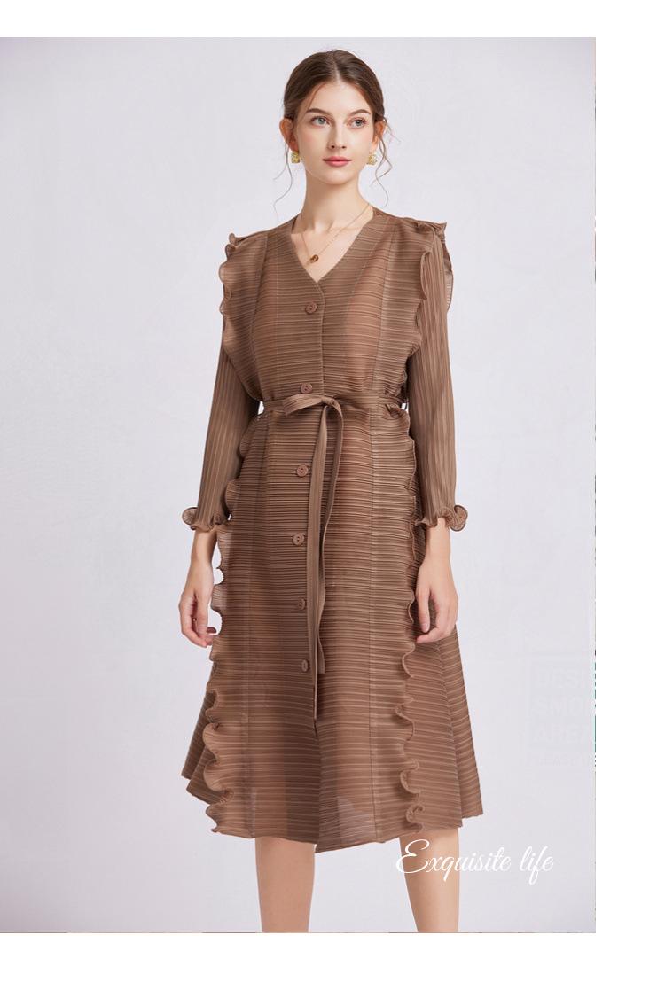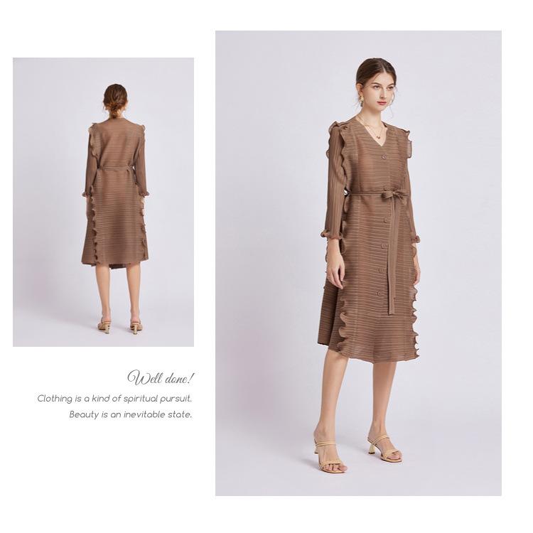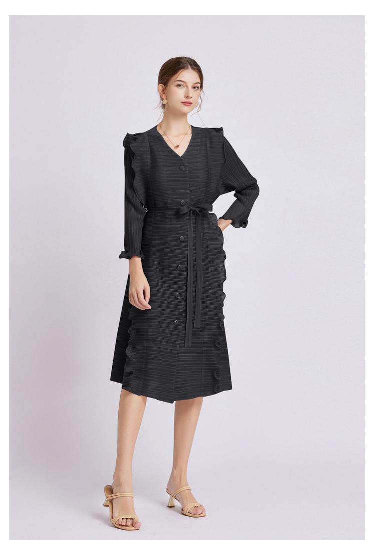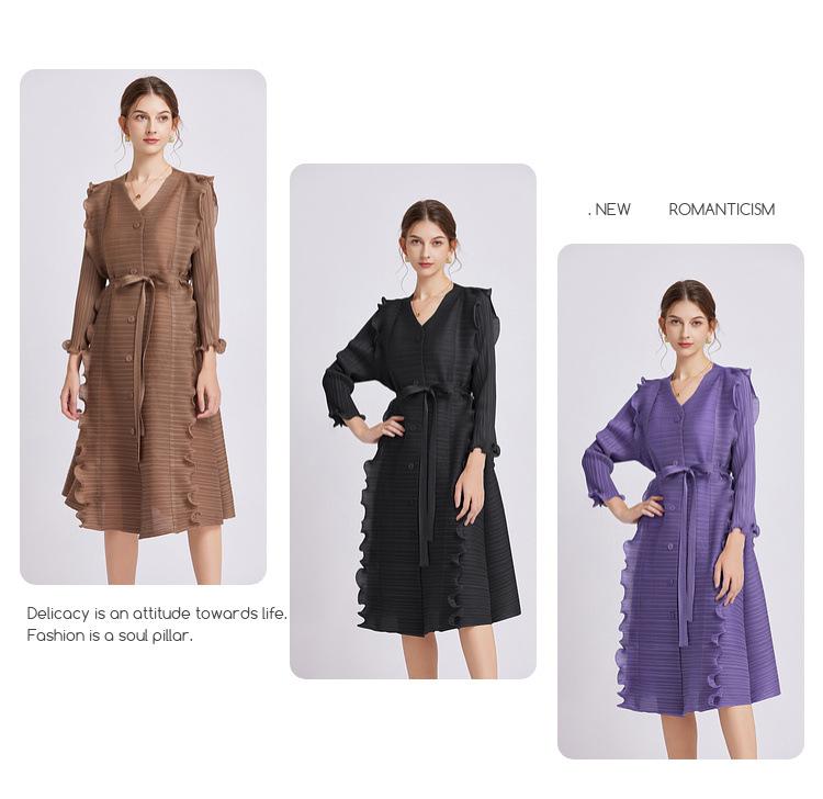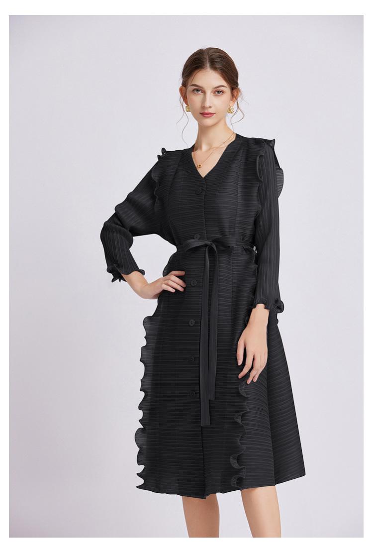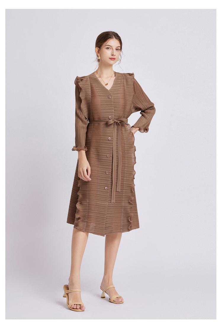 Vestido Sanzhai para mujer otoño 2023 nuevo versátil color sólido elegante para ir al trabajo cuello en V con volantes encaje con cordones en la cintura