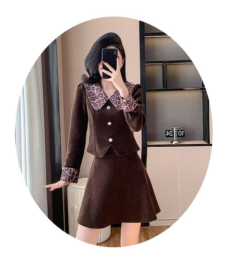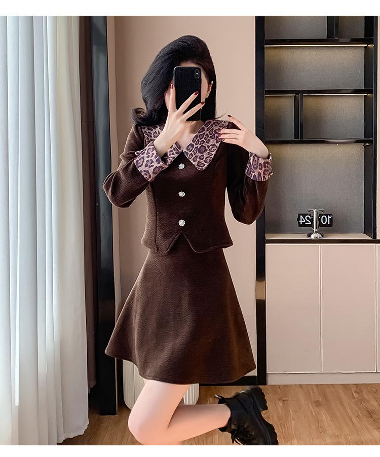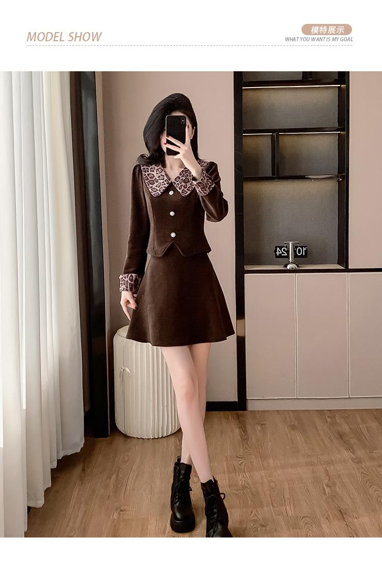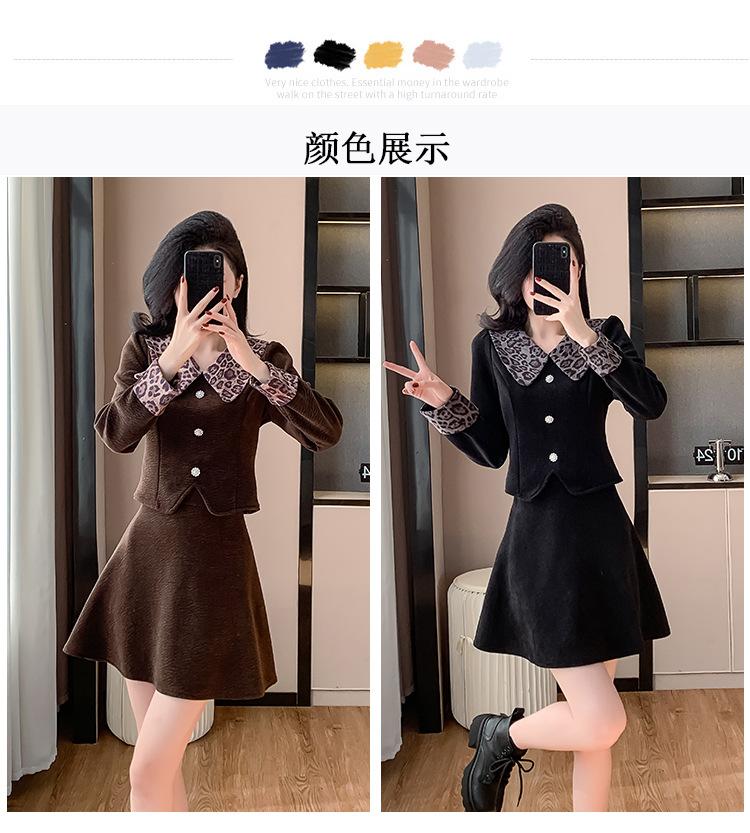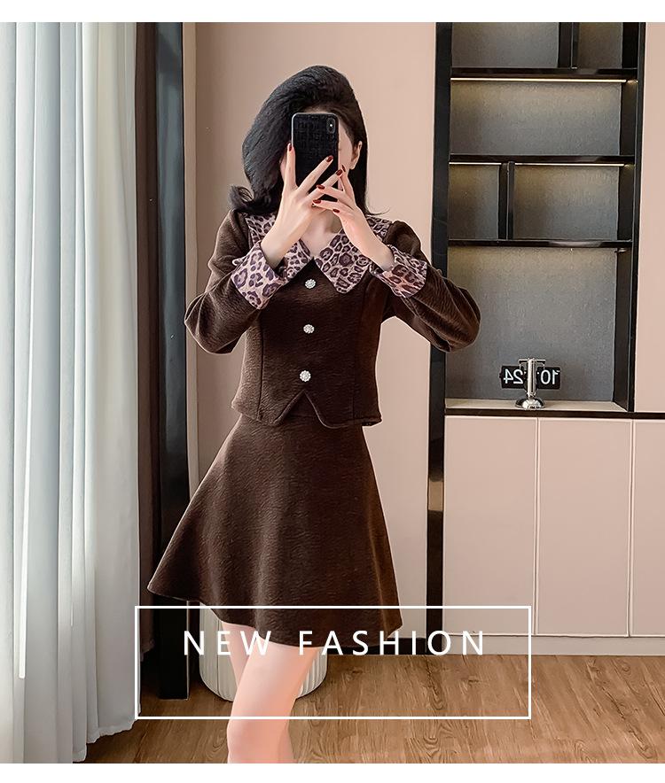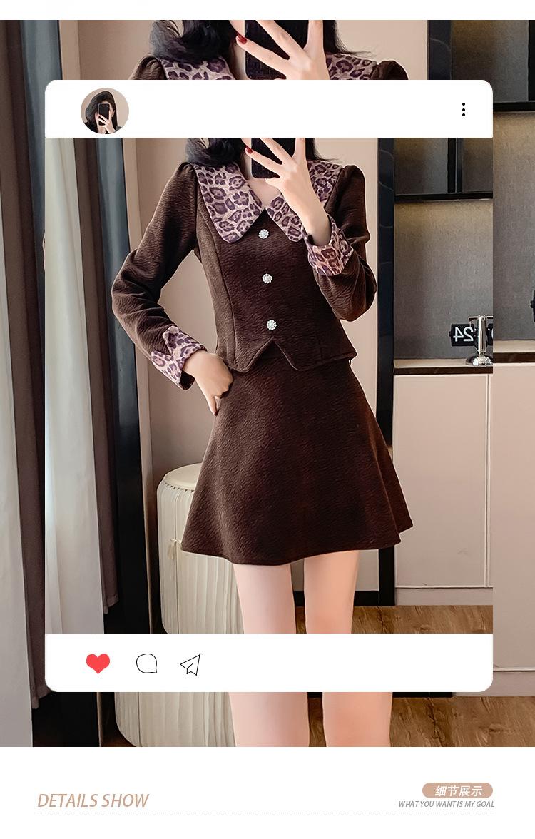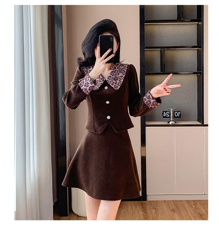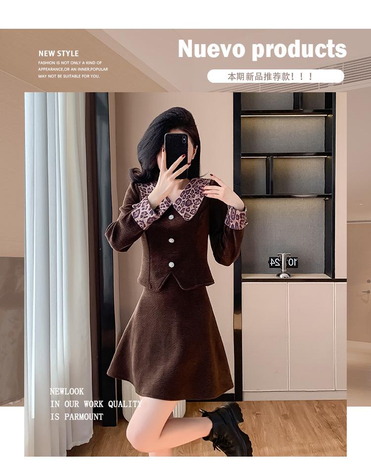 Fotografía real de la nueva moda de otoño e invierno de 2025 con estampado de leopardo antiedad y costuras. Falda corta de traje de dos piezas pequeña.