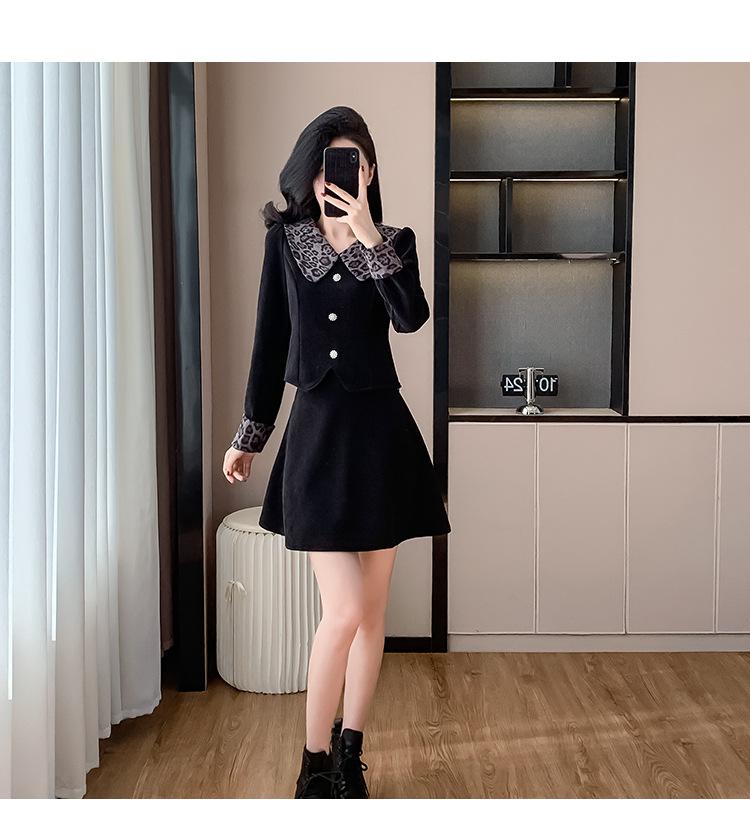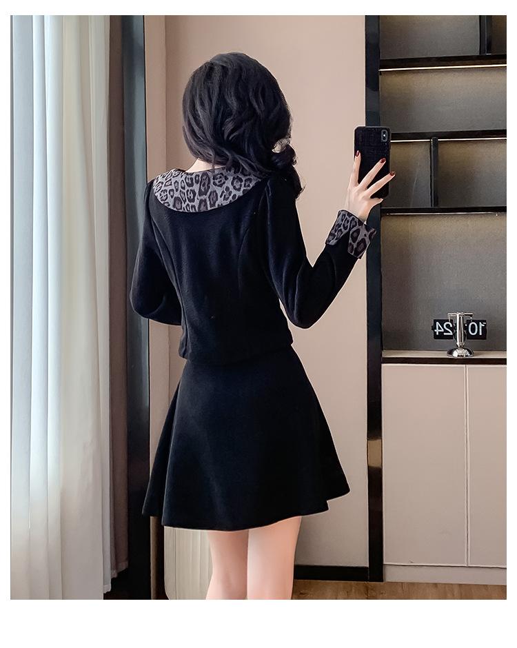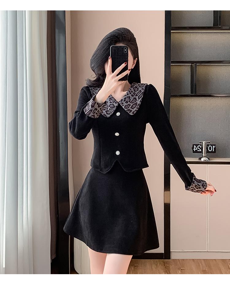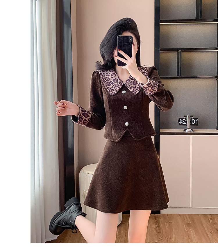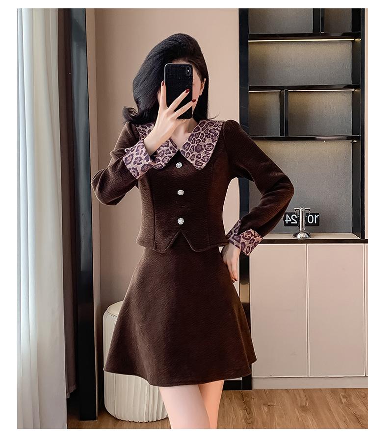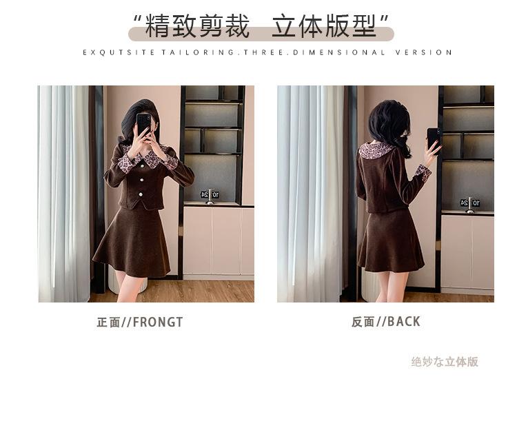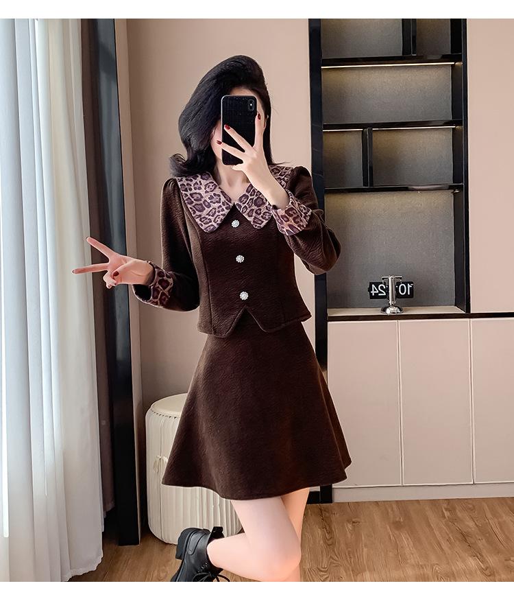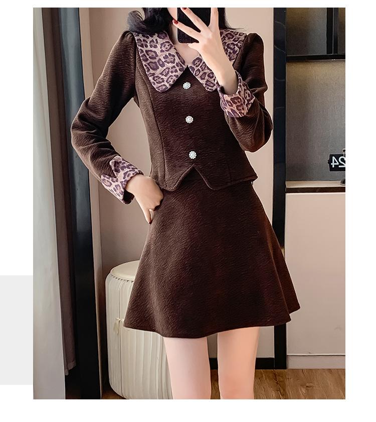 Fotografía real de la nueva moda de otoño e invierno de 2025 con estampado de leopardo antiedad y costuras. Falda corta de traje de dos piezas pequeña.