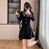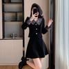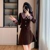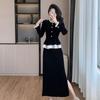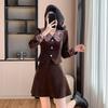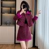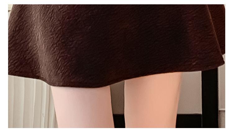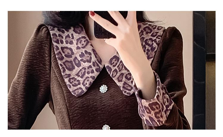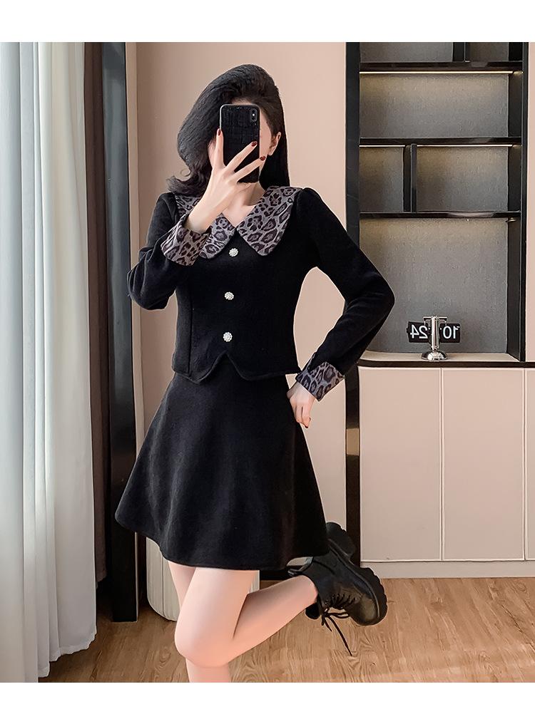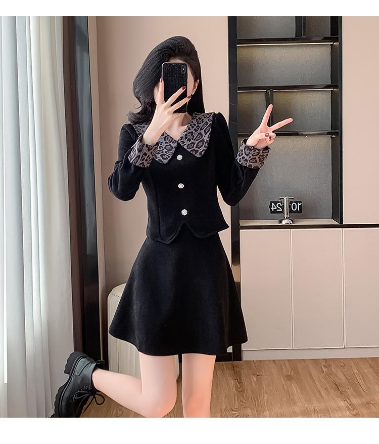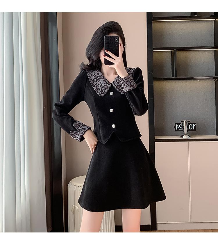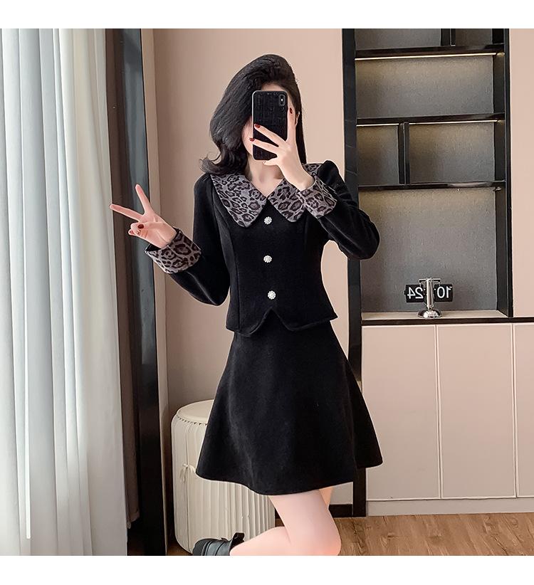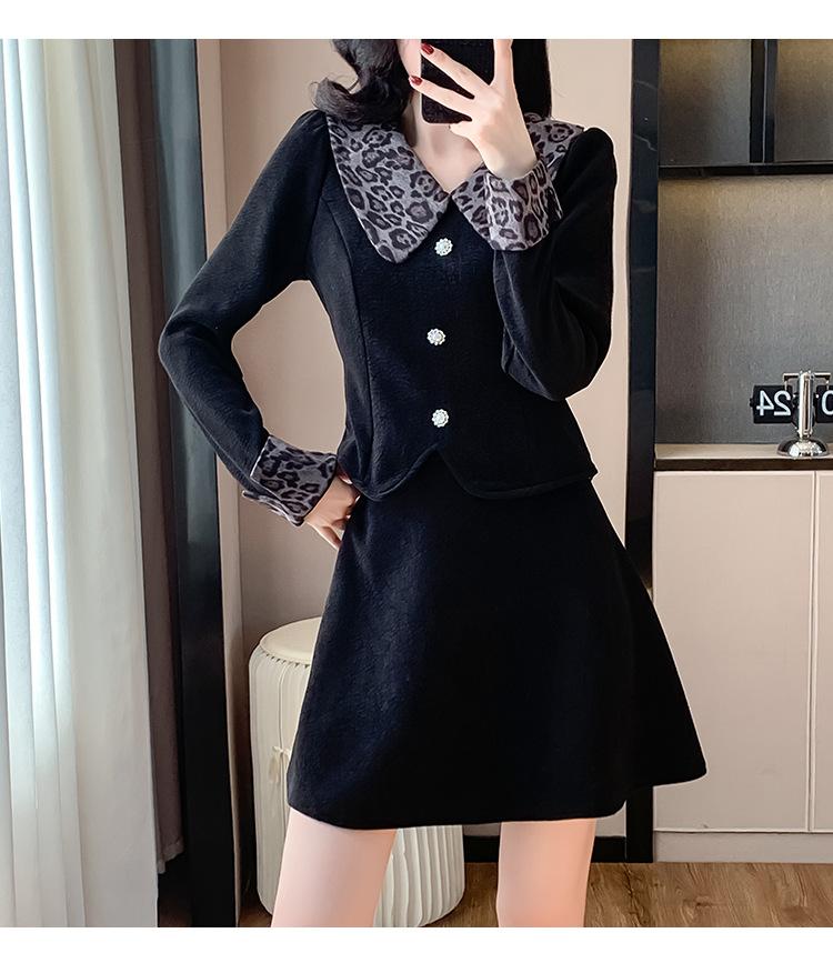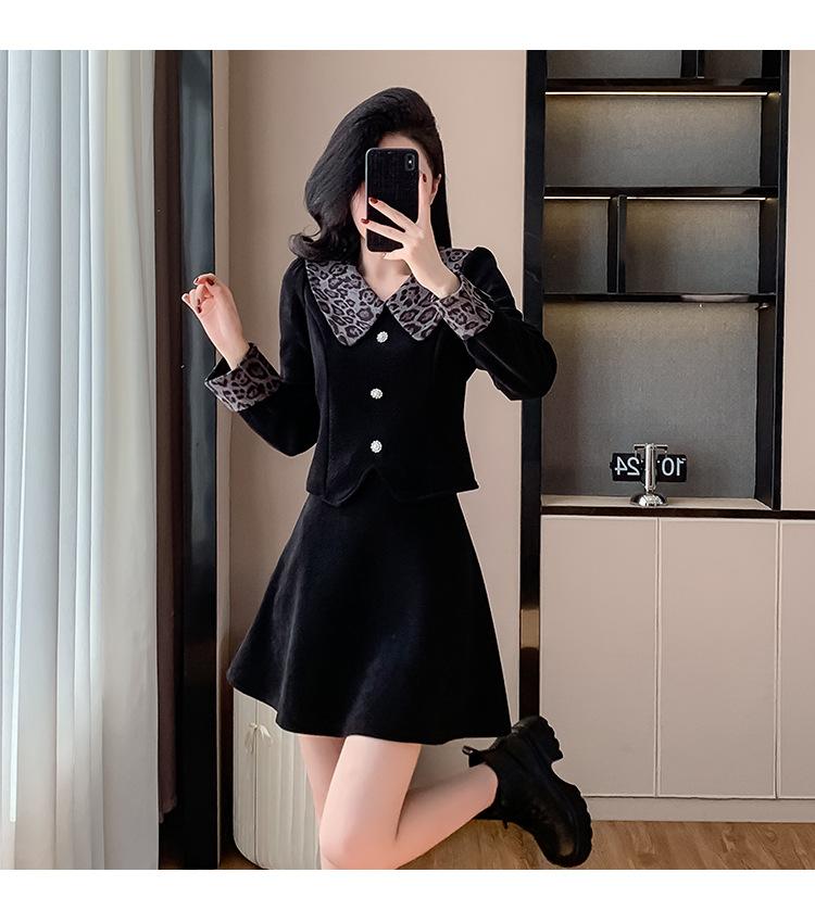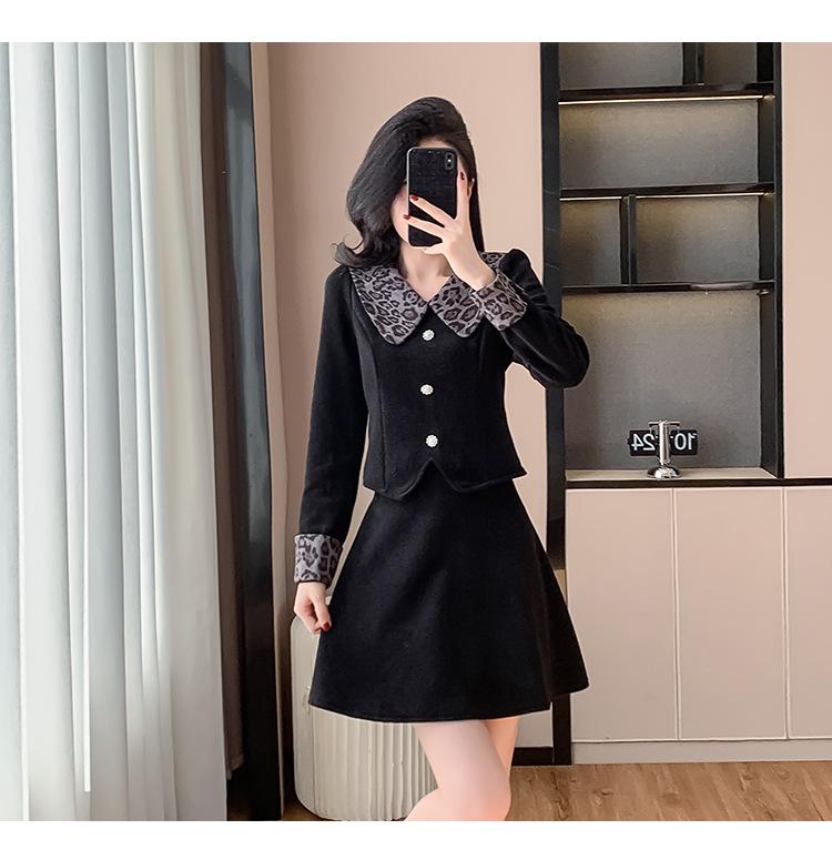 Fotografía real de la nueva moda de otoño e invierno de 2025 con estampado de leopardo antiedad y costuras. Falda corta de traje de dos piezas pequeña.