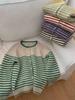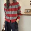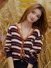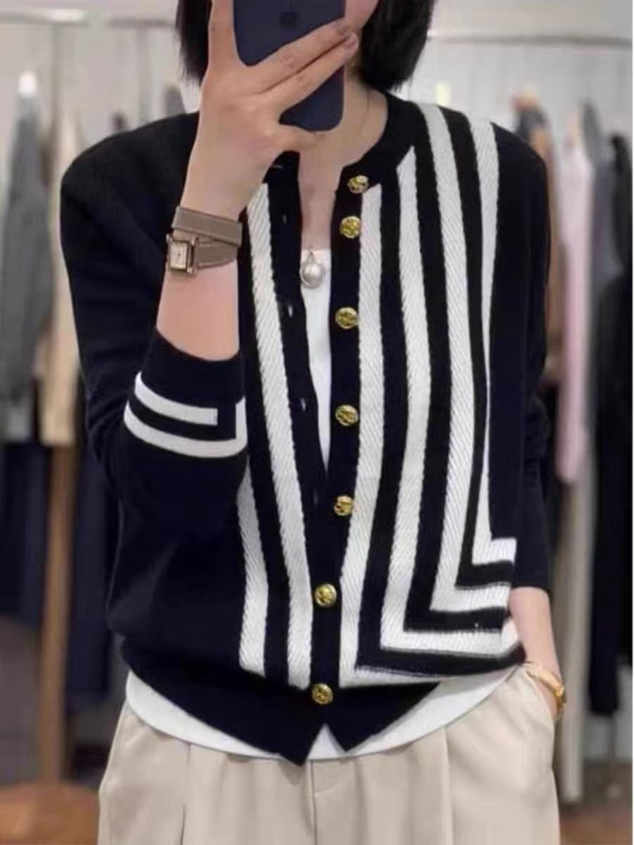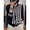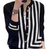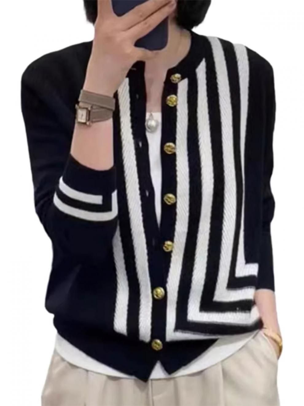Suéter de Punto de Bloques de Color a Rayas de Estilo Europeo para Mujer, Nuevo Otoño Temprano 2025 Cárdigan Único de Cuello Redondo Chaqueta Corta Top